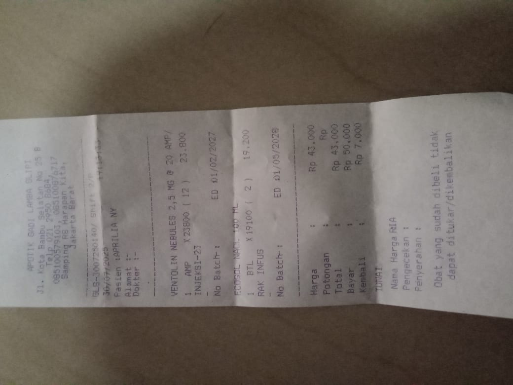 Dana digunakan untuk 1. Pampers baby happy Rp80.000 × 3ball = Rp240.000 2. Susu gain optigrow Rp110.000 ×3 dus = Rp330.000 3. Obat yang tidak di tanggung BPJS Rp430.000 4. Biaya akomodasi di jakarta Rp1.000.0002025-07-24 09:16:20