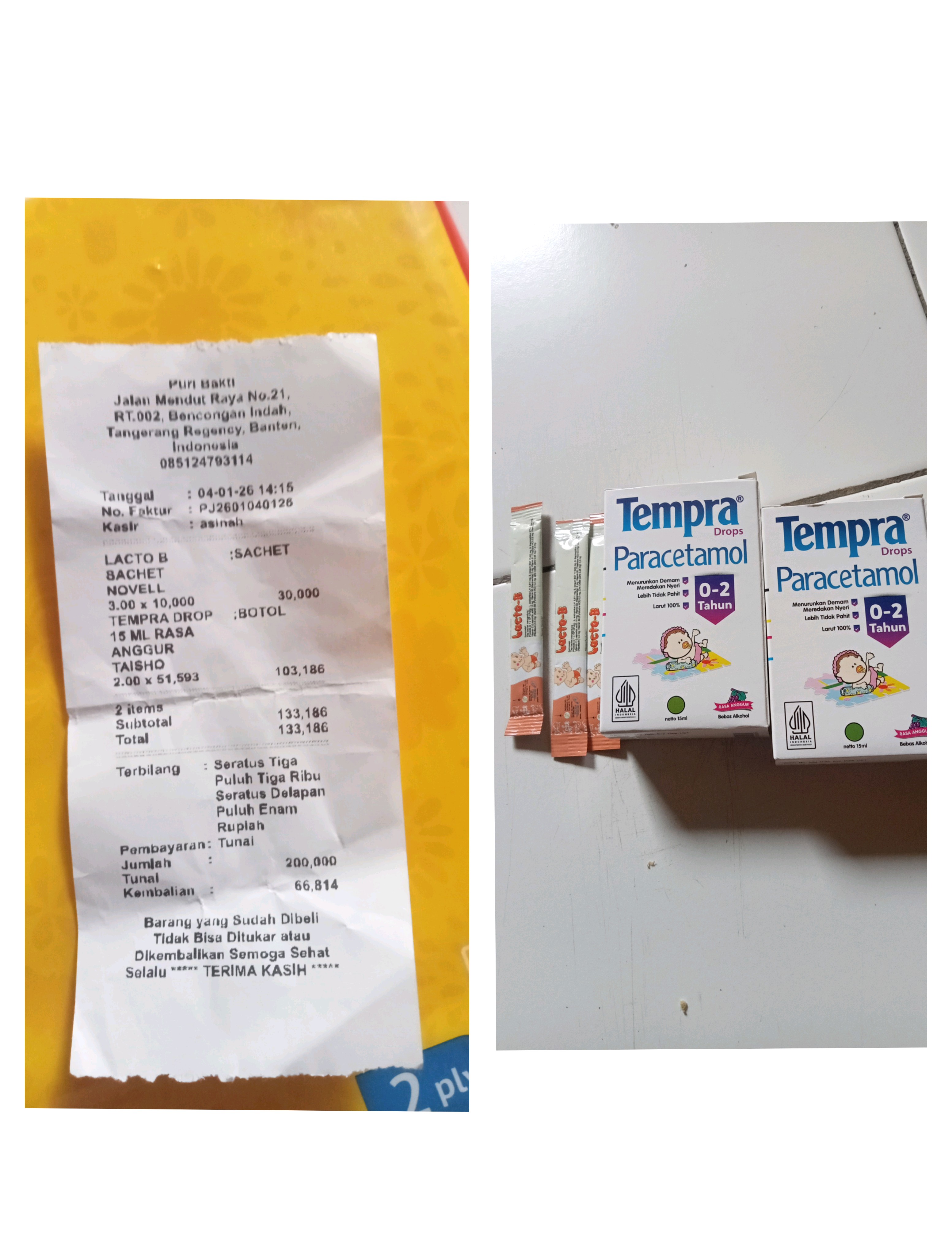 Dana digunakan untuk 1. Tempra Rp45.000 x 2= Rp90.000 2. Vitamin Madu Rp70.0002025-11-18 10:26:17