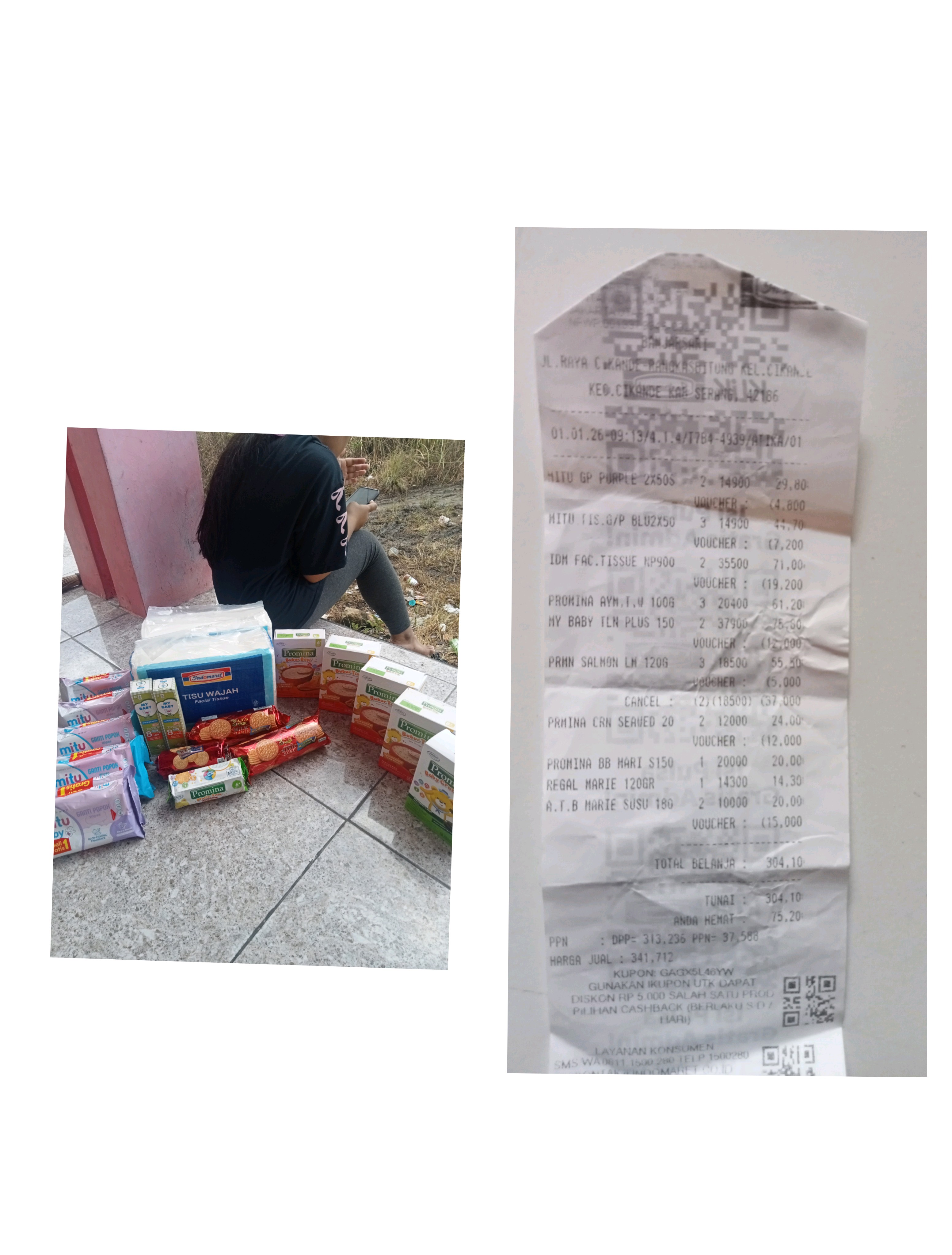 Dana digunakan untuk 1. Tisue basah Rp15.000 x 5 =Rp75.000 2. Tisue kering Rp45.000 x 3 = Rp135.000 3. Biskuit bayi Rp15.000 x 5 = Rp75.000 4. Bubur bayi promina Rp25.000 x 5 = Rp125.000 5. Salep ruam popok Rp65.000 x 2 = Rp130.000 6. Obat tempra/obat demam Rp47.000 x 2 = Rp94.0002026-01-05 09:25:11
