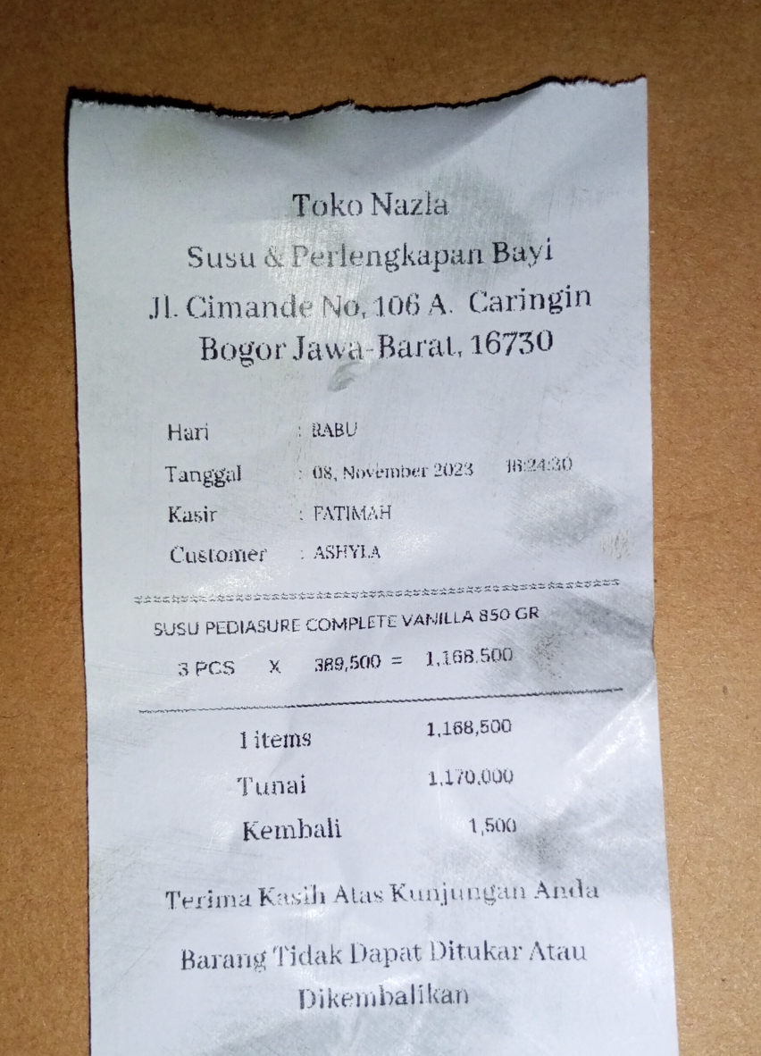 Dana digunakan untuk biaya penggantian pembelian Susu Pediasure Complete 850 gr sebanyak 3 kaleng pada tanggal 8 November 2023 sebesar Rp1.168.500.2023-12-14 18:23:59