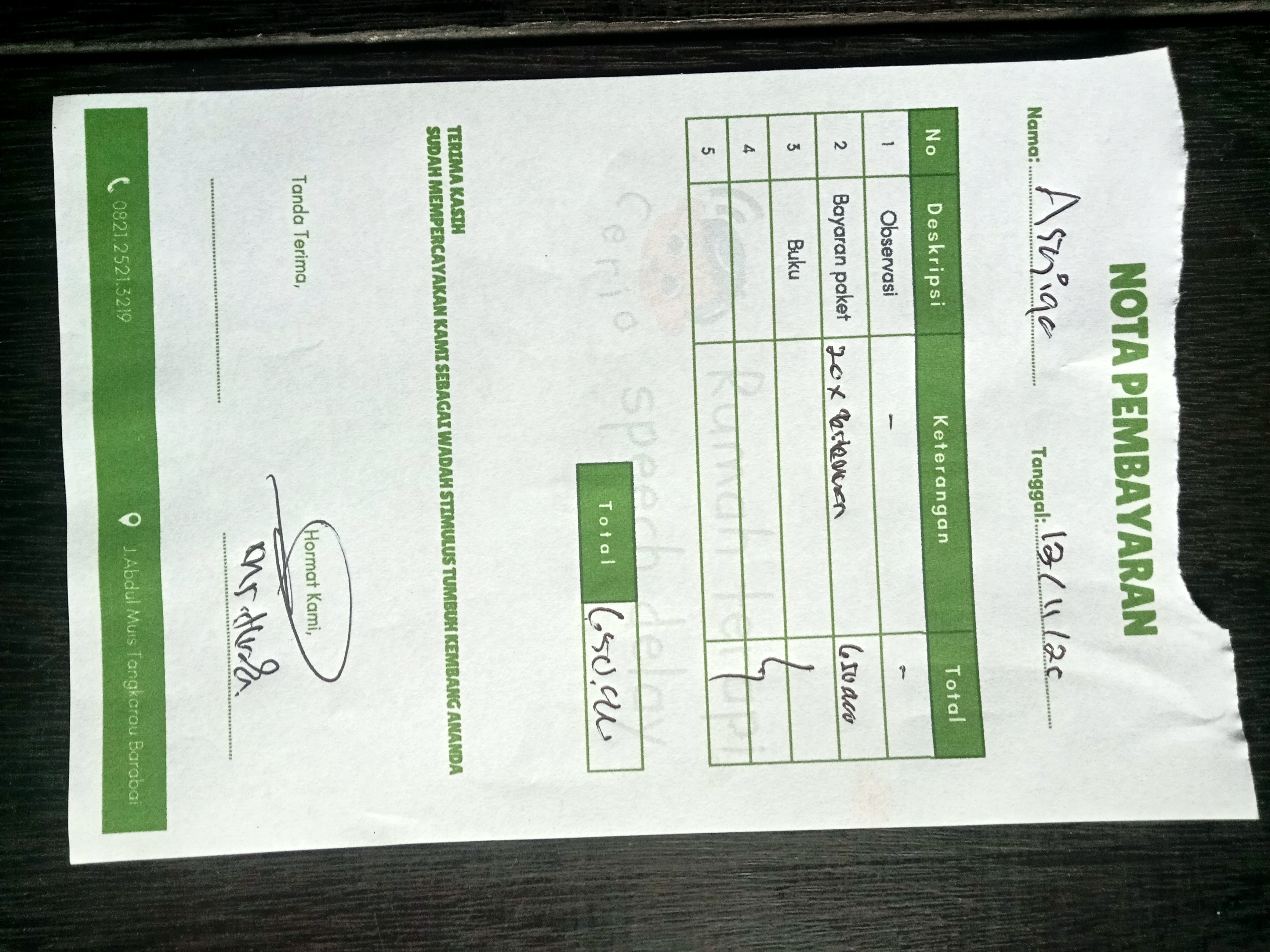 Dana yang kami terima telah digunakan untuk pembayaran terapi speech delay sebesar Rp 650.000.