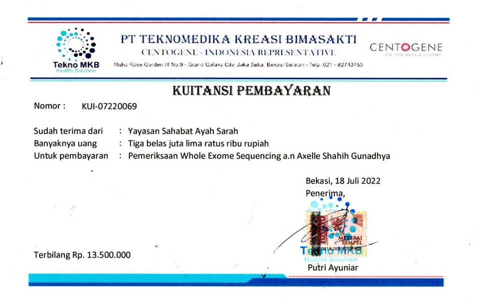 Bantuan dari TemanBaik sudah kami sampaikan dan telah diterima oleh Axelle dan orang tuanya untuk melakukan pembayaran pemeriksaan genetik ke jerman.