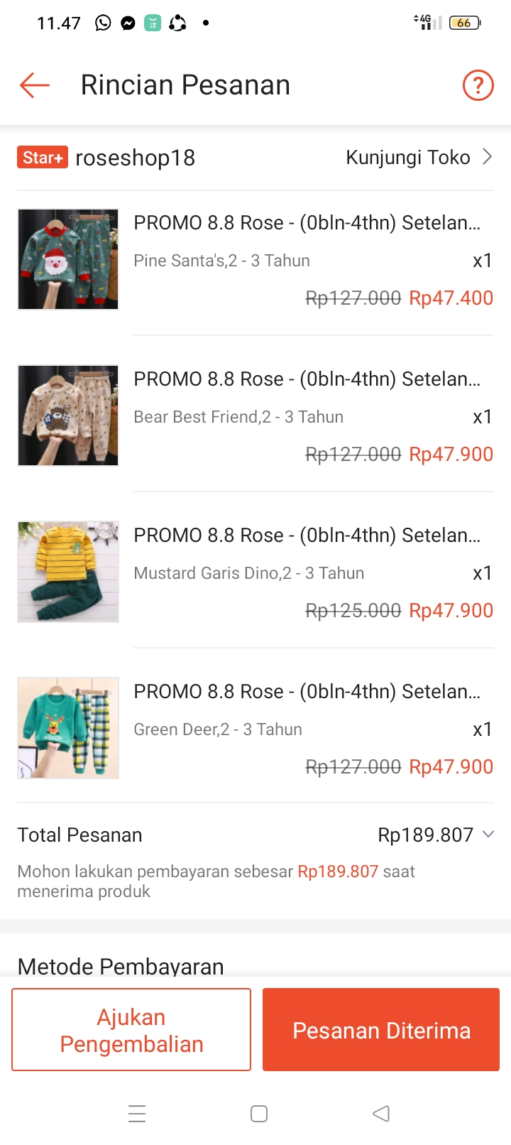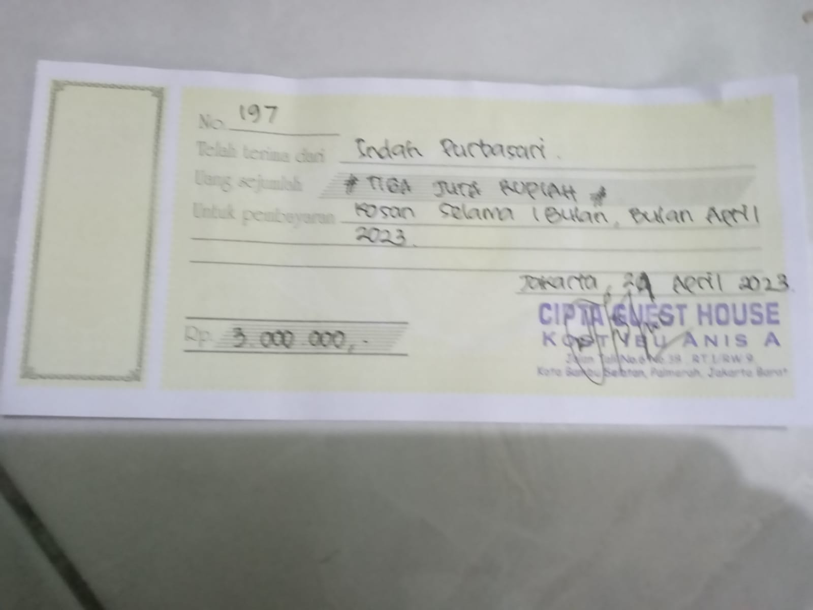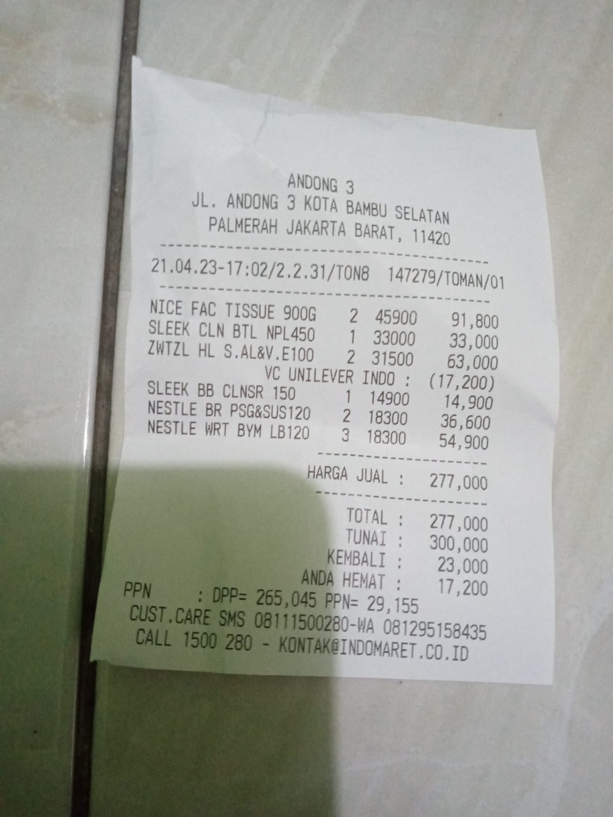 Dana digunakan untuk 1. Tisu kering besar Rp47.400 2. Tisu kering 19.900 x 4= Rp79.600 3. Tisu basah 17.500 x 3= Rp52.500 4. Susu Bebelove 3 100 gr 173.000 x 3= Rp519.000 5. Pampers Mamypoko 87.900 x 3= Rp263.700 6. Sabun Sleek Beby 26.700 x 3= Rp80.100 7. Promina puding 17.400 x 5= Rp87.000 8. Minyak cessa 34.000 x 2= Rp68.000 9. Baju anak setelan panjang 47.500 x 4= Rp190.000 10. Jaket anak Rp35.000 11. Biaya makan untuk 2 minggu Rp1.400.0002023-08-08 16:20:57