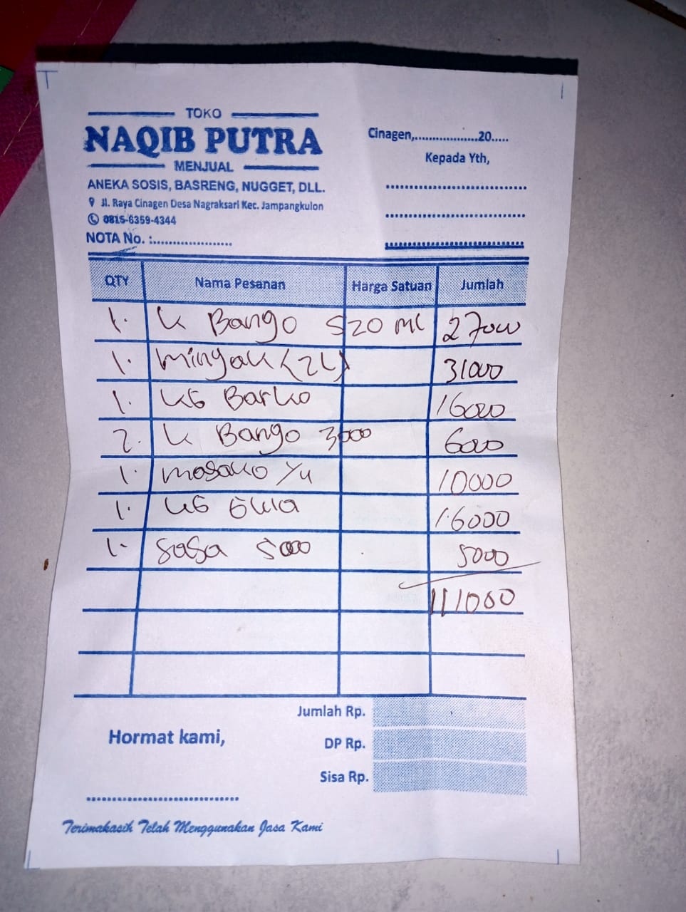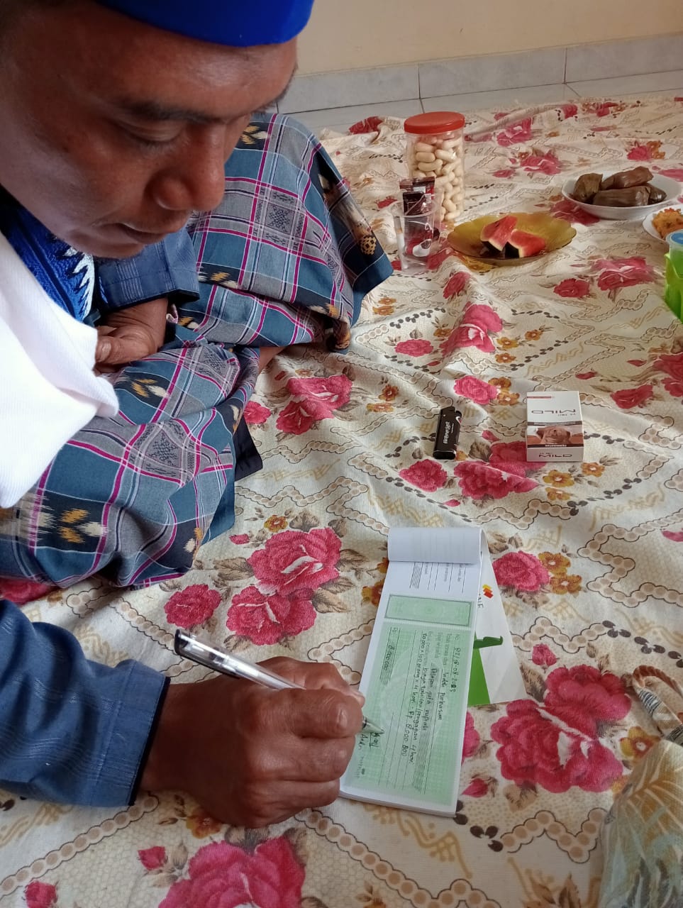 Penerima manfaat sudah berpulang, dana digunakan untuk modal warung kelontong untuk keluarga almarhum Azam, pembeliannya meliputi; 1. Peralatan (etalase, rak kayu, kalkulator, timbangan) Rp2.500.000 2. Modal sembako (beras, telur, minyak, SKM, kopi, mie, tepung, teh, dll) Rp5.000.000 3. Produk kebutuhan sehari hari (LPG, galon, produk minuman, bumbu dapur, produk sabun, es krim, obat-obatan, dll) Rp7.000.000 4. ATK dan alat kelistrikan Rp2.000.000 5. Pembayaran tagihan online (pulsa,2024-01-17 17:39:13