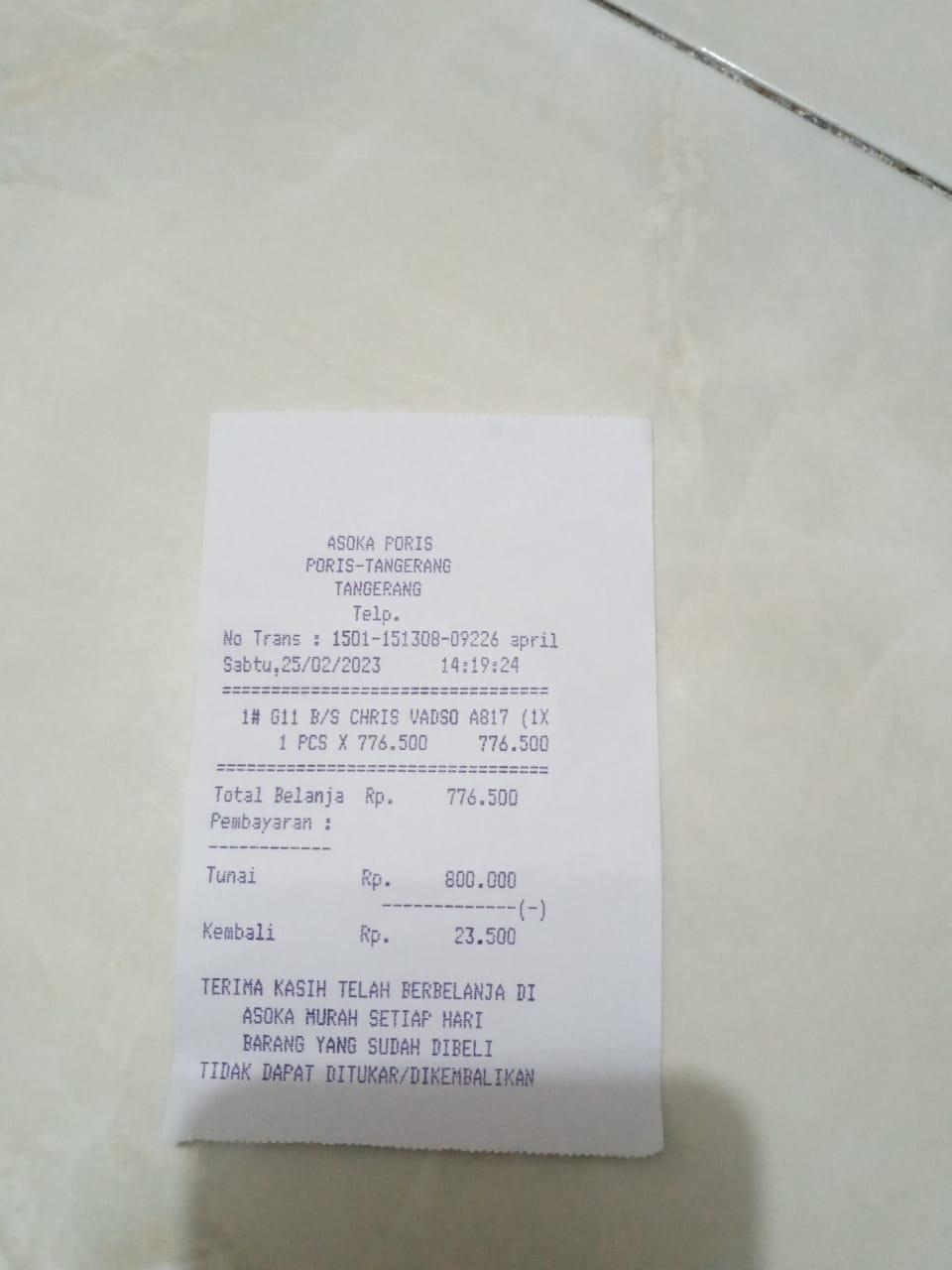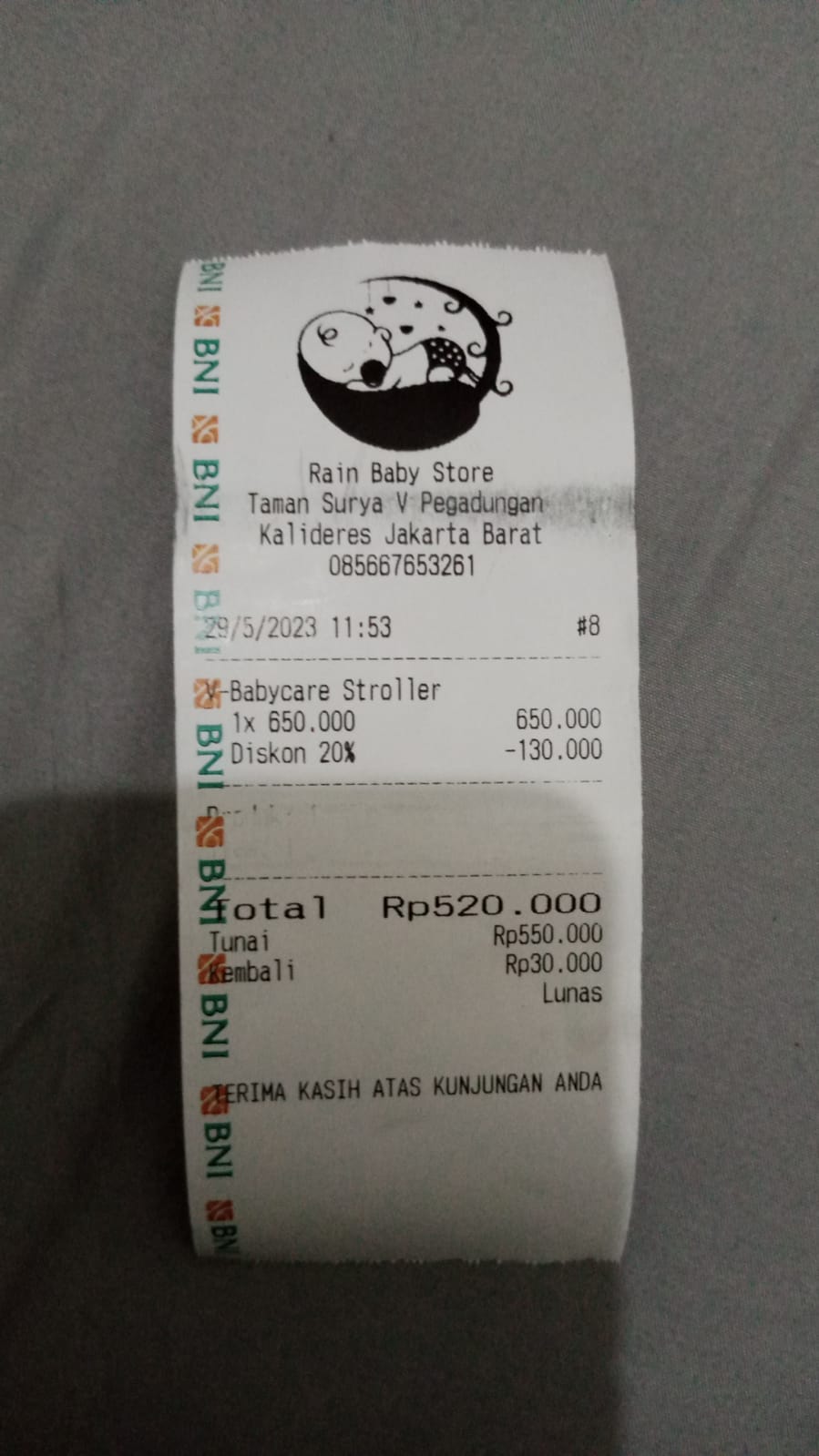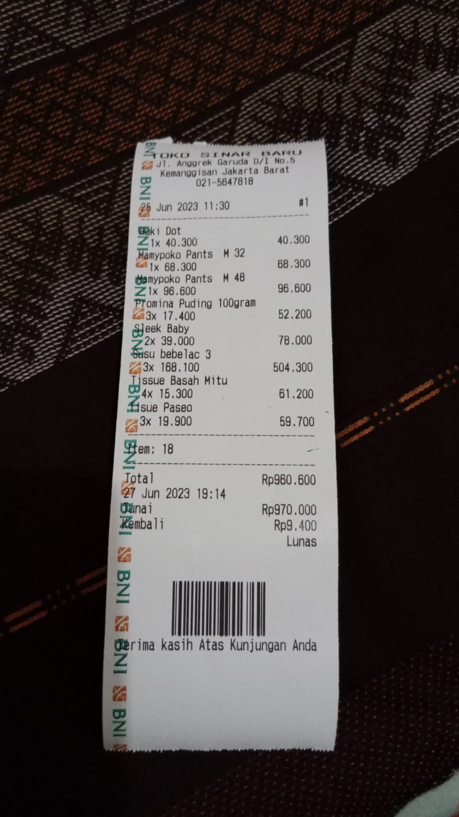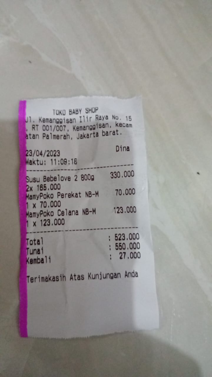 Dana digunakan untuk 1. Stroller Rp800.000 2. Pampers Mamypoko 2 pack Rp140.000 3. Susu SGM Gain 3 kotak Rp250.000 4. Tisu kering 2 buah Rp37.000 5. Sabun My baby 2 buah Rp50.000 6. Cussons baby cream 2 buah Rp40.000 7. Minyak telon My baby 2 buah Rp40.000 8. Promina bubur tim salmon 2 buah Rp40000 9. Tisu Paseo facial soft 2 buah Rp39.500 10. Zwitsal baby 2 buah Rp60.000.2023-02-24 16:41:11
