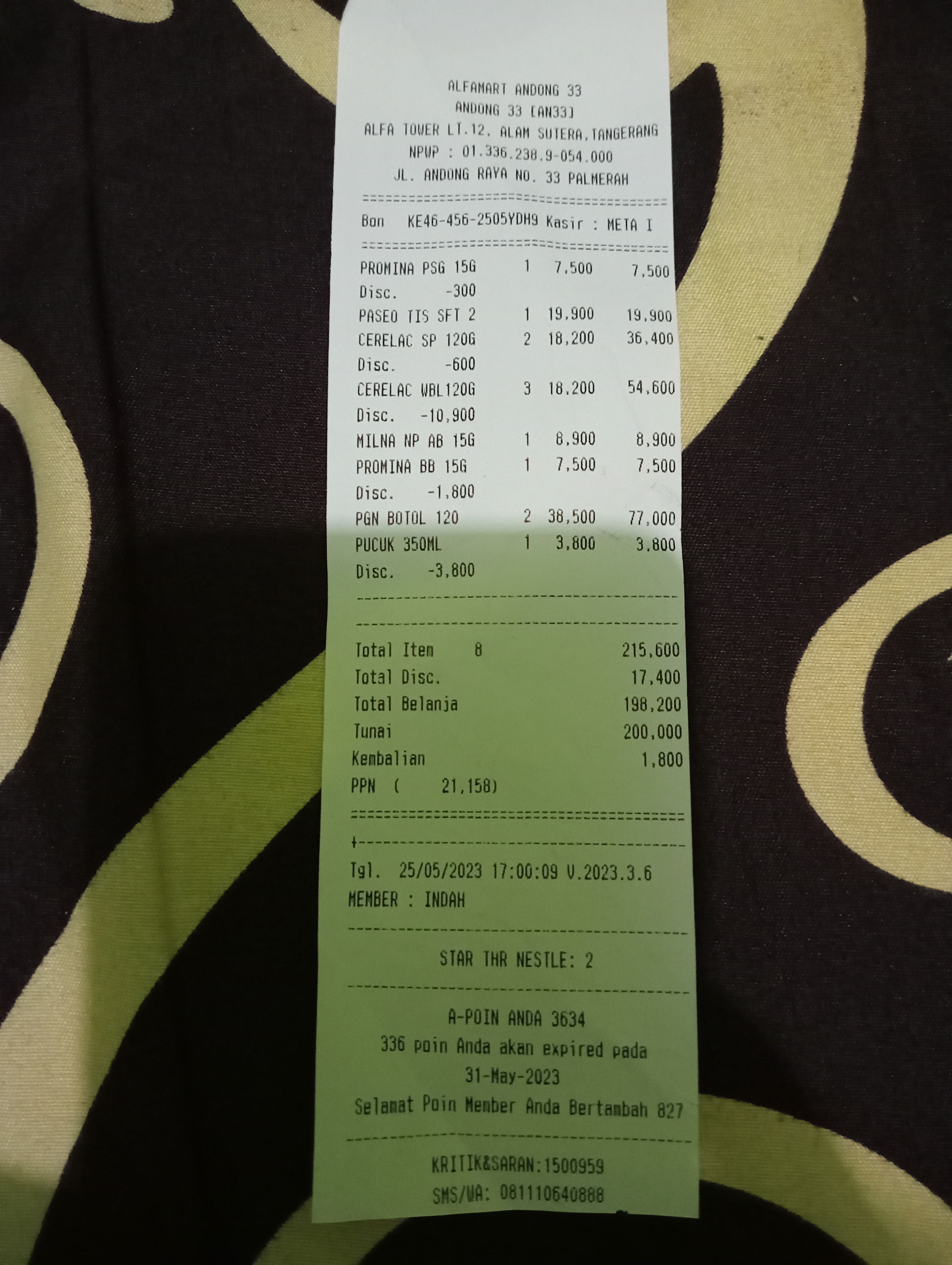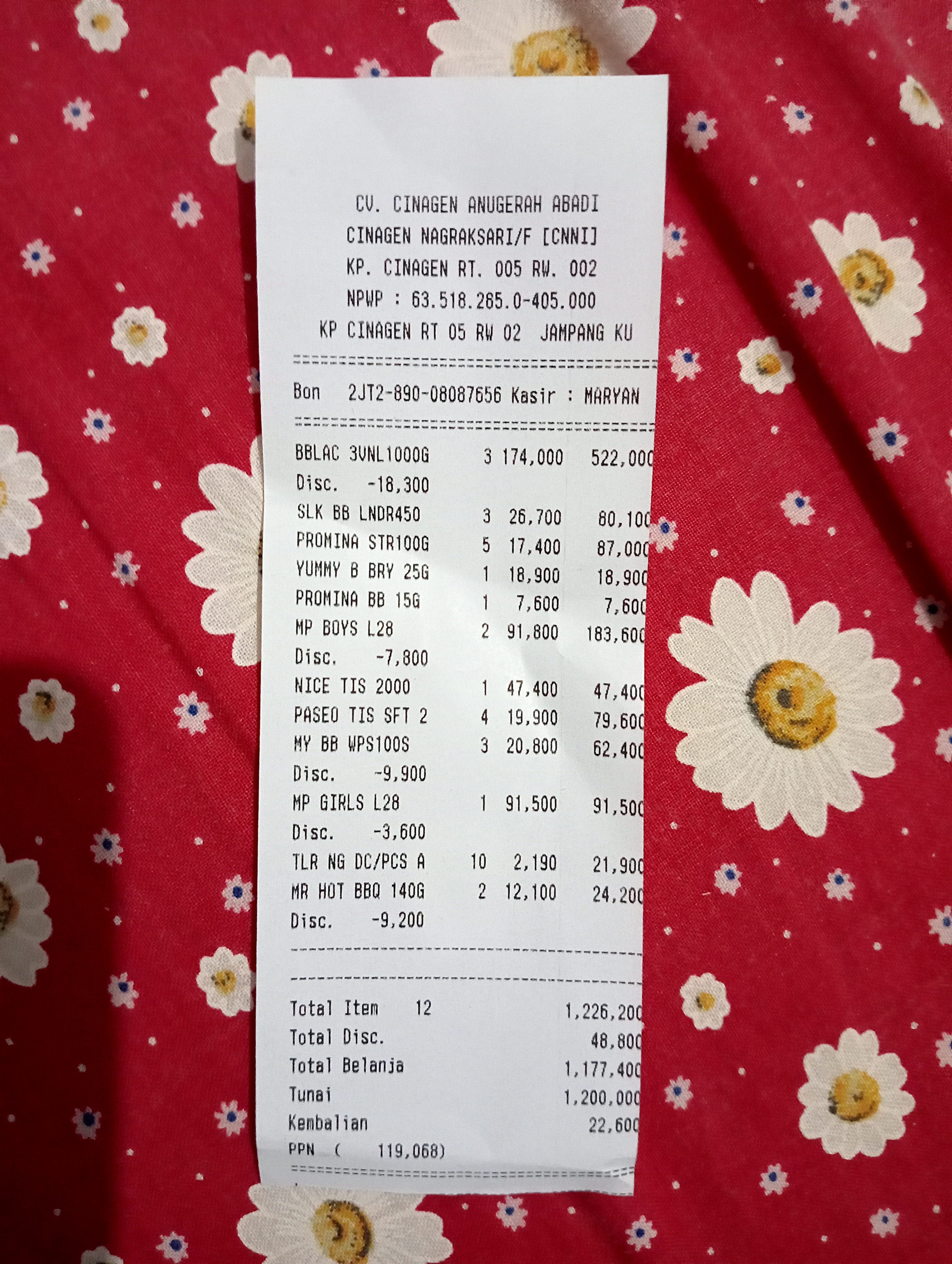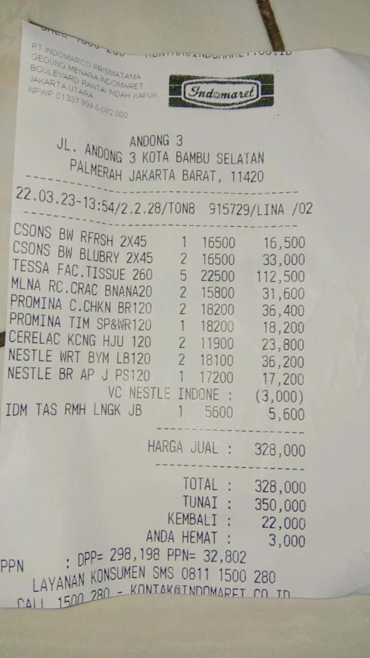 Dana digunakan untuk 1. Sabun Lactacyd Baby 65.000 x 3= Rp195.000 2. Sabun Johnson Milk & Rice 45.000 x 3= Rp135.000 3. Susu SGM Gain 100 0-12 bulan 95.000 x 5= Rp475.000 4. Minyak Telon 35.000 x 3= Rp105.000 5. Pampers Mamy Poko Tipe Perekat Rp110.000 6. Zwitsal Handsanitizer Baby 5.000 x 10= Rp50.000 7. Cotton Buds Baby 4.000 x 5= Rp20.000 8. Cussons Baby Oil 22.000 x 3= Rp 66.000 9. Cussons Baby Cream Mild & Gentle 24.000 x 3= Rp 72.000 10. Pure Rash Cream 35.000 x 3= Rp105.0002023-03-21 18:01:22
