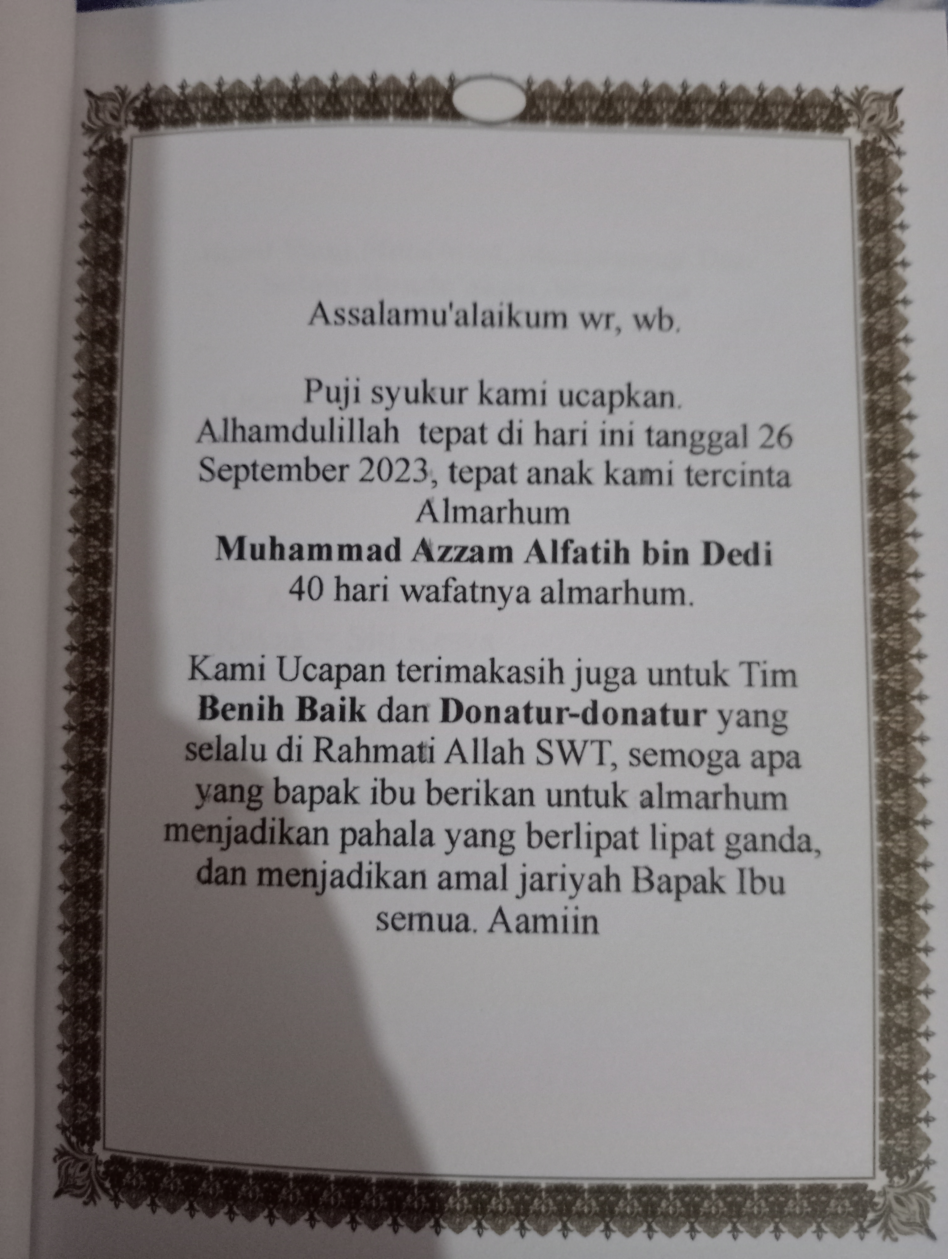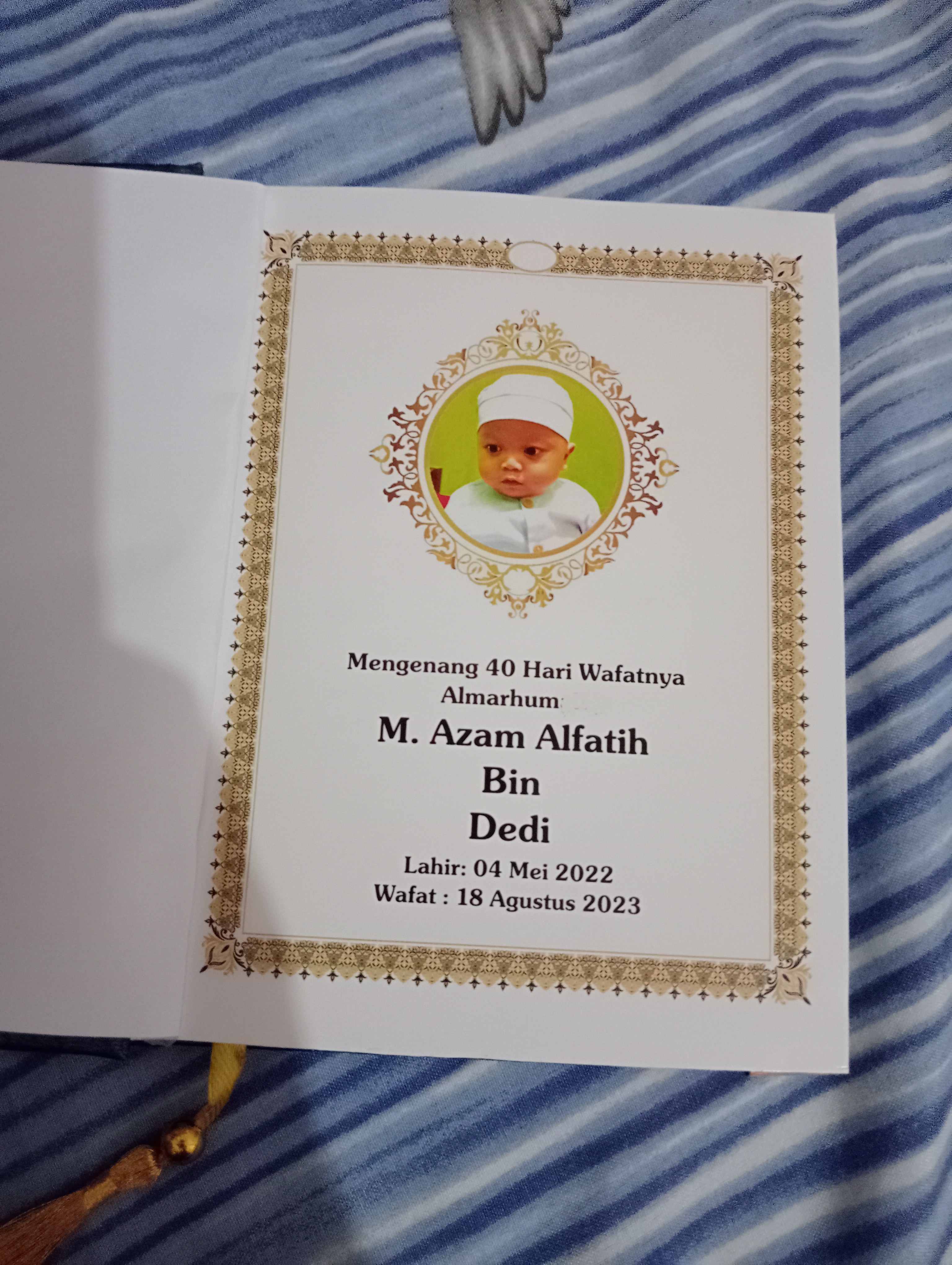 Aku orang tua dari almarhum Muhammad Azam Al Fatih ingin mengabarkan bahwa acara selamatan 40 harinya sudah dilaksanakan pada hari Selasa 26 September 2023. Doakan ya TemanBaik, semoga almarhum anakku bisa diterima dengan baik di sisi-Nya.