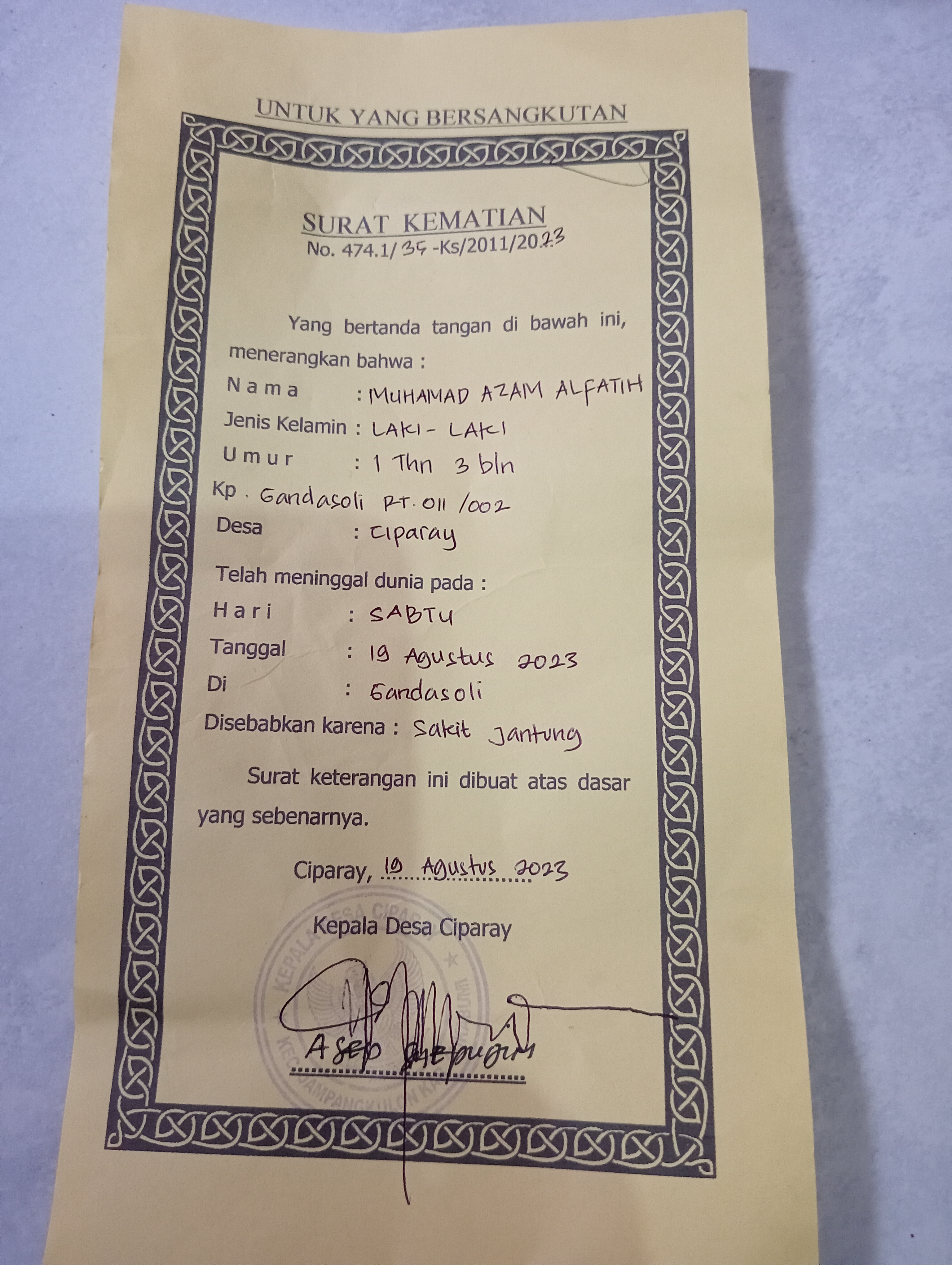 Aku ingin mengabarkan bahwa Muhammad Azam, anakku saat ini telah wafat pada 19 Agustus 2023 di kediaman kami.
