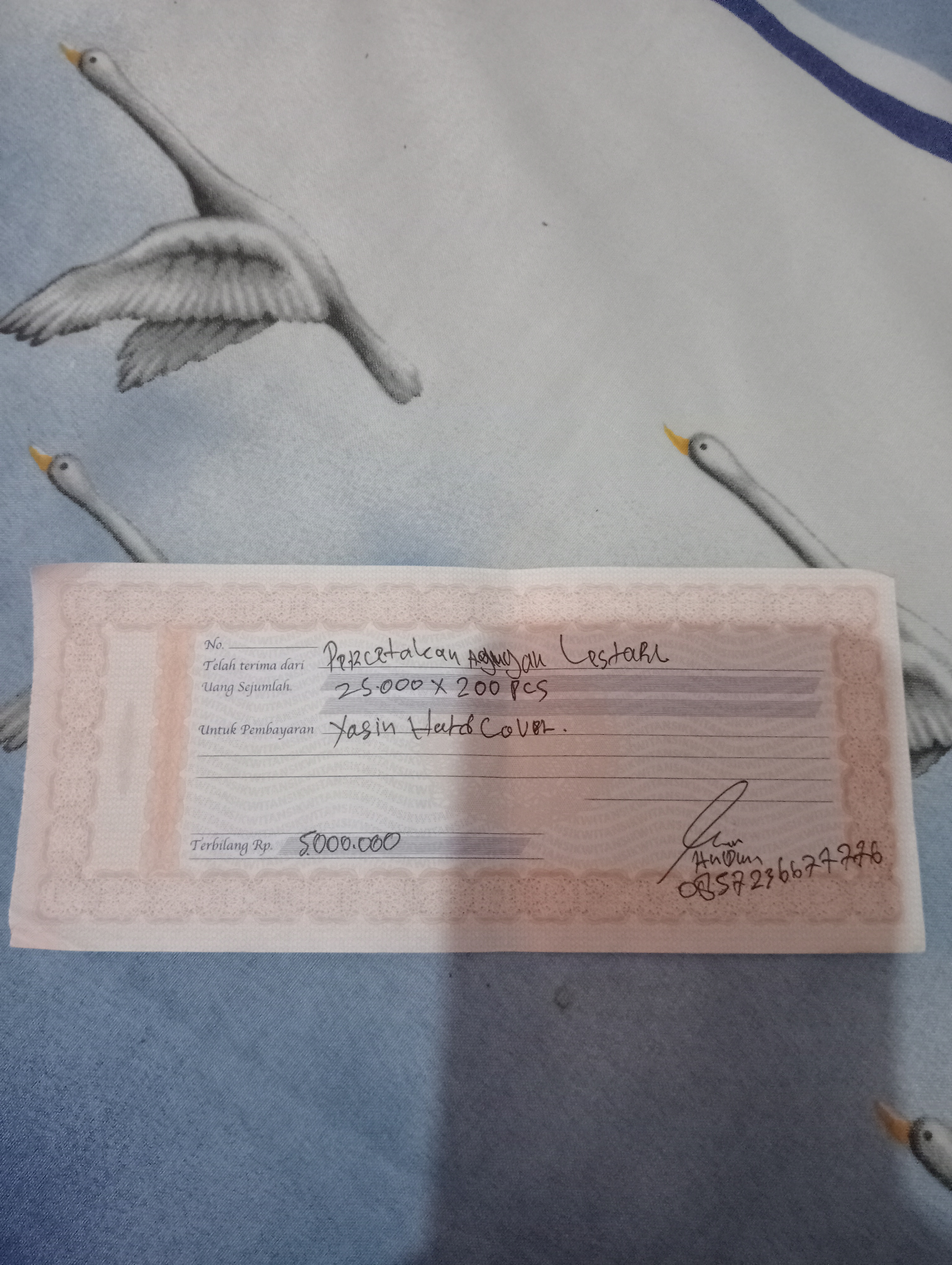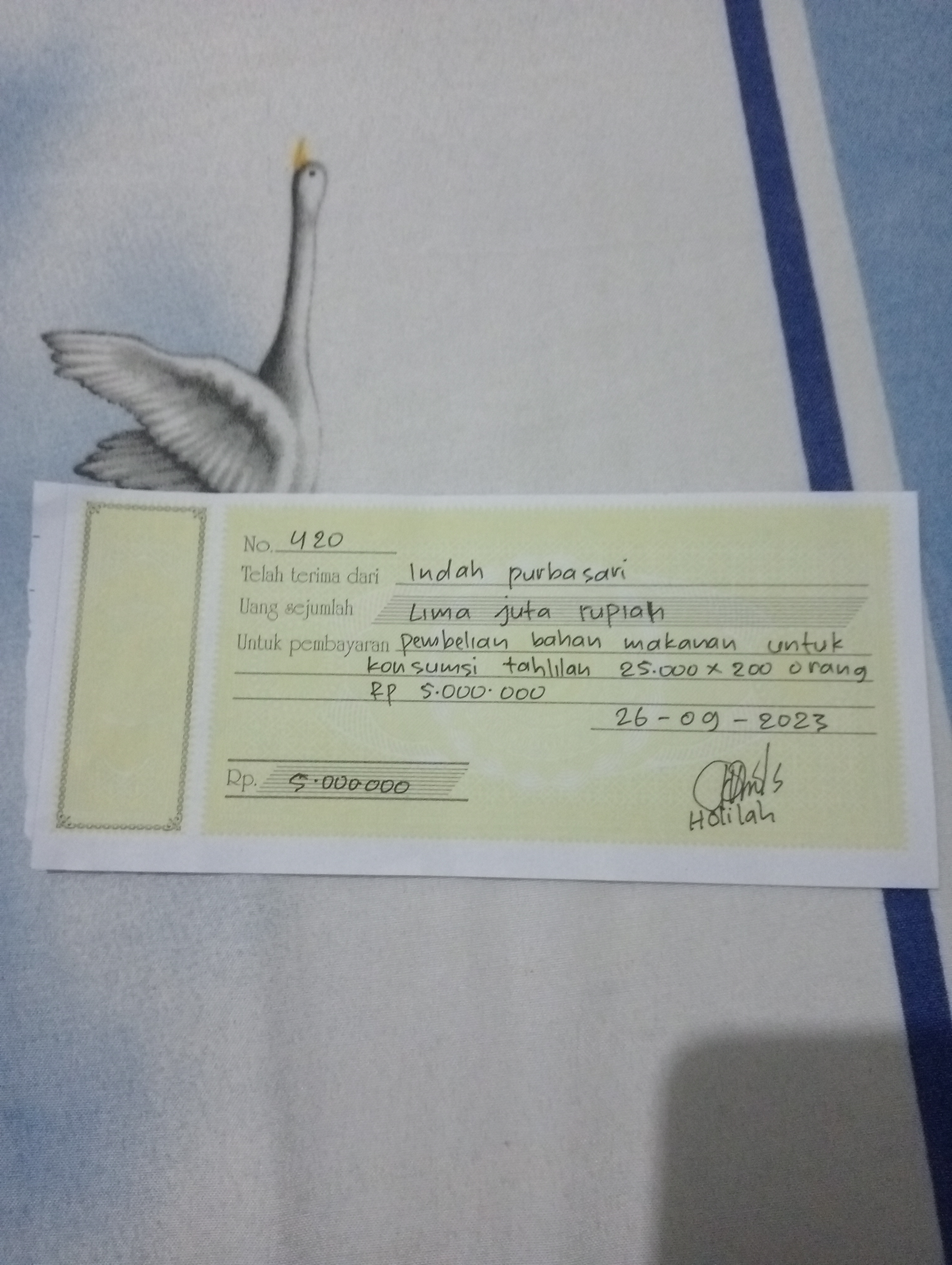 Dana digunakan untuk 1. Pembelian nasi box untuk acara tahlilan 100 hari almarhum Azam 25.000 x 200 pcs= Rp5.000.000 2. Pembelian kue basah 10.000 x 200 kotak= Rp2.000.000 3. Santunan yatim piatu dan jompo 200.000 x 25 orang= Rp5.000.000.2023-11-17 18:01:57