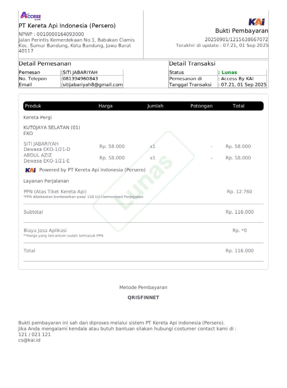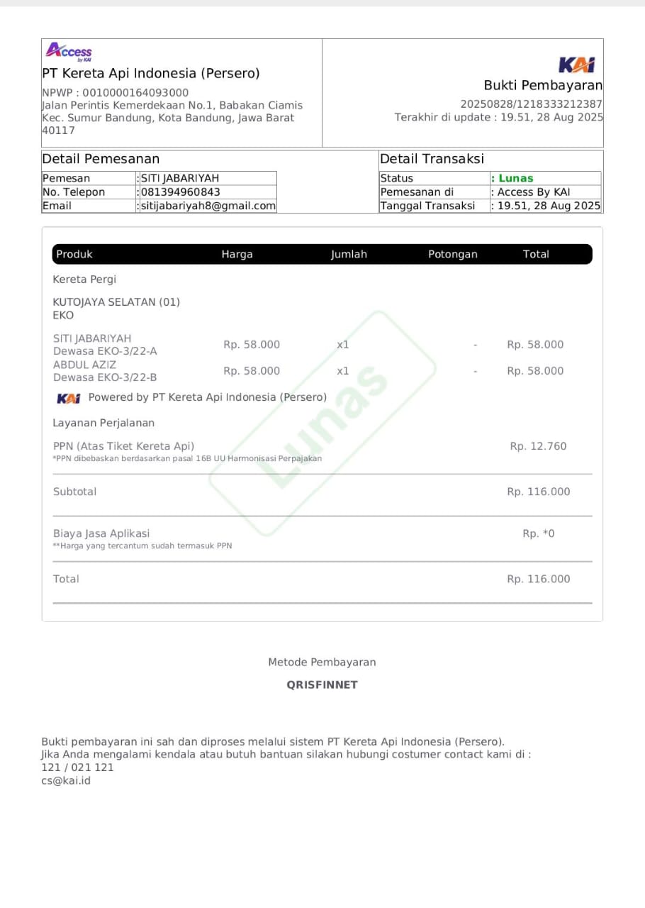 Dana digunakan untuk Pembelian tiket kereta api dari Tasikmalaya-kutoarjo PP Rp116.000 x 2 orang = 116.0002025-08-29 09:48:10