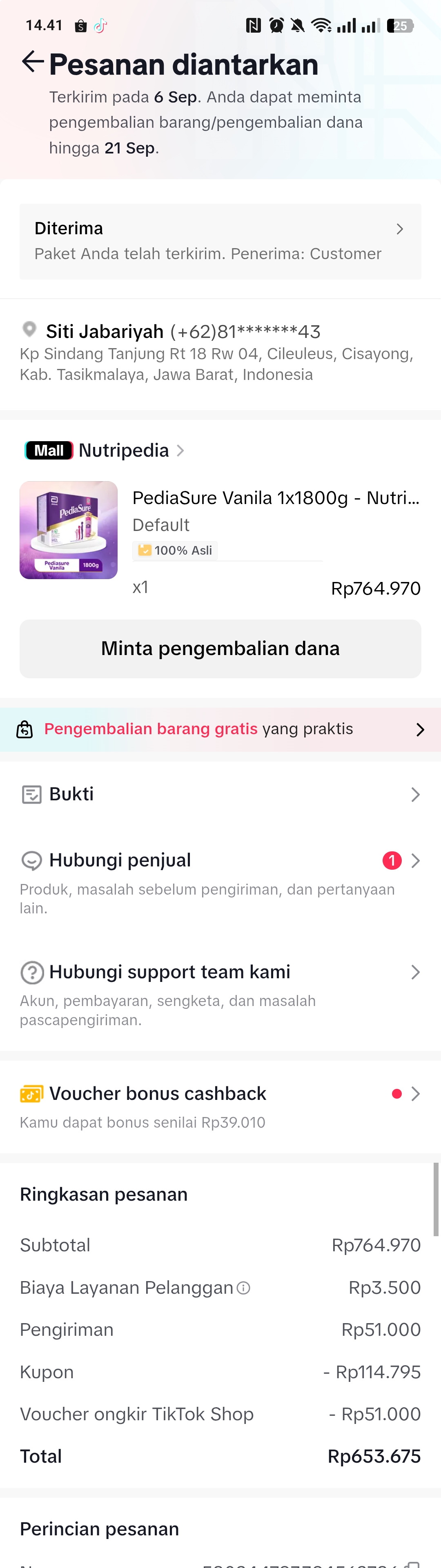 Dana digunkan untuk susu pediasure vanila 1800g Rp661.0002025-09-04 08:57:25