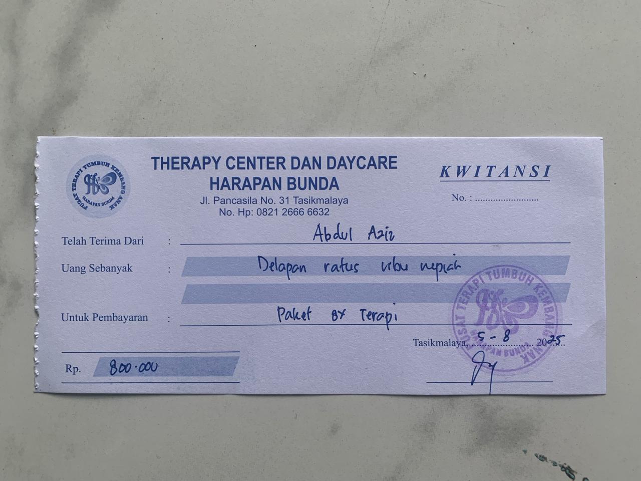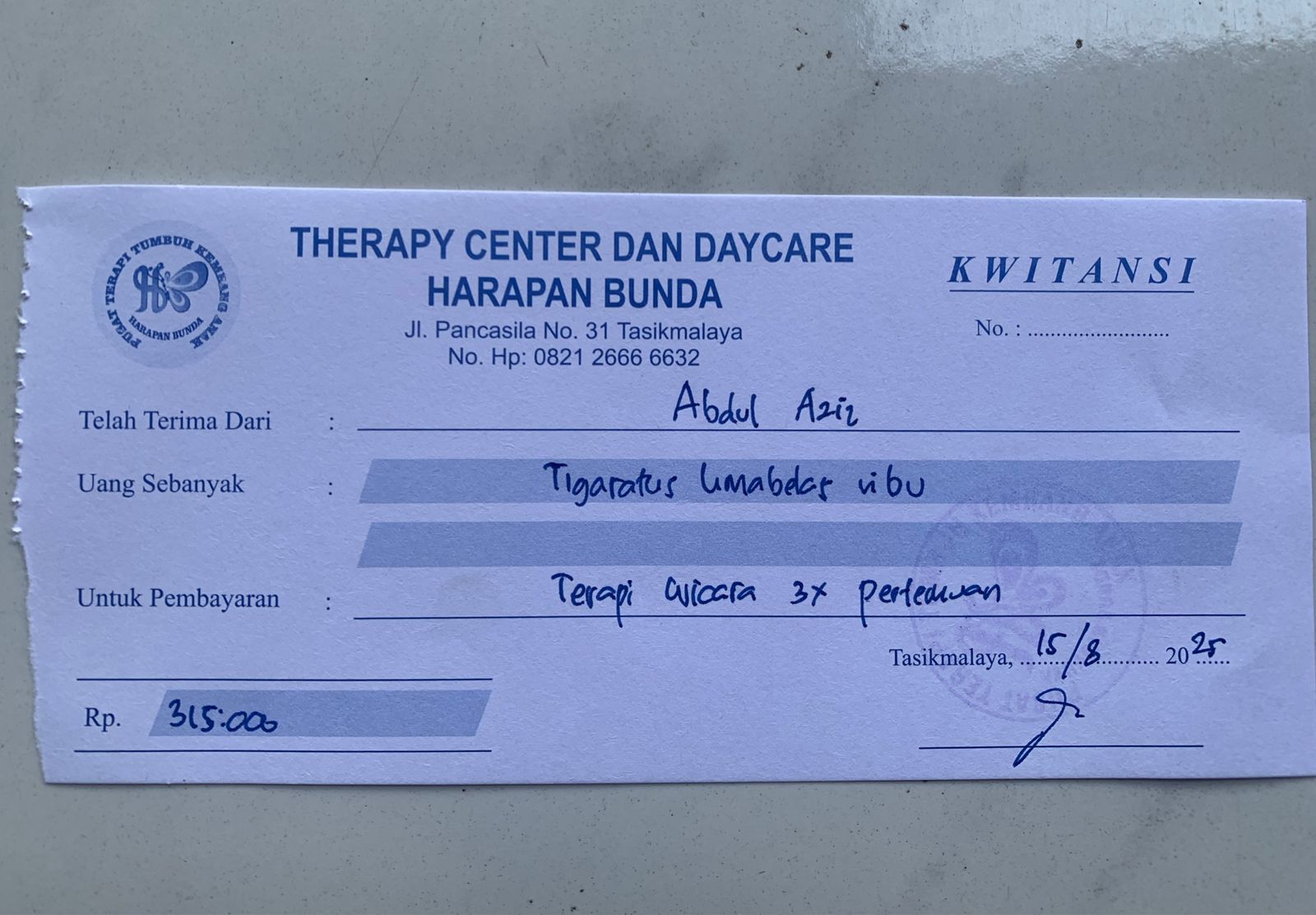 Dana digunakan untuk 1. Susu pediasure 1800gr rasa vanila RP.650.000 2. Fisioterapi di klinik therapy center harapan bunda RP.105.000 3. Terapi wicara di klinik therapy center harapan bunda RP.105.0002025-10-02 07:11:19