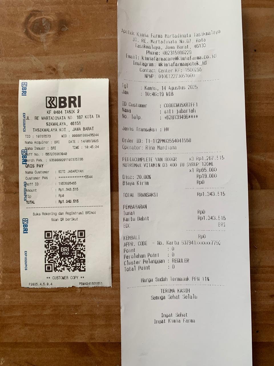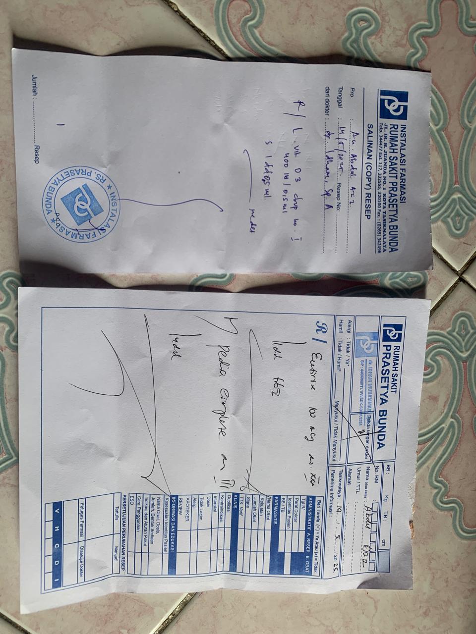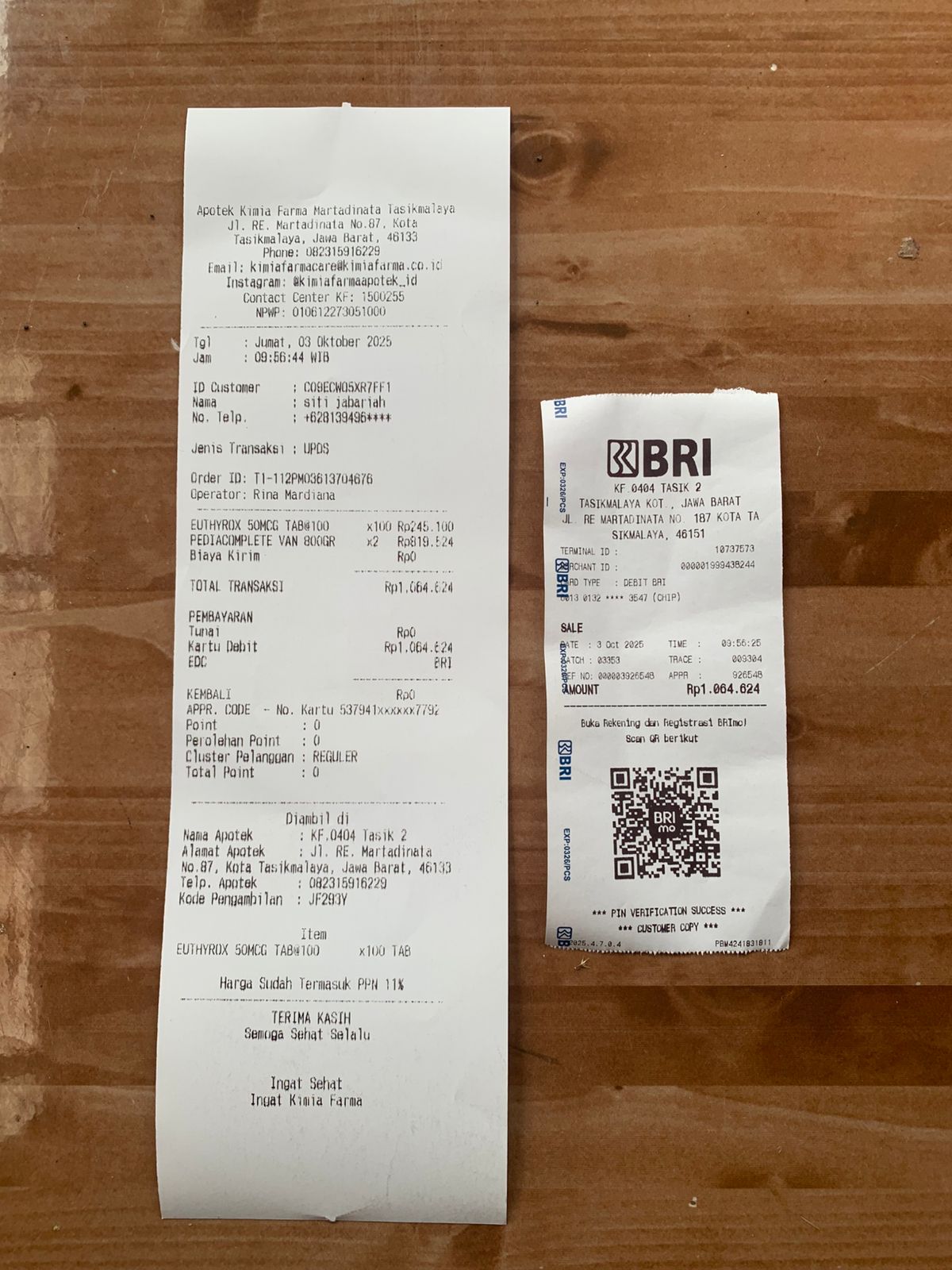 Dana digunakan untuk 1. Obat hipotiroid Euthyrok 50MCG 2 tab Rp61.500 x 2pcs = Rp123.000 2. L-Vit D3 Drops 15ml Rp55.000 x 3pcs = 165.0002025-05-14 11:00:10