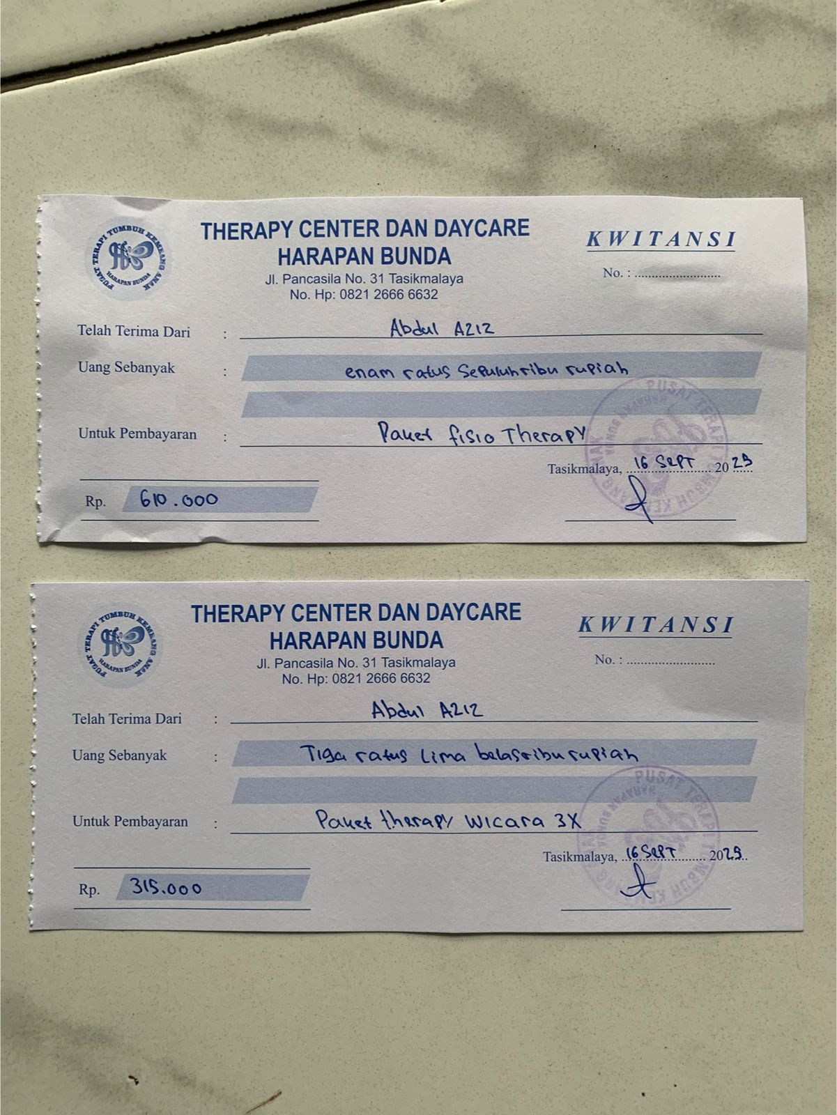 Dana digunakan untuk 1. Fisioterapi untuk 3 minggu Rp100.000 x 6 = Rp600.000 2. Terapi wicara untuk Rp100.000 x 3 = 300.0002025-09-15 09:16:15
