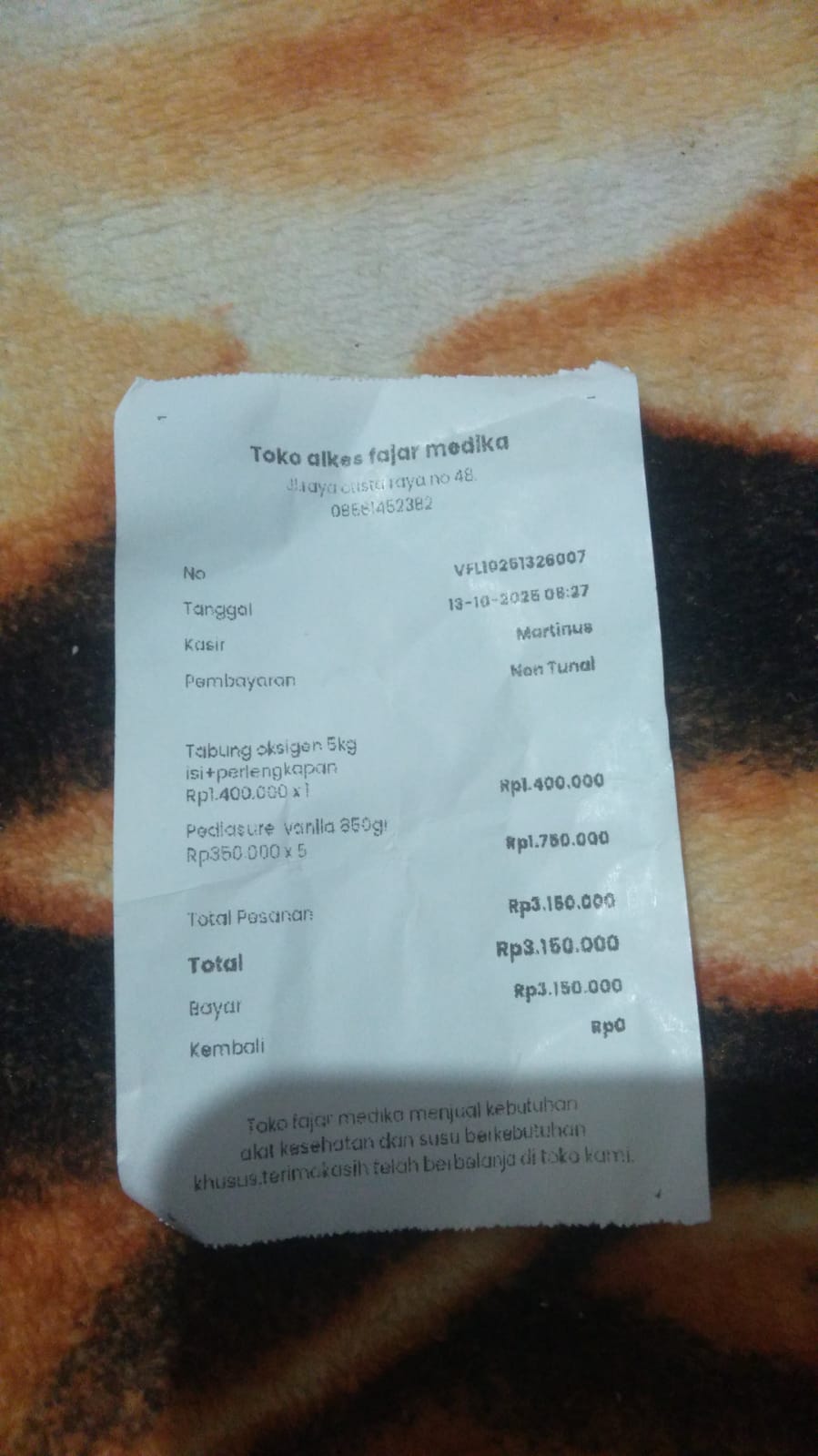 Dana digunakan untuk 1. Susu pediasure 850gram Rp350.000 x 4kaleng= Rp1.400.000 2. Beli tabung oksigen 5KGRp Rp1.400.000 3. Bayar tunggakan BPJS juli- Agustus Rp140.000 x 2 = Rp280.000 4. Transportasi berobat ke RS Rp. Rp65.000 x 2 =130.0002025-08-12 10:08:45