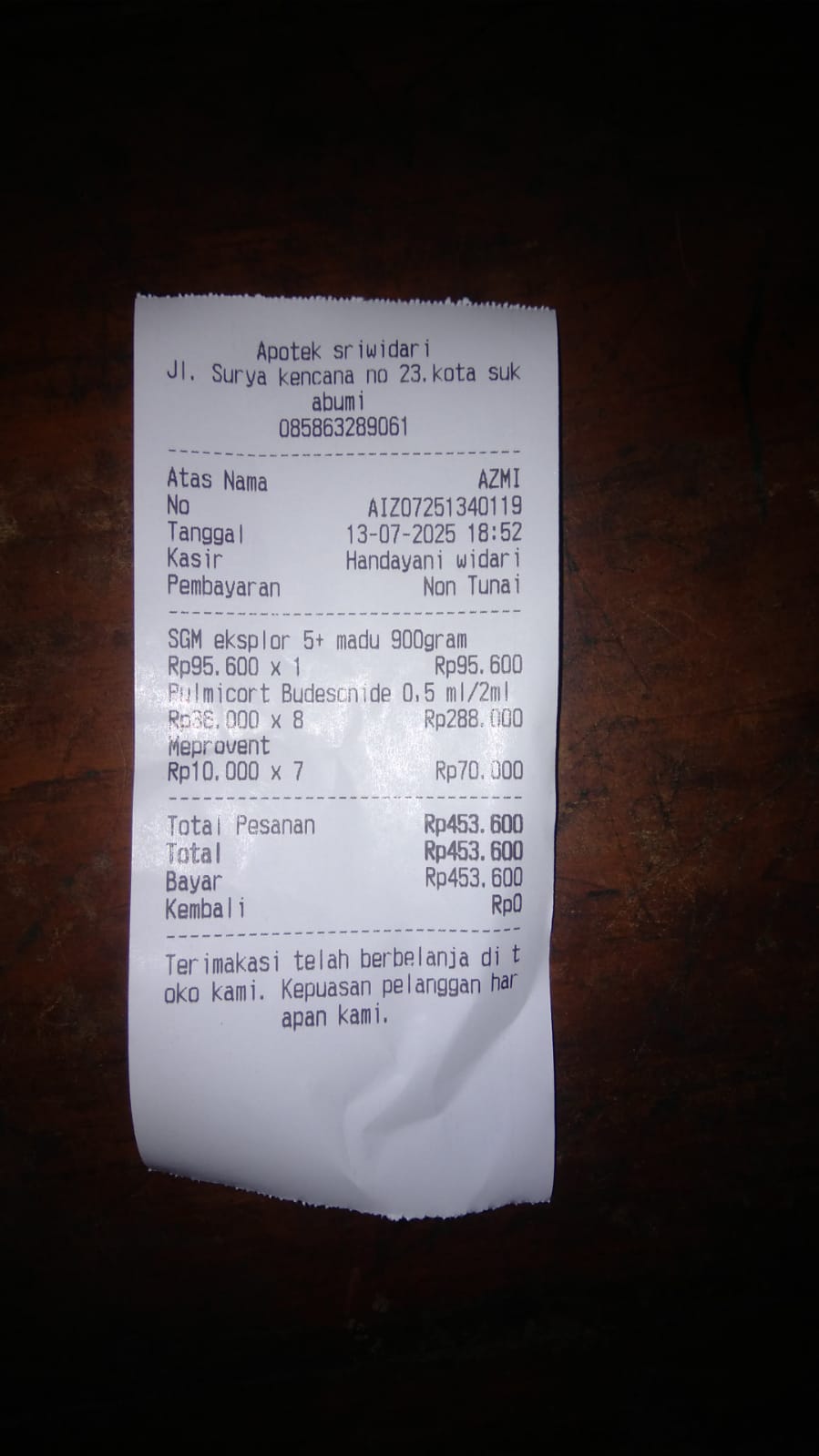 Dana digunakan untuk Obat sesak pulmicort respules 0.5mg. Rp35.000 x 7 = Rp245.0002025-06-10 09:39:36
