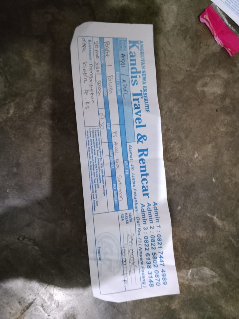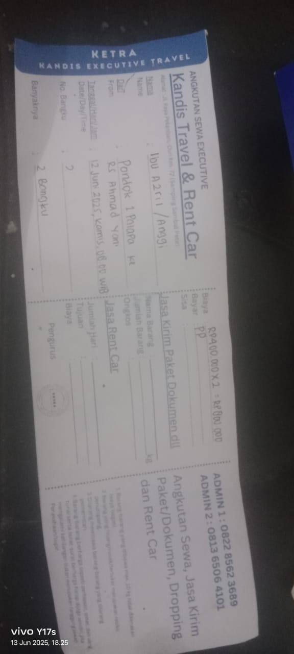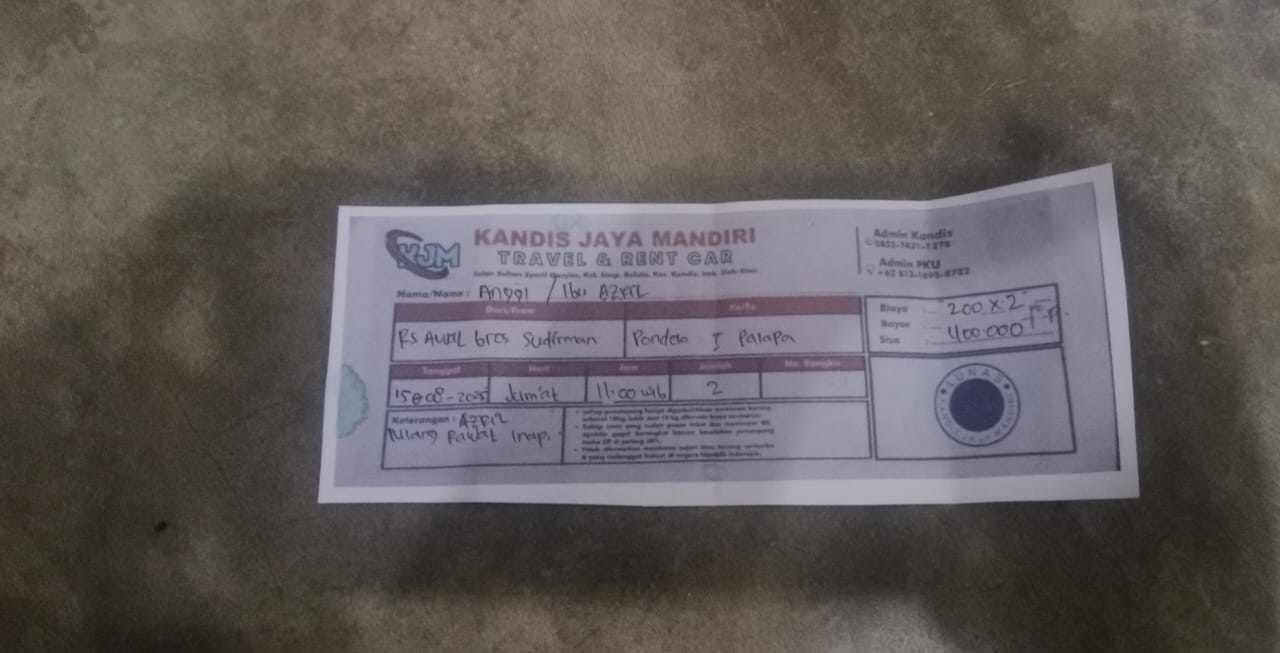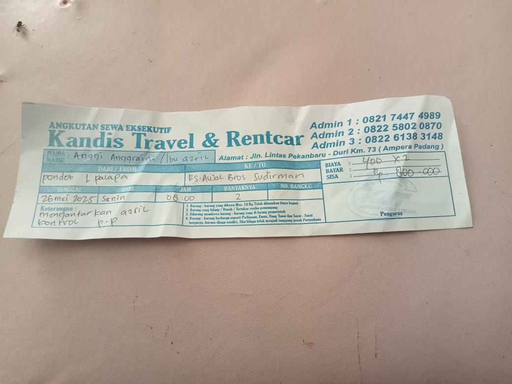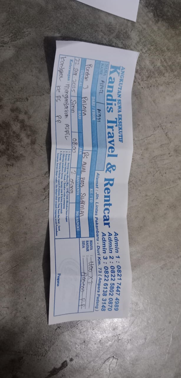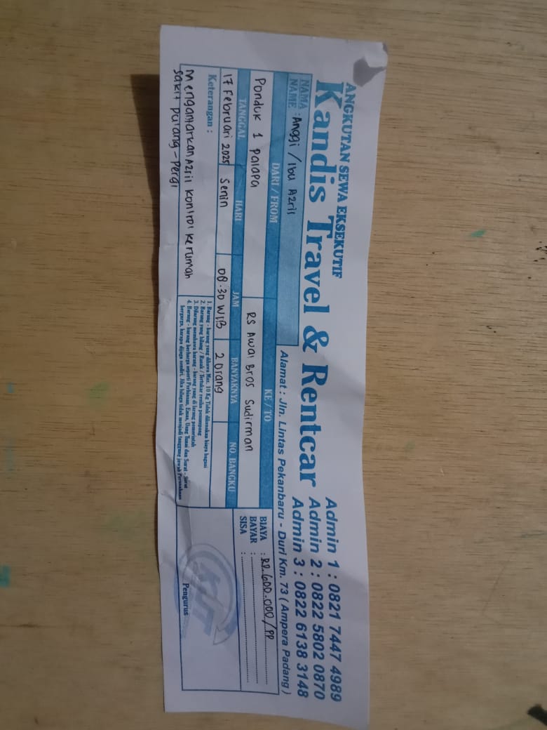 Dana digunakan untuk 1.Transportasi travel ke RS awalbros sudirman tanggal 30 pp Rp400.000 2. Biaya konsumsi ke rs Rp50.0002025-01-02 09:30:54