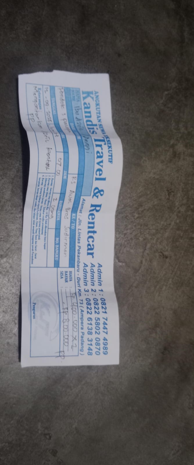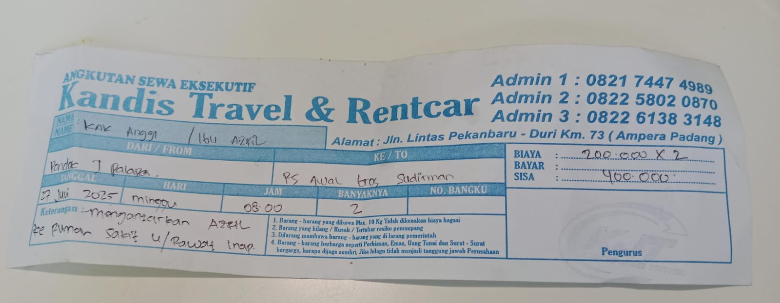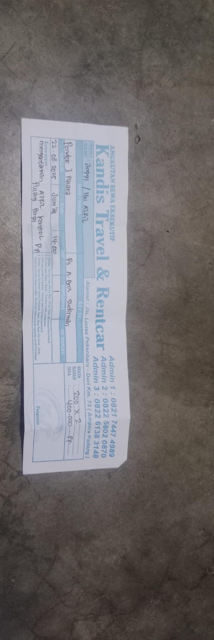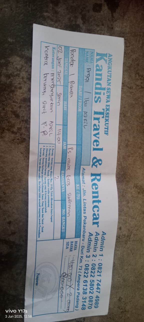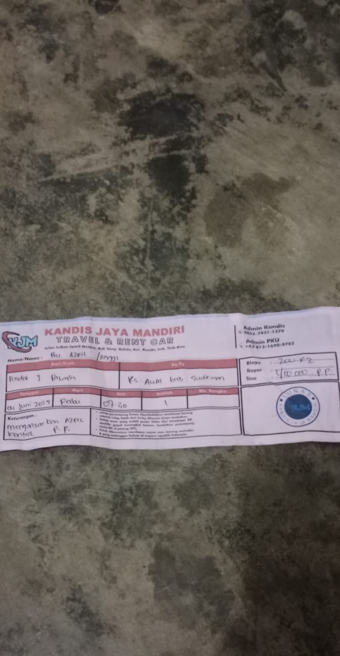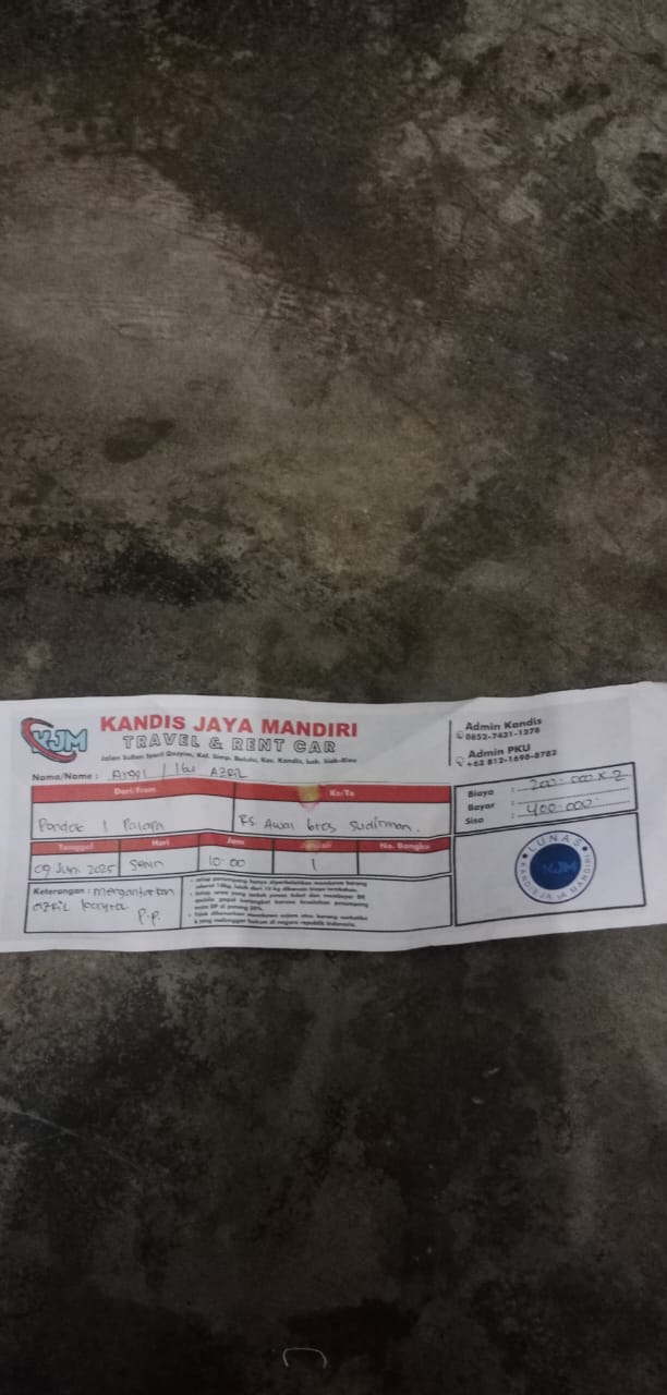 Dana digunakan untuk 1.Transportasi travel ke RS awalbros sudirman tanggal 30 pp Rp400.000 2. Biaya konsumsi ke rs Rp50.0002025-01-02 09:30:54