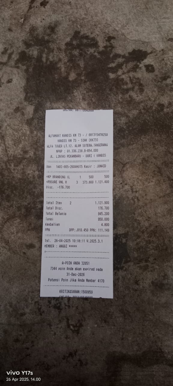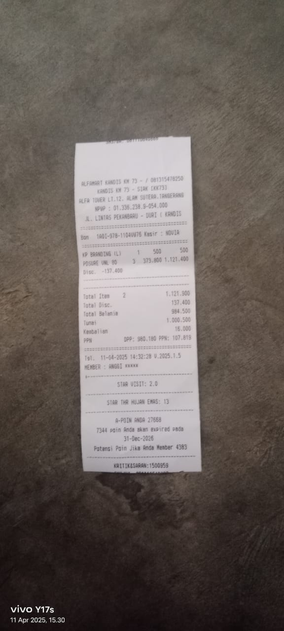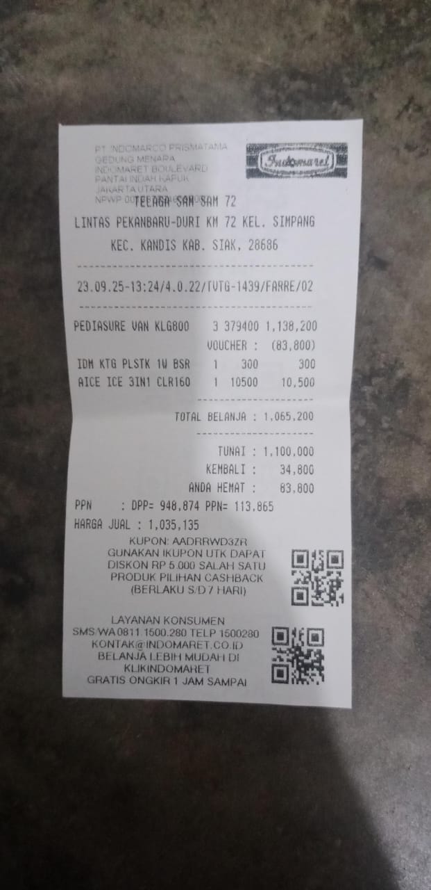 1. Susu pediasure Rp364.000 x 3 kaleng = Rp. 1.092.000 2. Susu dancow 1 kg = Rp115.000 3. Pampers ukuran M Rp48.000 4.rental mobil tanggal 14 buat antar terapi azril yang ke 4 =rp 500.000 5.Reimburse travel tanggal 09 pulang pergi buat terapi azril = Rp. 400.000 Total =2.155.0002025-05-14 10:59:19