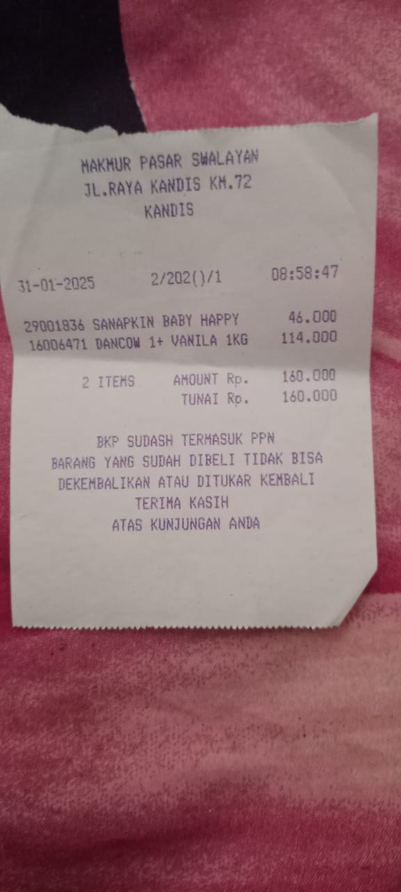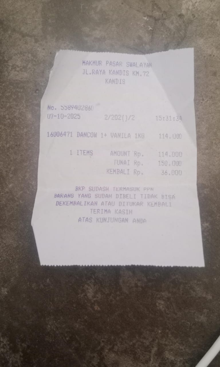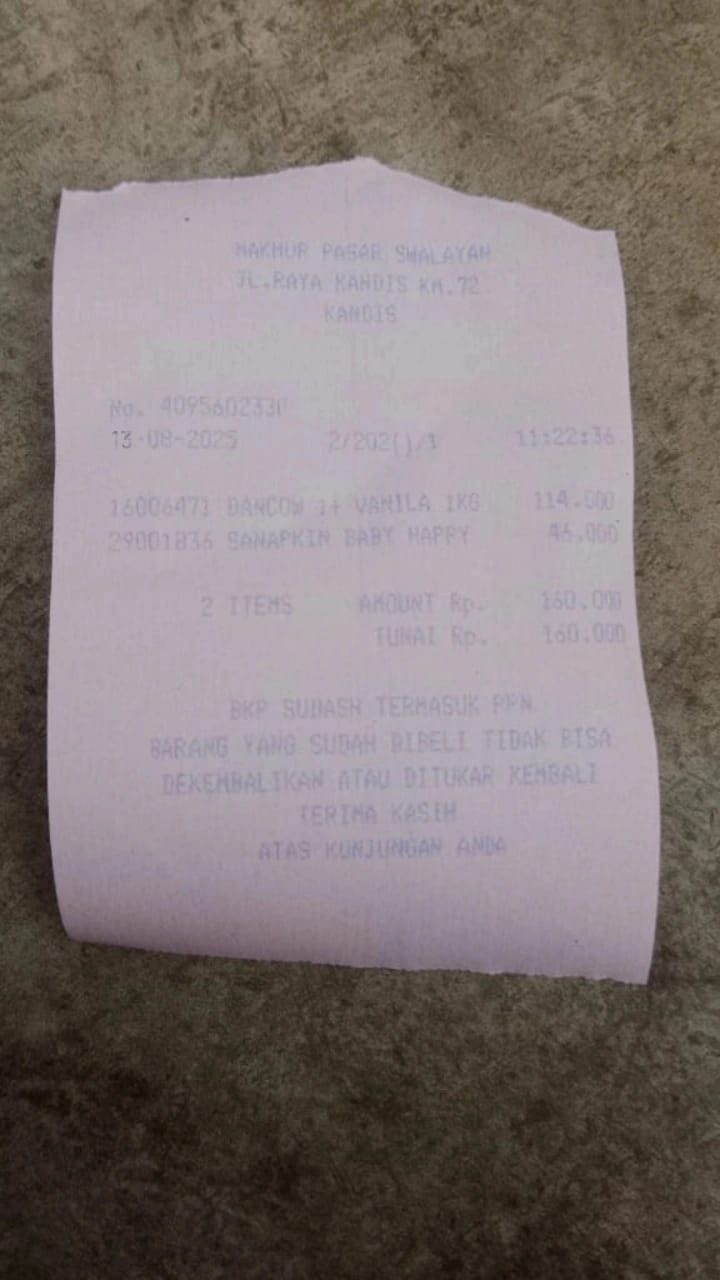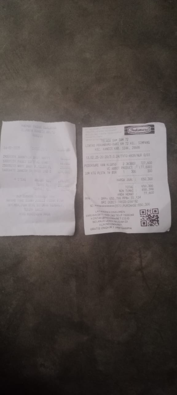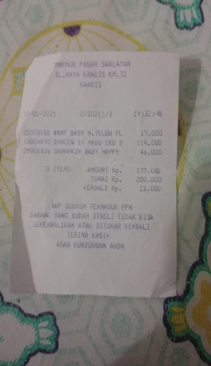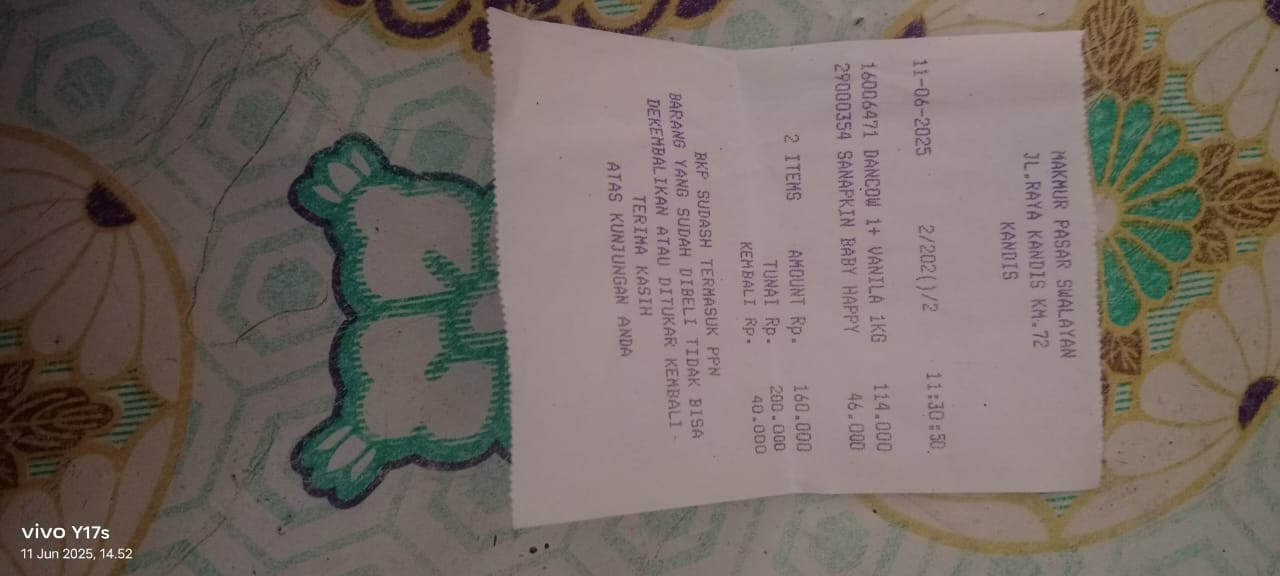 Dana digunakan untuk 1. Susu pediasure Rp373.000 x 3kaleng = Rp 1.119.00 2. Susu dan caw 1kg Rp114.000 3. Pempes ukuran L sweety Rp60.0002025-11-25 09:24:01