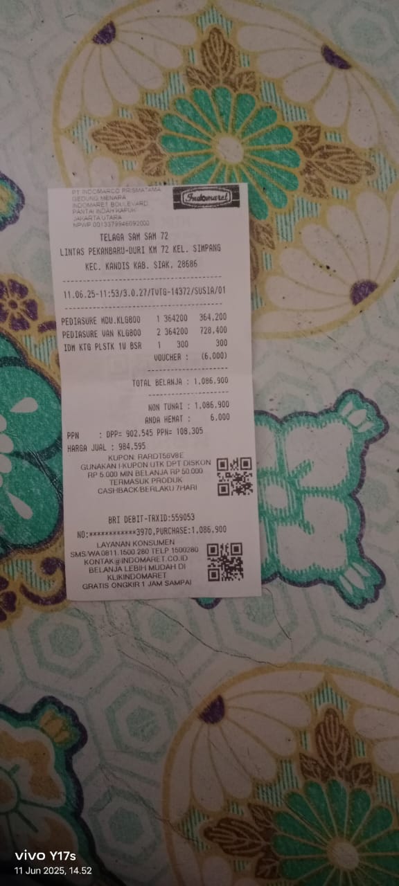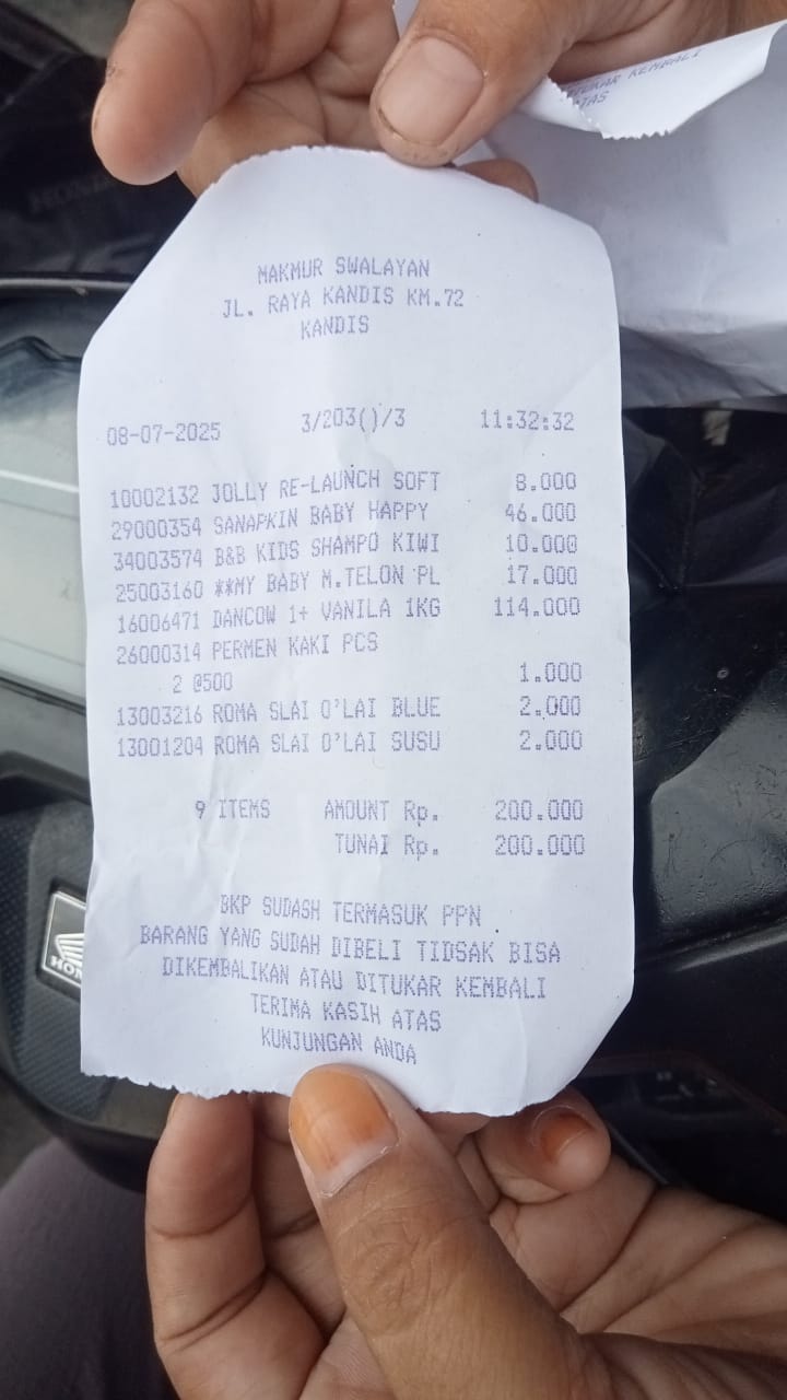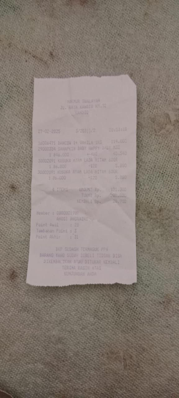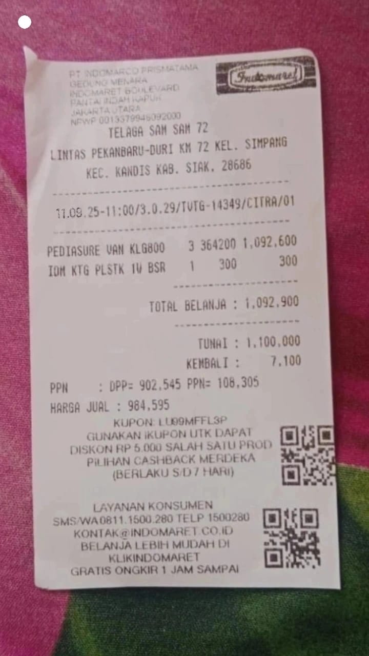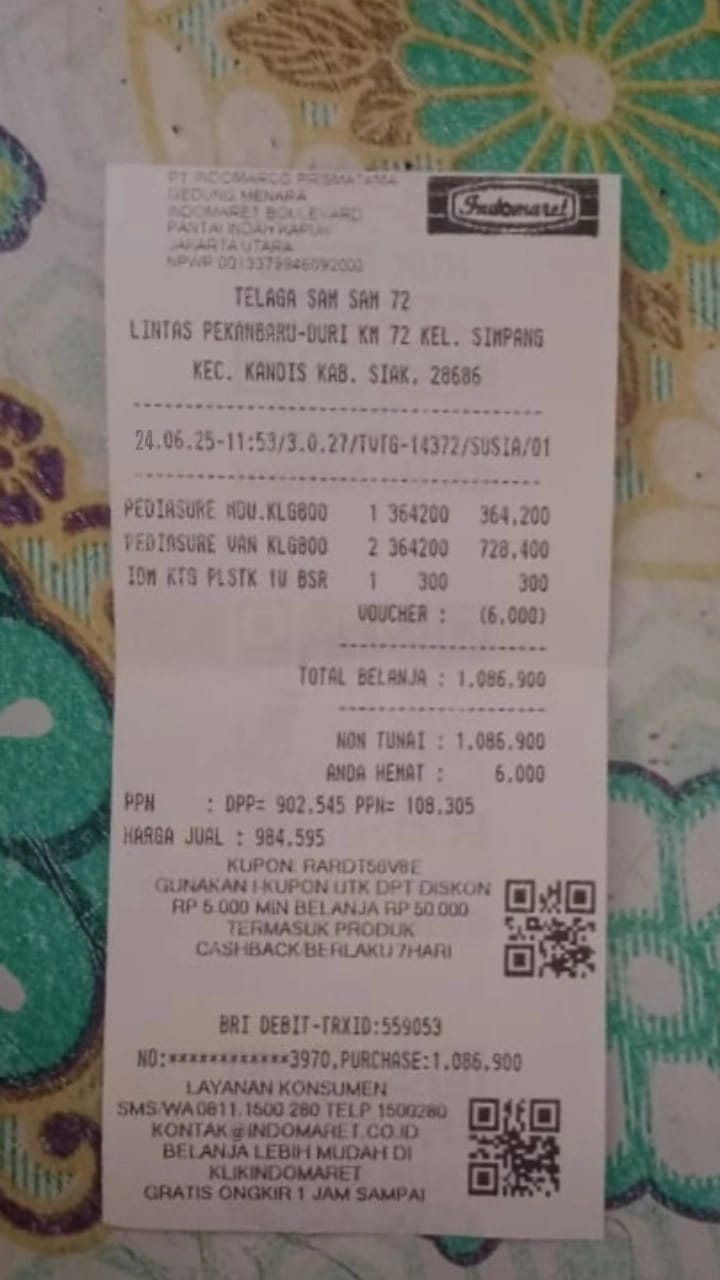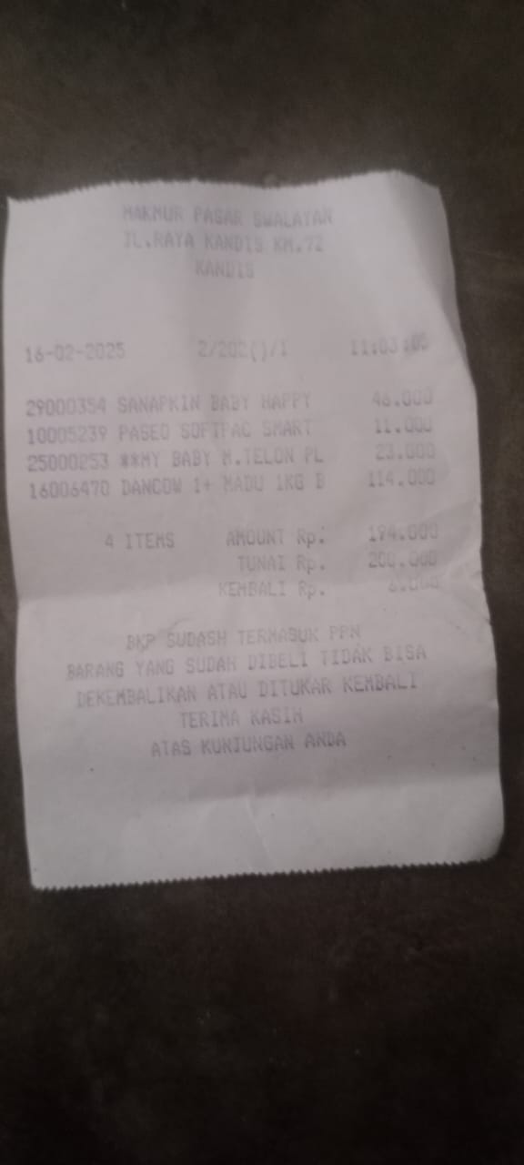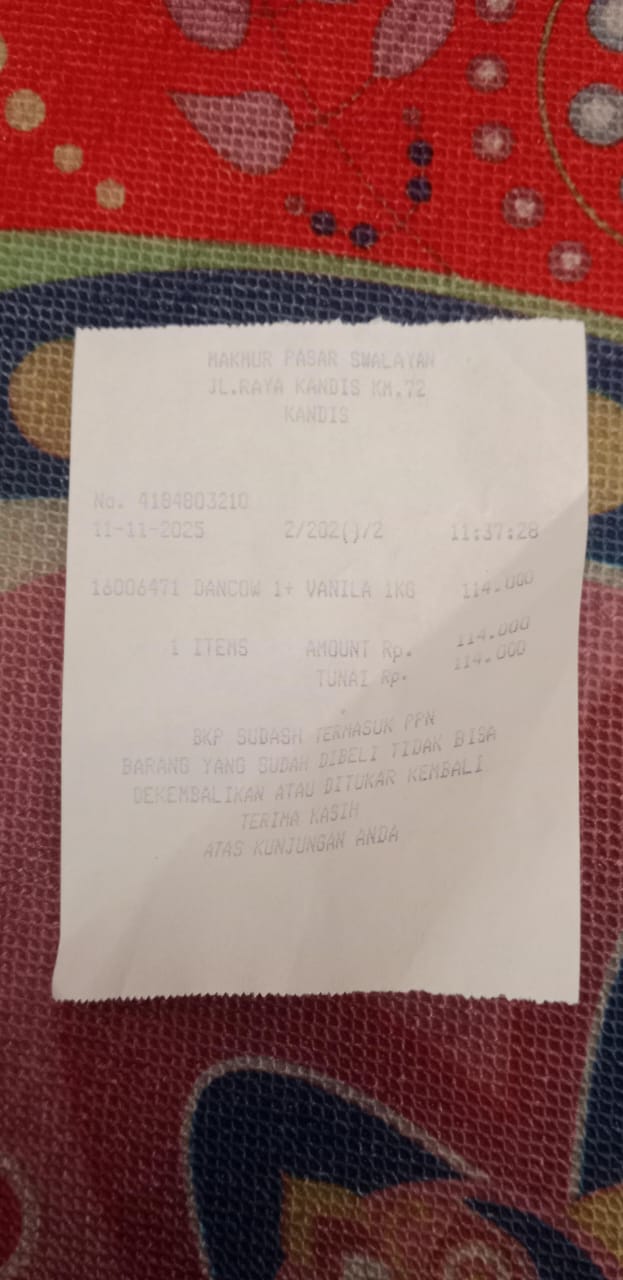 Dana digunakan untuk 1. Susu pediasure Rp373.000 x 3kaleng = Rp 1.119.00 2. Susu dan caw 1kg Rp114.000 3. Pempes ukuran L sweety Rp60.0002025-11-25 09:24:01