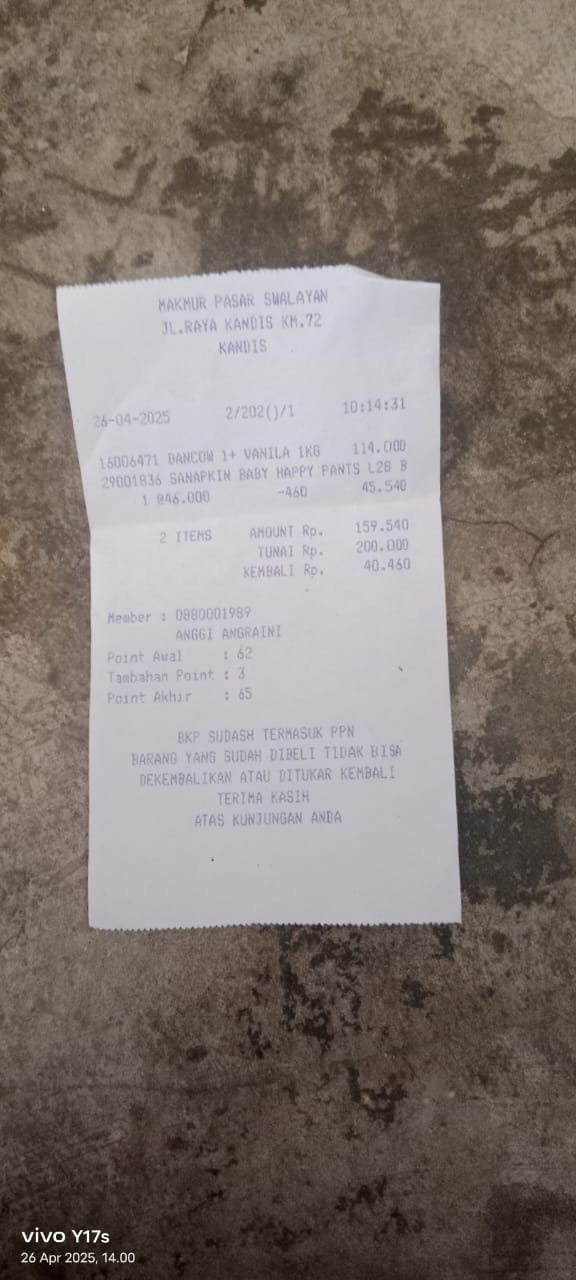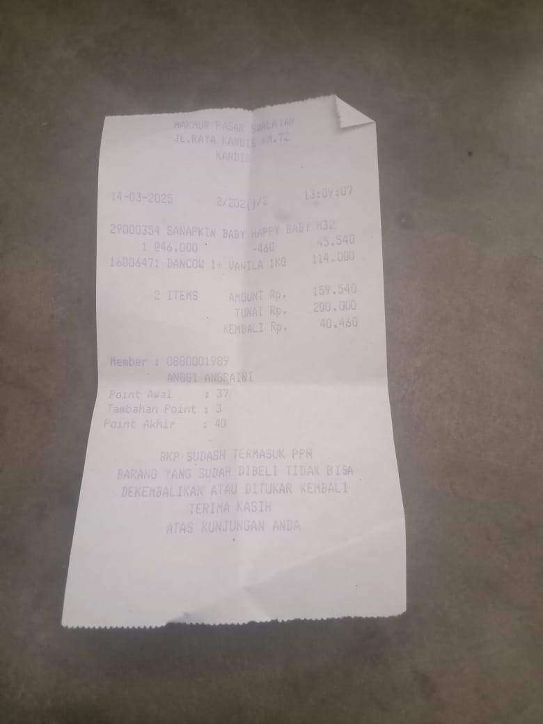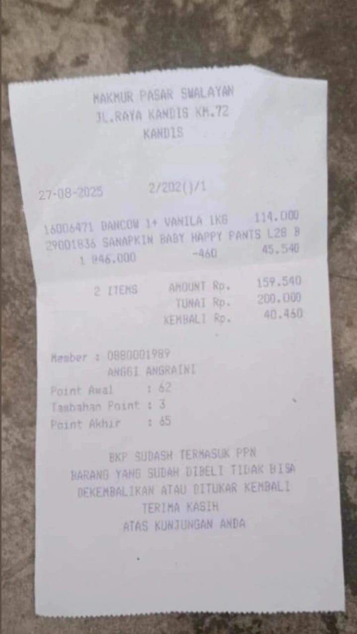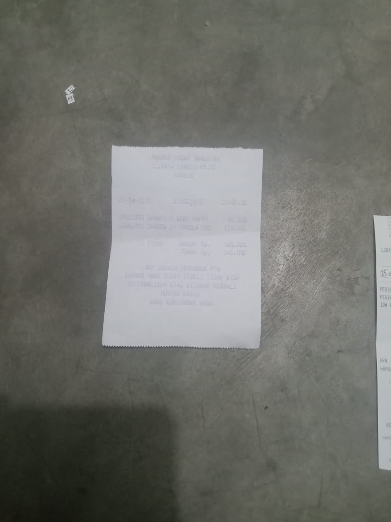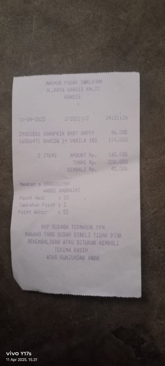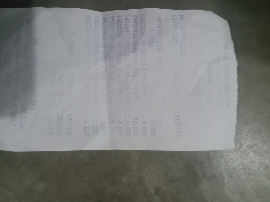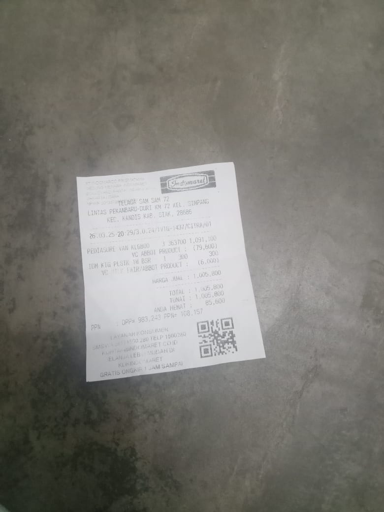 Dana digunakan untuk 1. Susu pediasure Rp373.000 x 3kaleng = Rp 1.119.00 2. Susu dan caw 1kg Rp114.000 3. Pempes ukuran L sweety Rp60.0002025-11-25 09:24:01