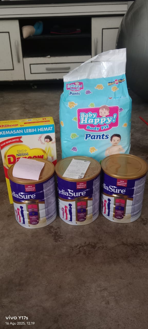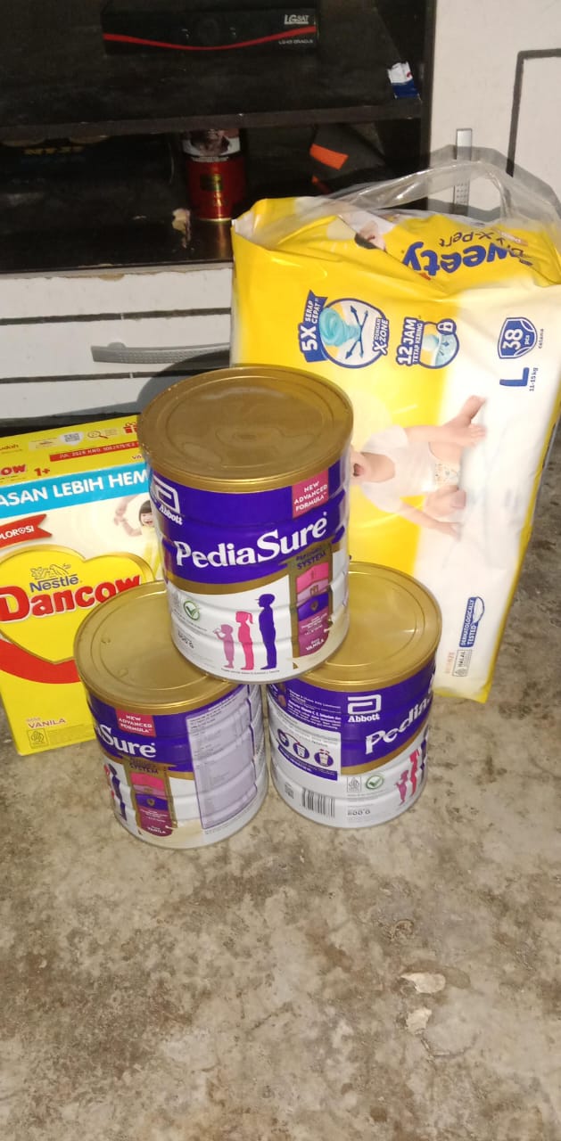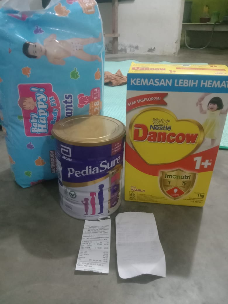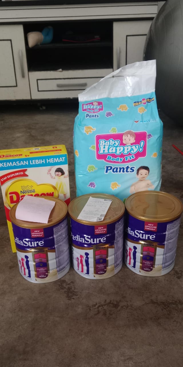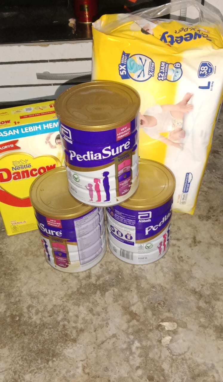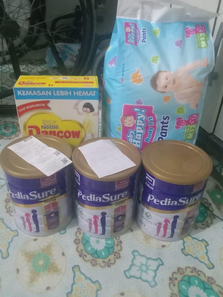 Alhamdulillah juga, dana donasi kemarin sudah Azril belanjakan untuk membeli susu dan popok. Sisa uang dari pembelian susu Azril gunakan untuk tambahan makanan bergizi.