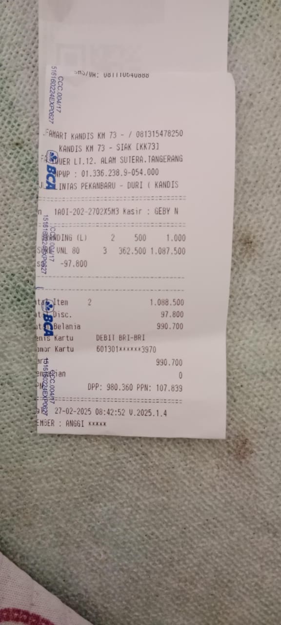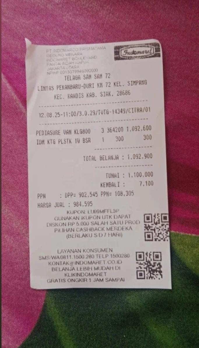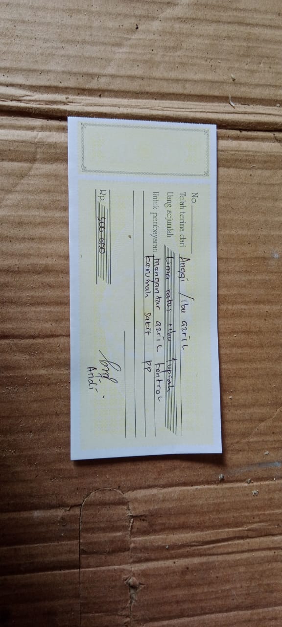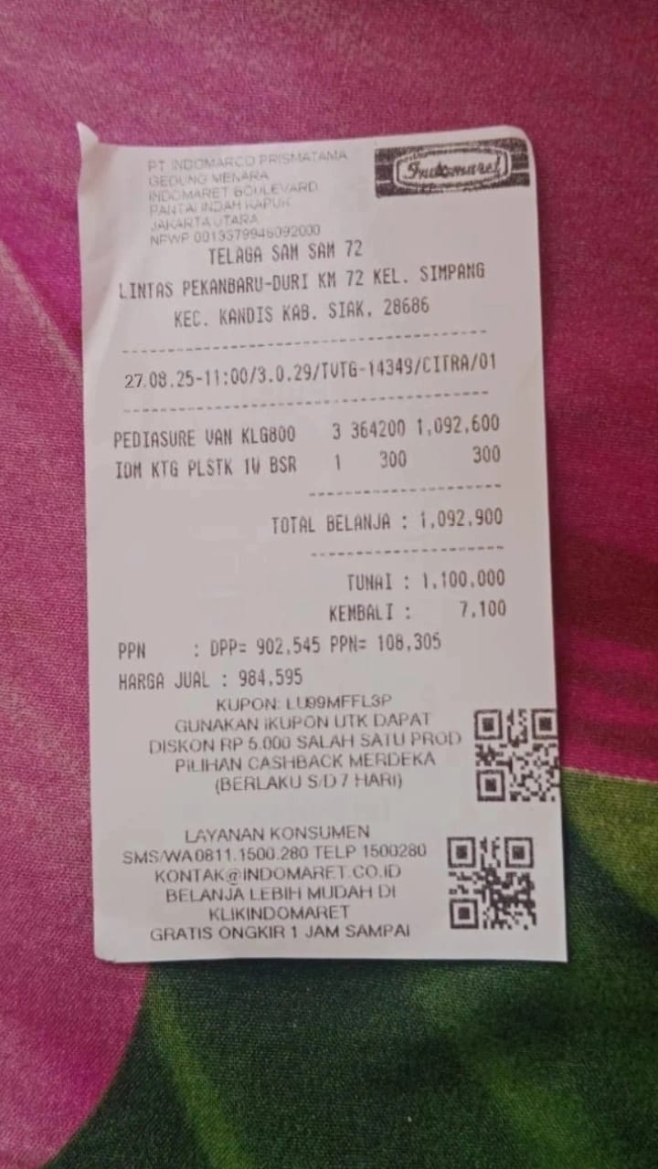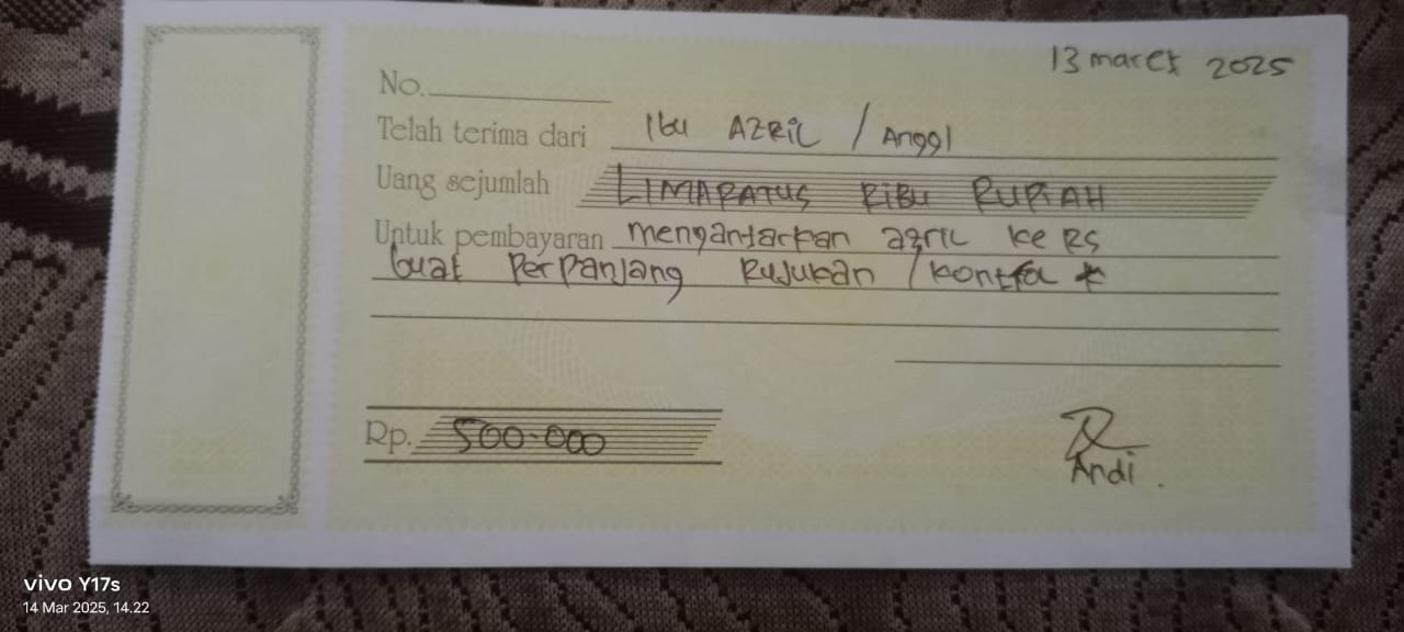 Dana digunakan untuk 1. Susu pediasure Rp364.000 x 3 kaleng = Rp1.092.000 2. Susu dancow 1 kg Rp115.000 3. Pampers ukuran M Rp48.000 4. Reimburse obat azril Rp85.000 5. Sewa mobil + tol ke RS awal bros ahmad yani Rp550.000 6. Biaya konsumsi kontrol ke RS Rp100.0002025-03-13 08:48:08