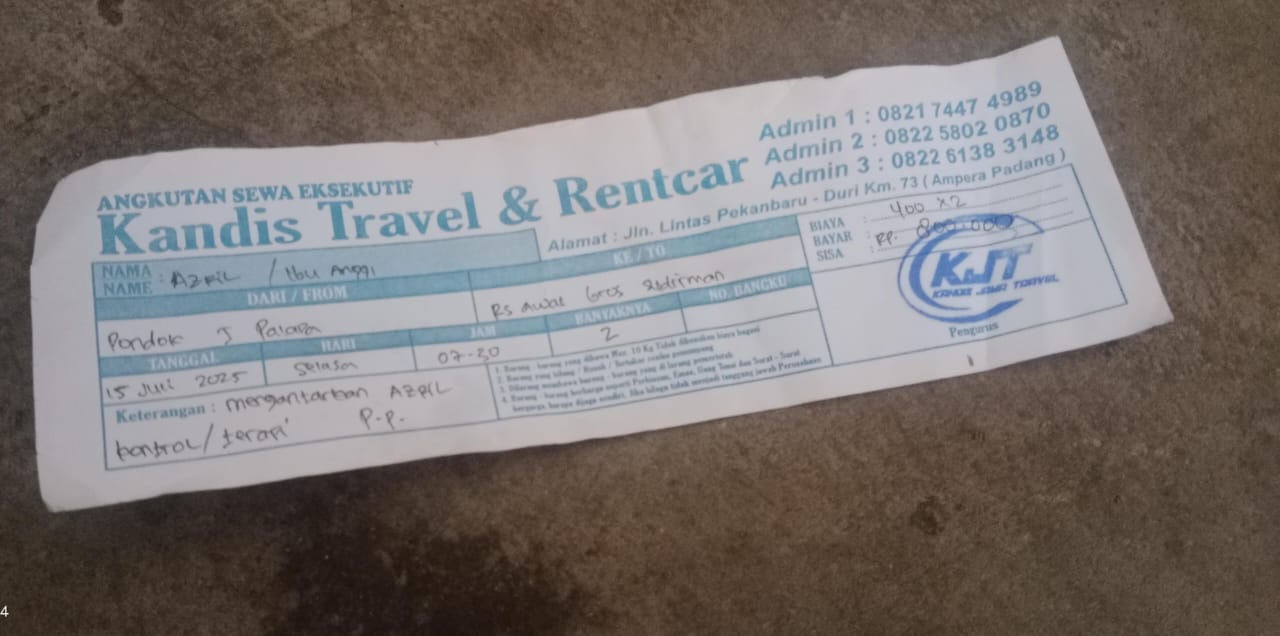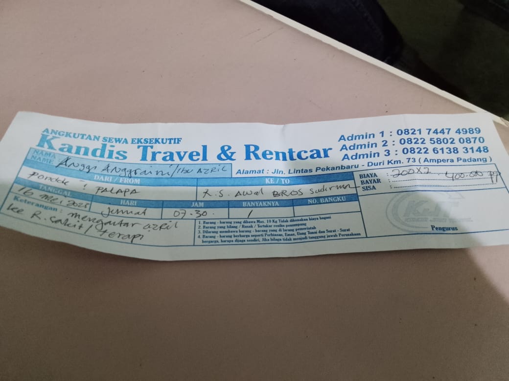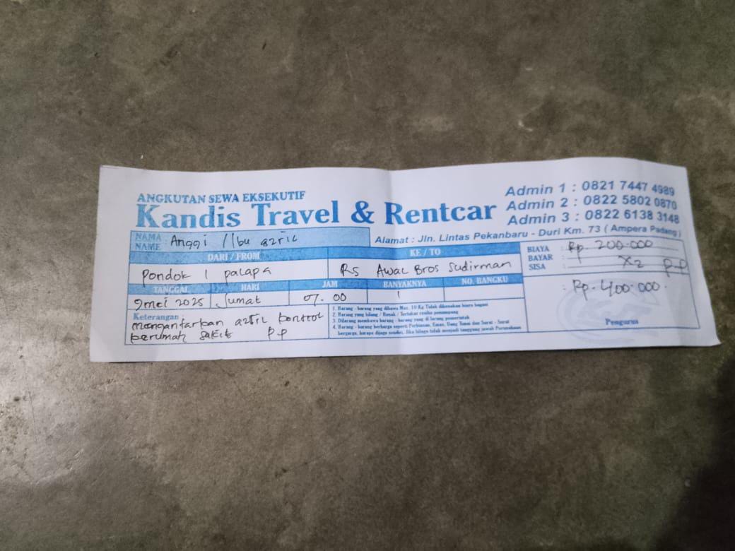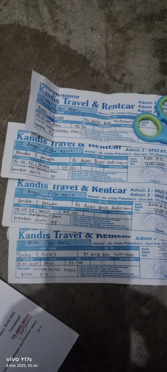 Dana digunakan untuk 1.Travel pulang pergi rumah ke RS awal bros Rp400.000 x 3 hari = Rp1.200.000 2. Reimburse travel rumah ke RS awal bros tanggal 30 April = Rp400.000 3. Uang makan azril selama 3 kali kerumah sakit Rp300.0002025-05-05 09:39:55