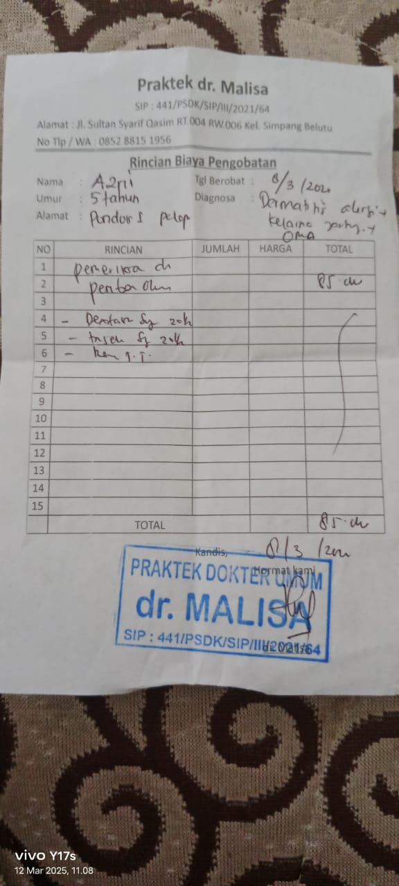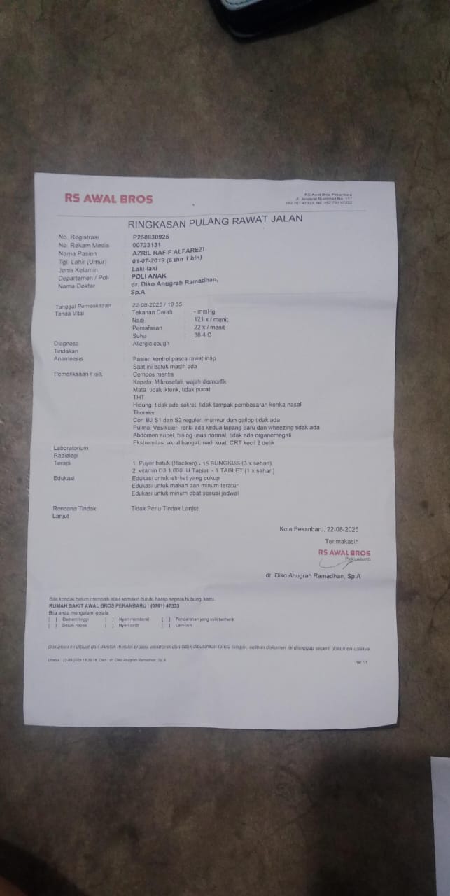 Syukurlah, kabar Azril saat ini sehat, hanya saja tangan dan kakinya kembali gatal-gatal. Kemarin sudah diperiksa ke dokter umum, sempat membaik, tapi karena sering digaruk, lukanya belum kering sepenuhnya. Saat kontrol untuk perpanjangan rujukan, dokter juga memberikan resep obat untuk mengatasi gatalnya. Doakan ya, semoga Azril cepat sembuh.
