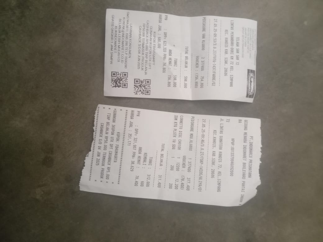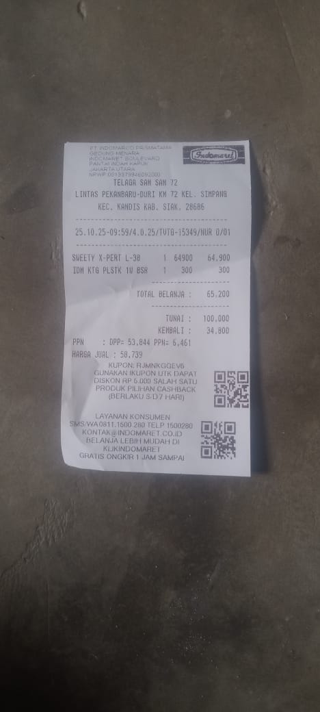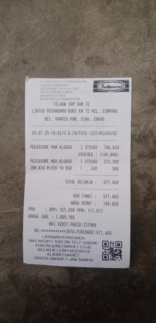 Dana digunakan untuk 1. Susu pediasure 345.000 x 3kaleng = Rp1.035.000 2. Reimburse Susu dancaw 1kg Rp114.000 3. Reimburse Pempes ukuran L Rp46.000 4.reimburse susu pediasure Rp339.000 5.travel buat tanggal 10 dari pondok 1 Palapa ke RS ahmad yanian PP Rp400.000 x 2 orang= Rp800.000 6. Konsumsi di RS Rp100.0002025-09-11 09:10:08