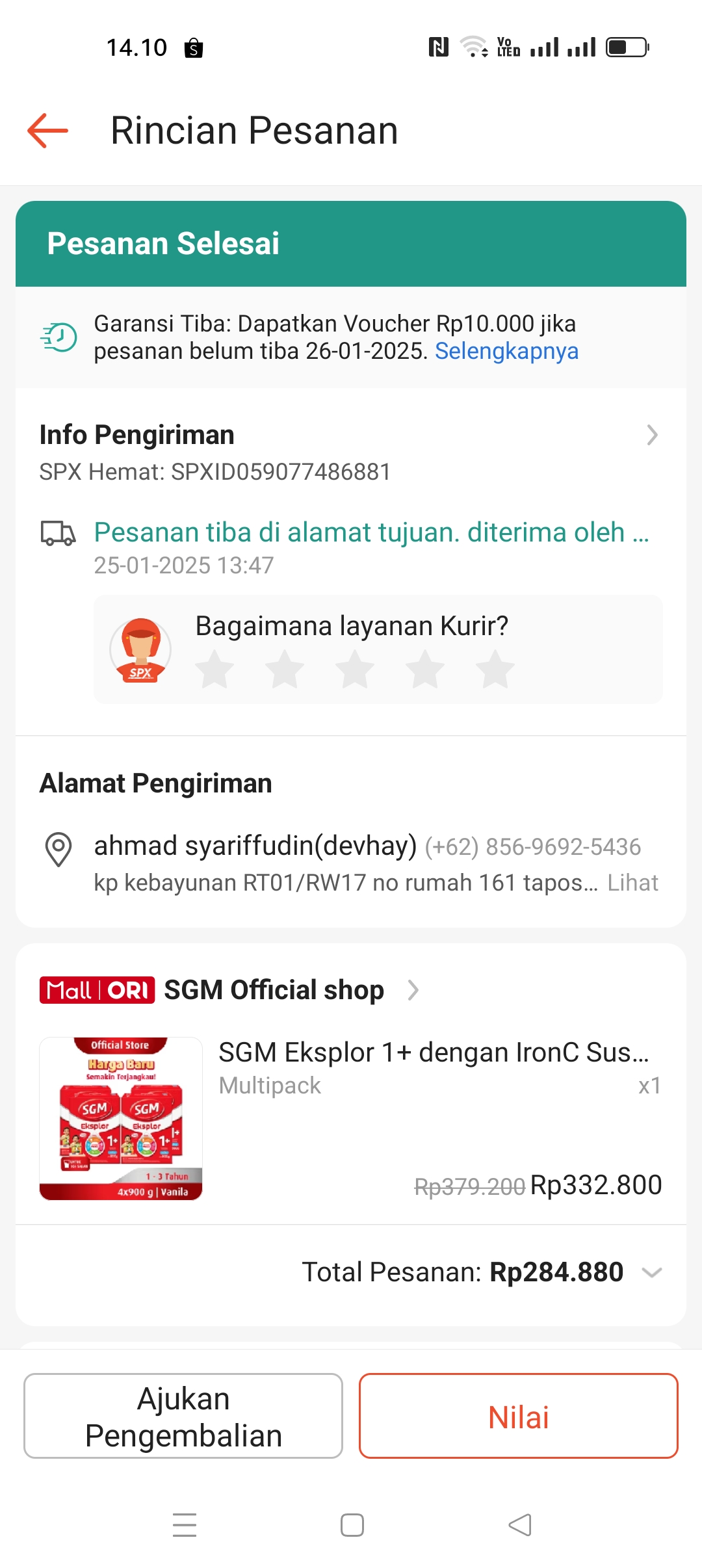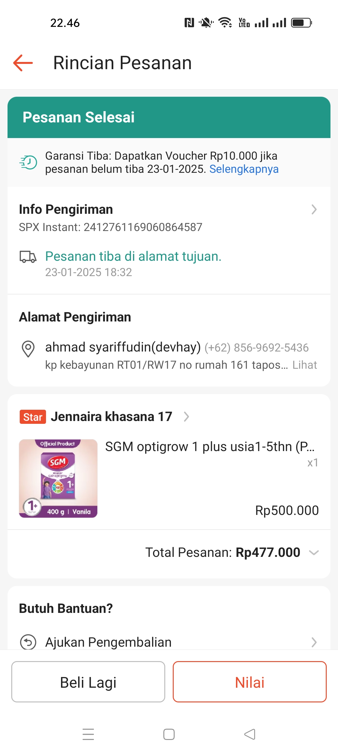 Dana digunakan untuk 1. Susu SGM gain Rp99.000 x 5 pcs = Rp495.000 2. Susu Sgm 1+ 900gram Rp87.000 x 5 pcs = Rp435.000 3. Pampers Rp50.000 4. Terapi wicara Rp250.000 x 2 = Rp500.000 5. Konsumsi selama terapi Rp150.000.2025-01-23 11:54:19
