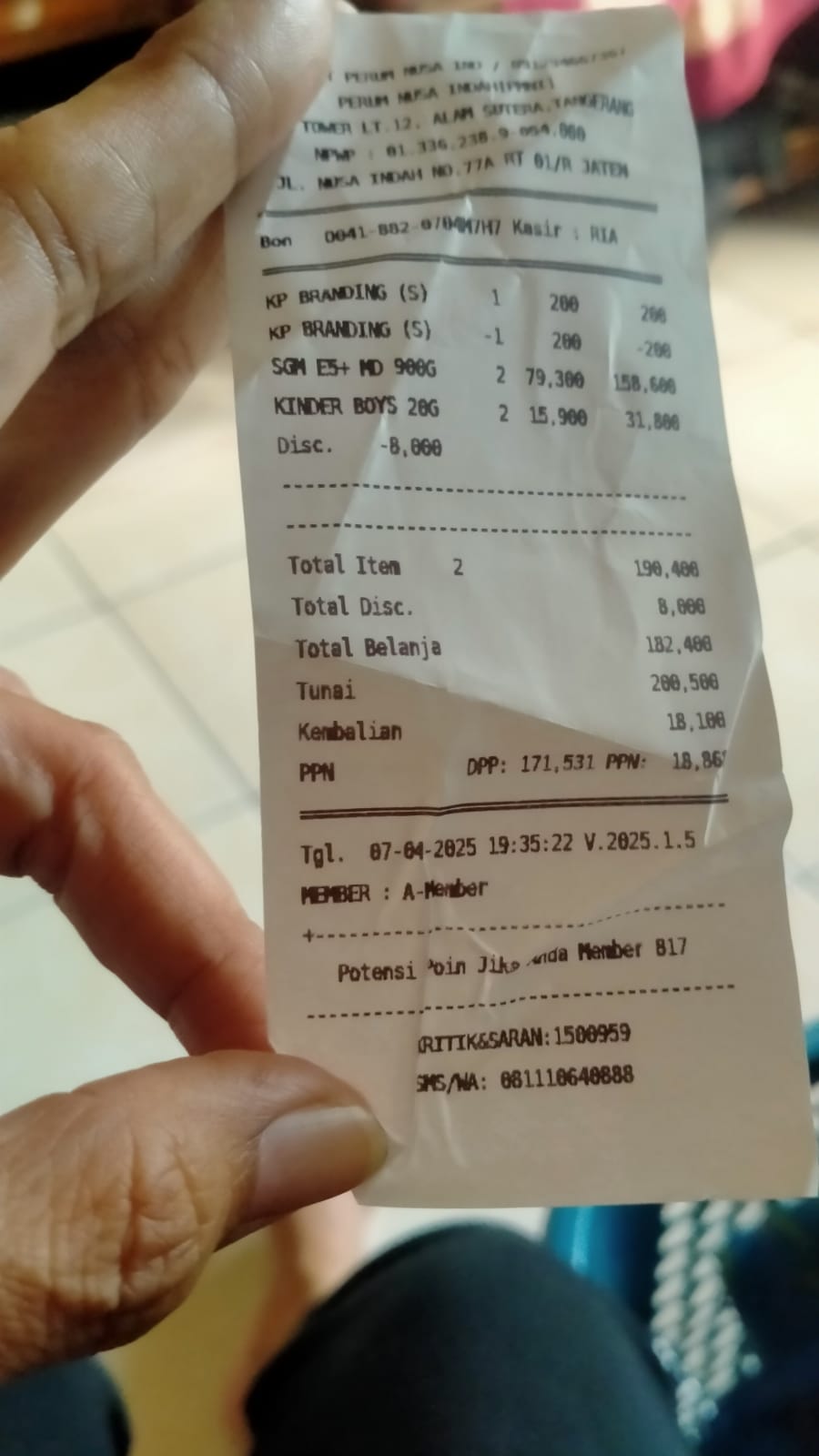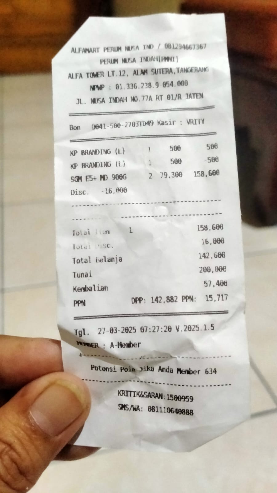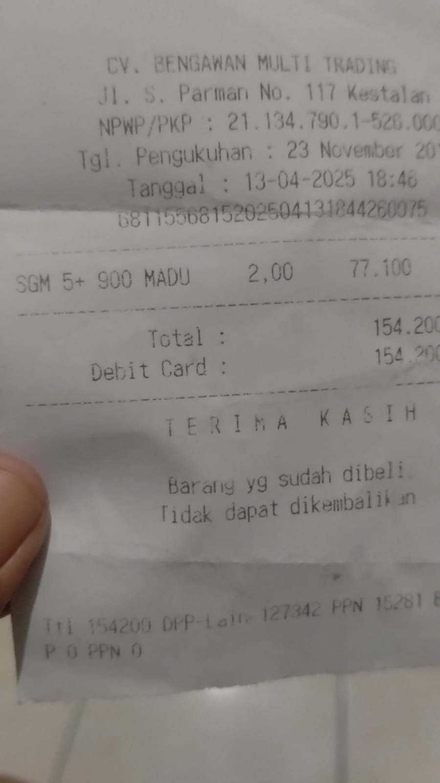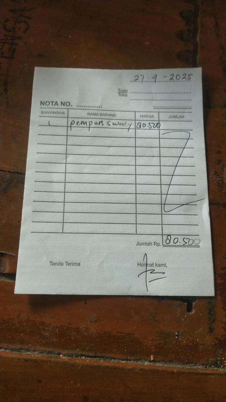 Dana digunakan untuk 1.Susu SGm 5 Rp79.900 x 4 dus= Rp319.600 2.Pampers sweaty Rp85.000 x 2 ball =Rp171.000 3. Transportasi kontrol pp Rp60.0002025-03-28 09:32:30