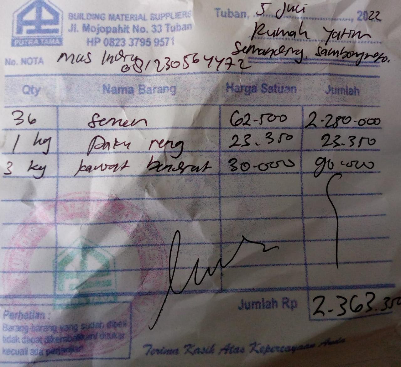 Dana akan digunakan untuk pembelian bahan material semen sebanyak 36 Sak2022-07-06 07:20:29
