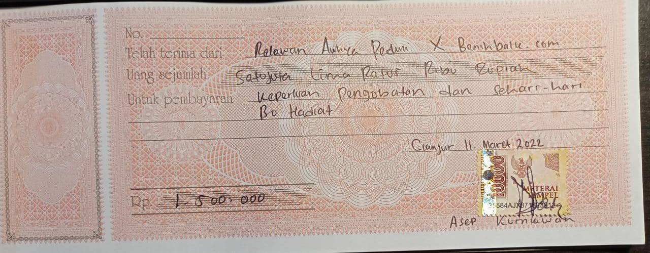 Kami mau mengabarkan kalau donasi diterima langsung oleh Bu Hadiat dan Pak Asep (Suaminya) dalam bentuk uang tunai untuk kebutuhan makan dan nutrisi Bu Hadiat.