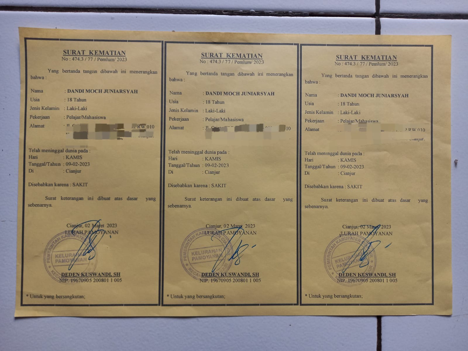 Aku ingin mengabarkan kabar duka mengenai anakku “Dandi” bahwa ia telah meninggal dunia.