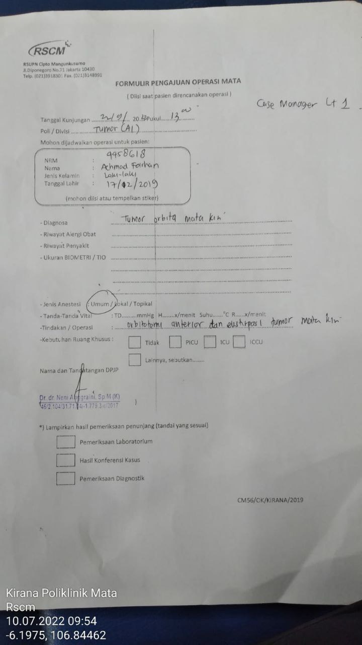 Kami mau mengabarkan kondisi Farhan yang menjalani kontrol ke Poli Nutrisi dan Metabolik pada 1 September 2022. Dokter mengatakan jika Farhan harus mengganti susu yang sekarang dikonsumsi untuk menaikkan berat badan agar terhindar dari gizi buruk.