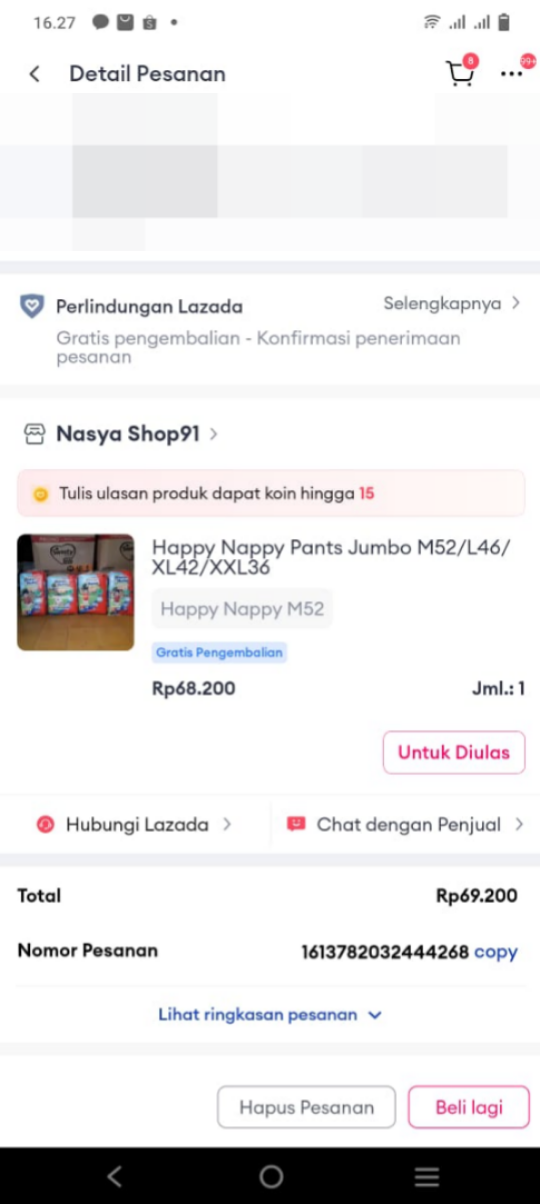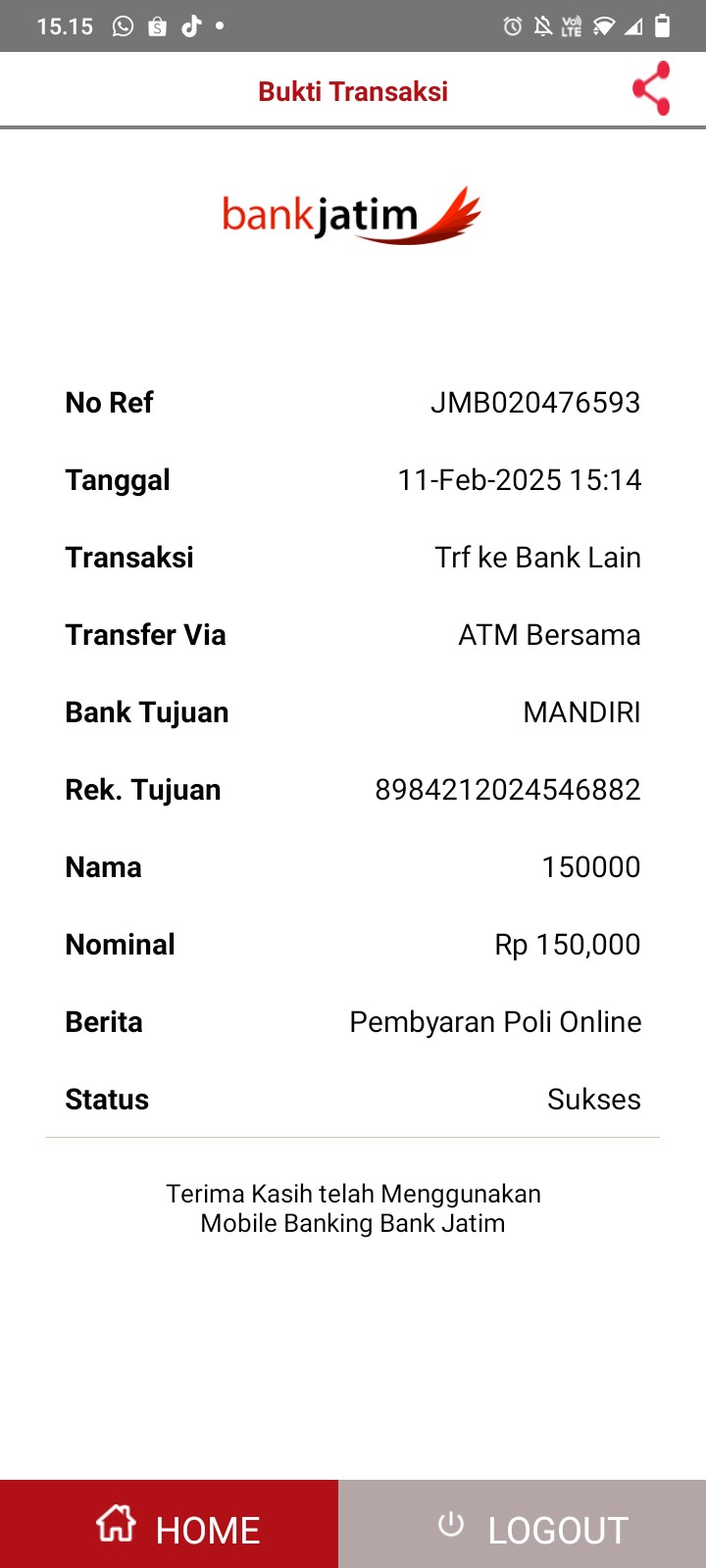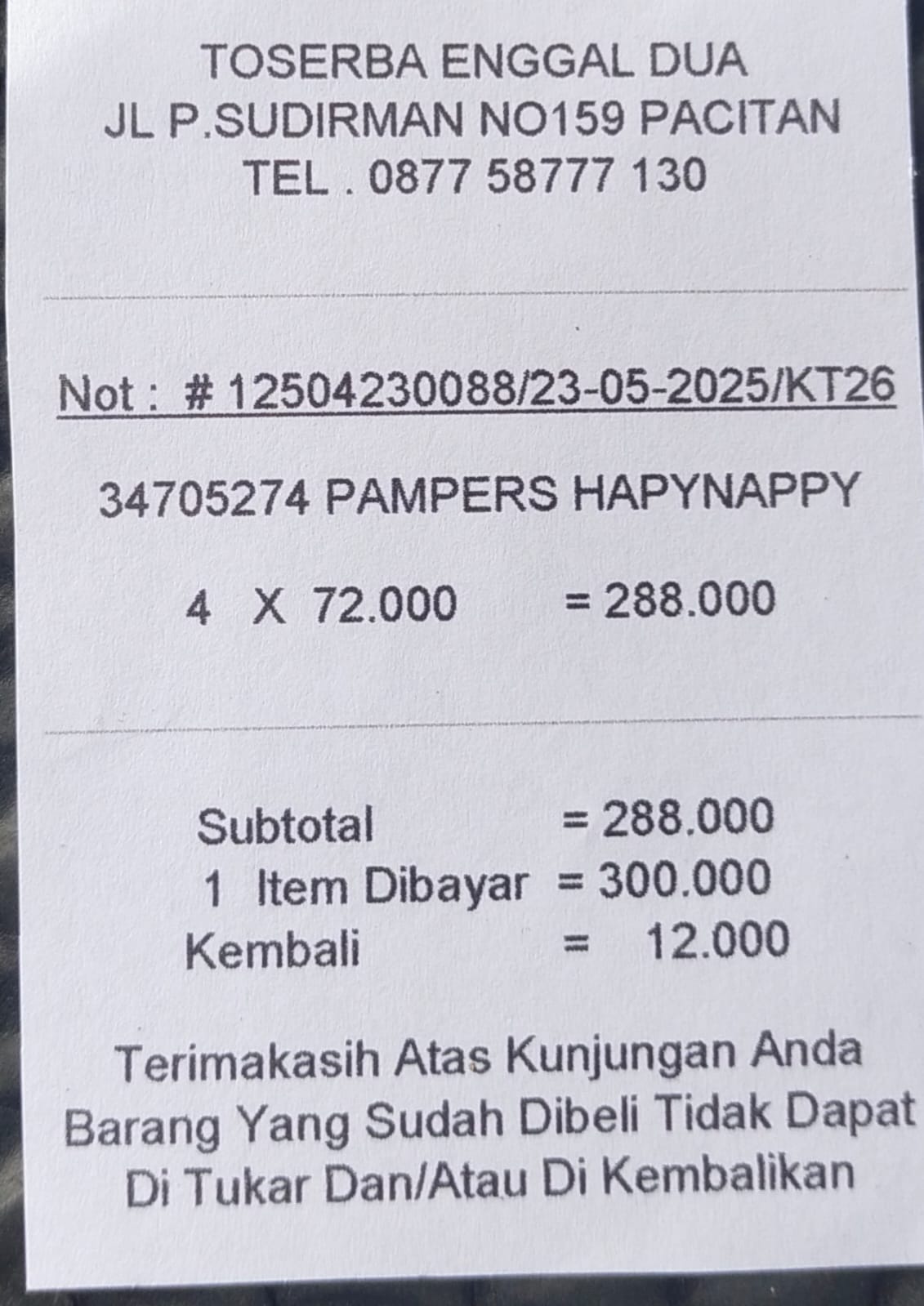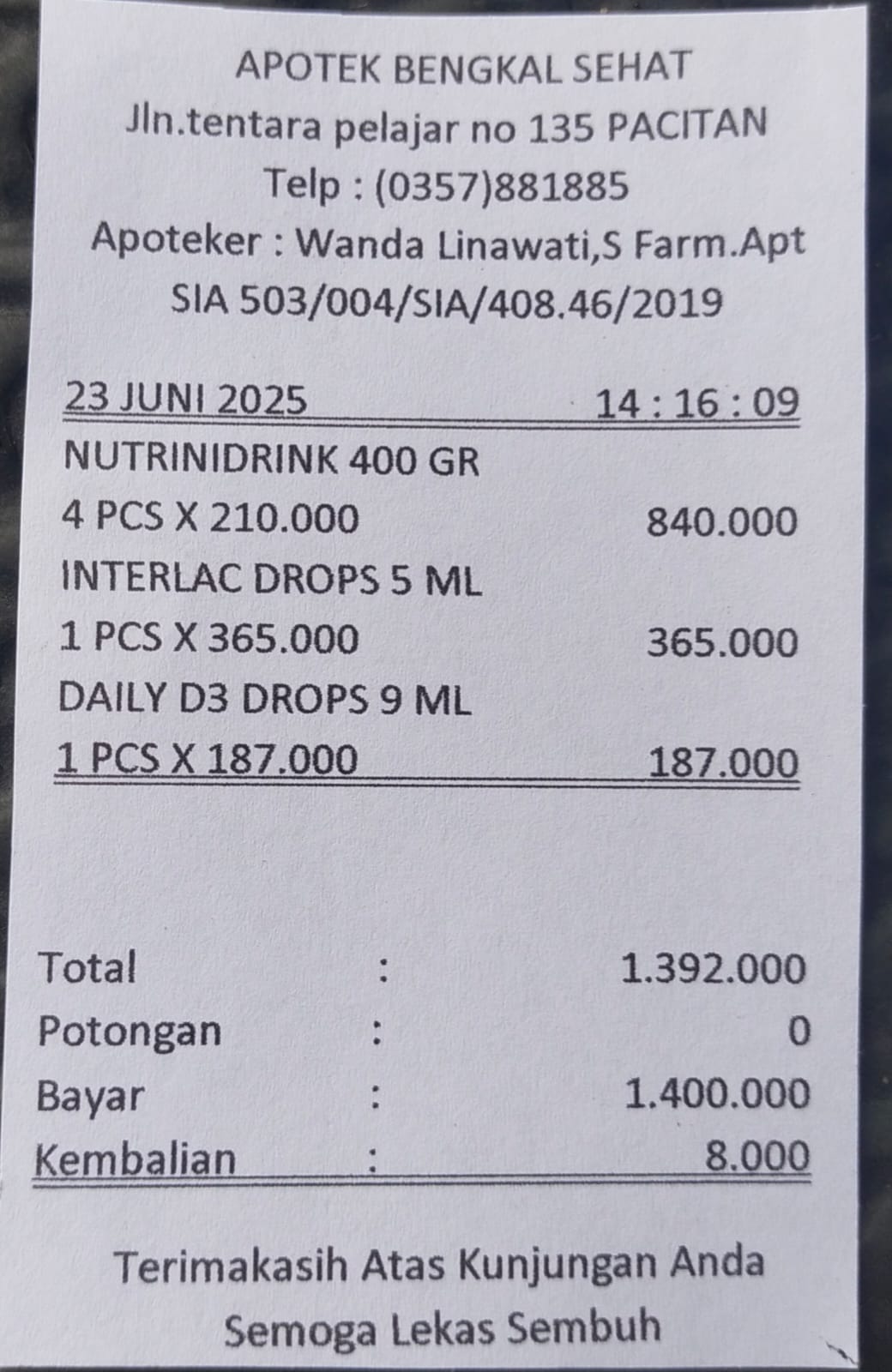 Dana digunakan untuk 1. Susu nutrinidrink 400 mg Rp200.000 x 2 dus= Rp400.000 2. Pampers Happy nappy M52 Rp70.000 x 2 ball= Rp140.000 3. Vitamin Madu shoney Rp82.500 x 2 botol = Rp165.000 4. Obat Catropil Rp43.000 5.Poli online RS Harapan Kita Rp150.0002025-02-21 09:21:33
