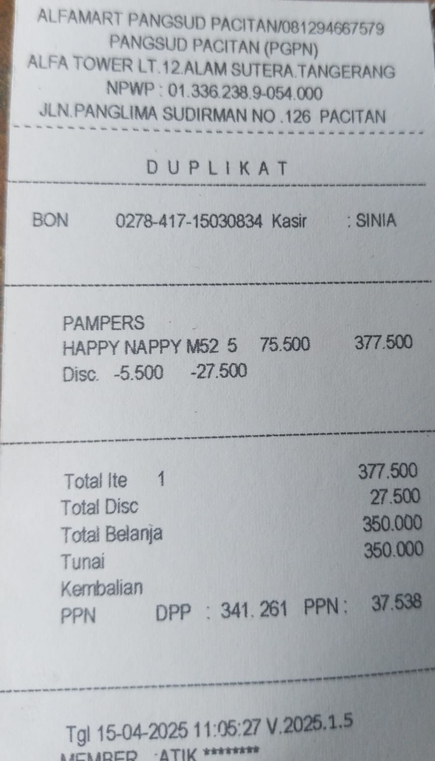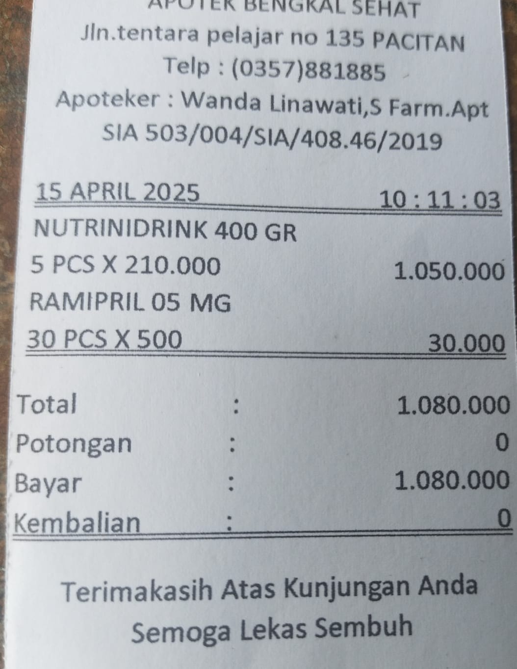 Dana digunakan untuk 1. Susu nutrinidrink 400 GR 5 pcs x Rp210.000= Rp1.050.000 2. Pampers Happynappy Rp69.000 x 5ball = Rp345.000 3. Obat Rami pril 05 Mg Rp30.0002025-04-16 10:00:43