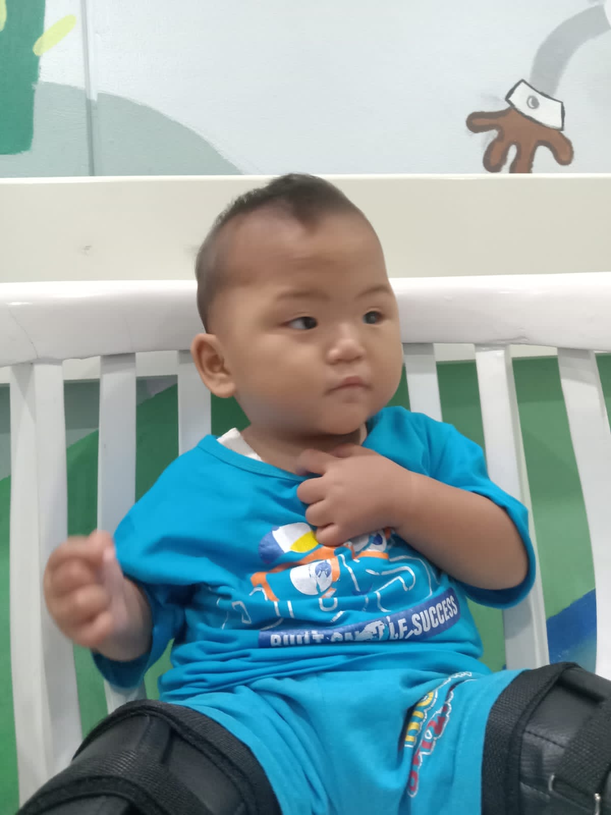 Karena sampai saat ini, Dewa belum bisa duduk dengan tegak dan masih dipegang atau harus dikasih penyangga di belakang atau punggungnya.
