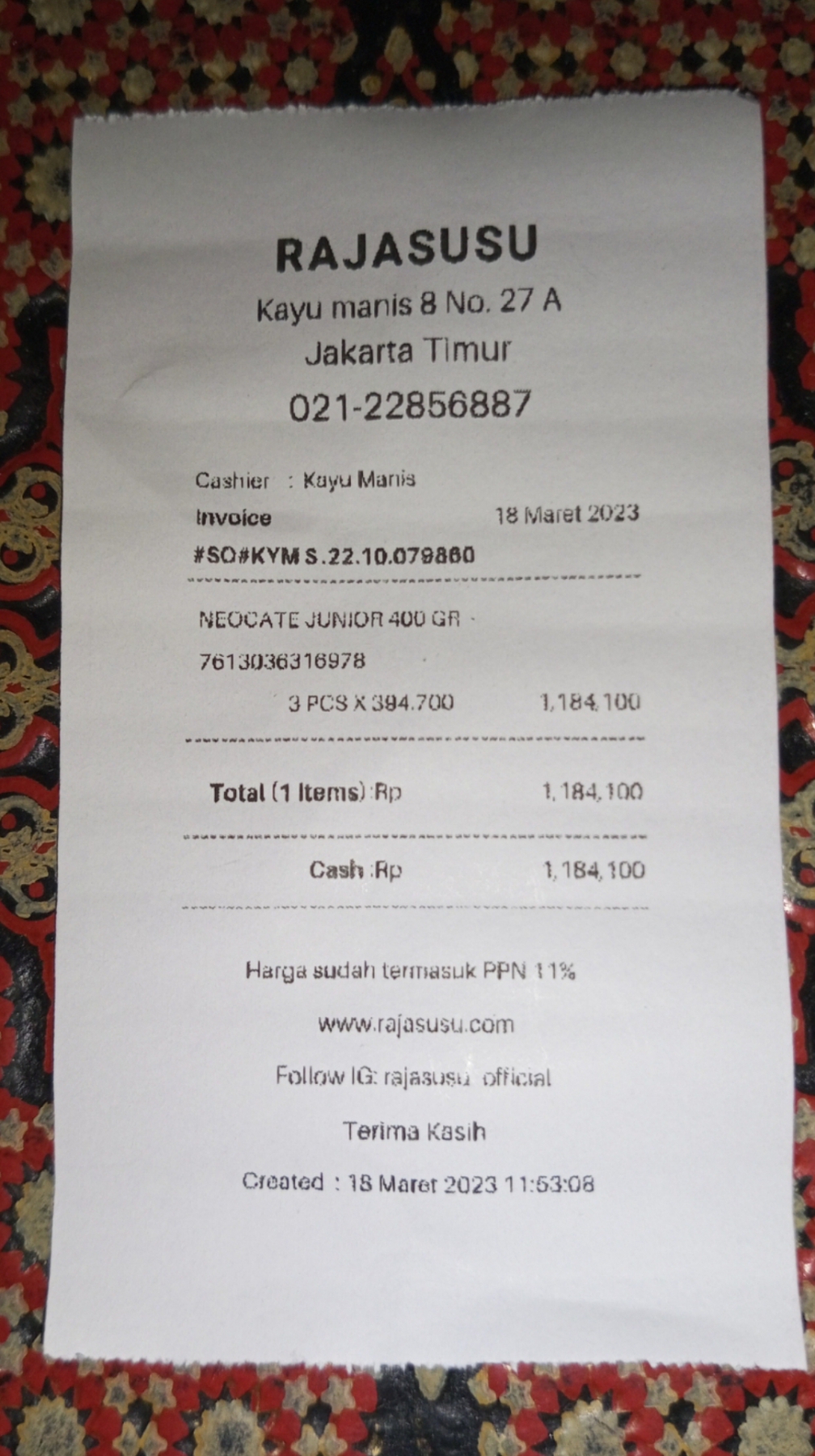 Dana digunakan untuk biaya penggantian pembelian Susu Neocate Junior 400 gr pada tanggal 18 Maret sebesar Rp1.184.100.2023-06-28 16:09:21