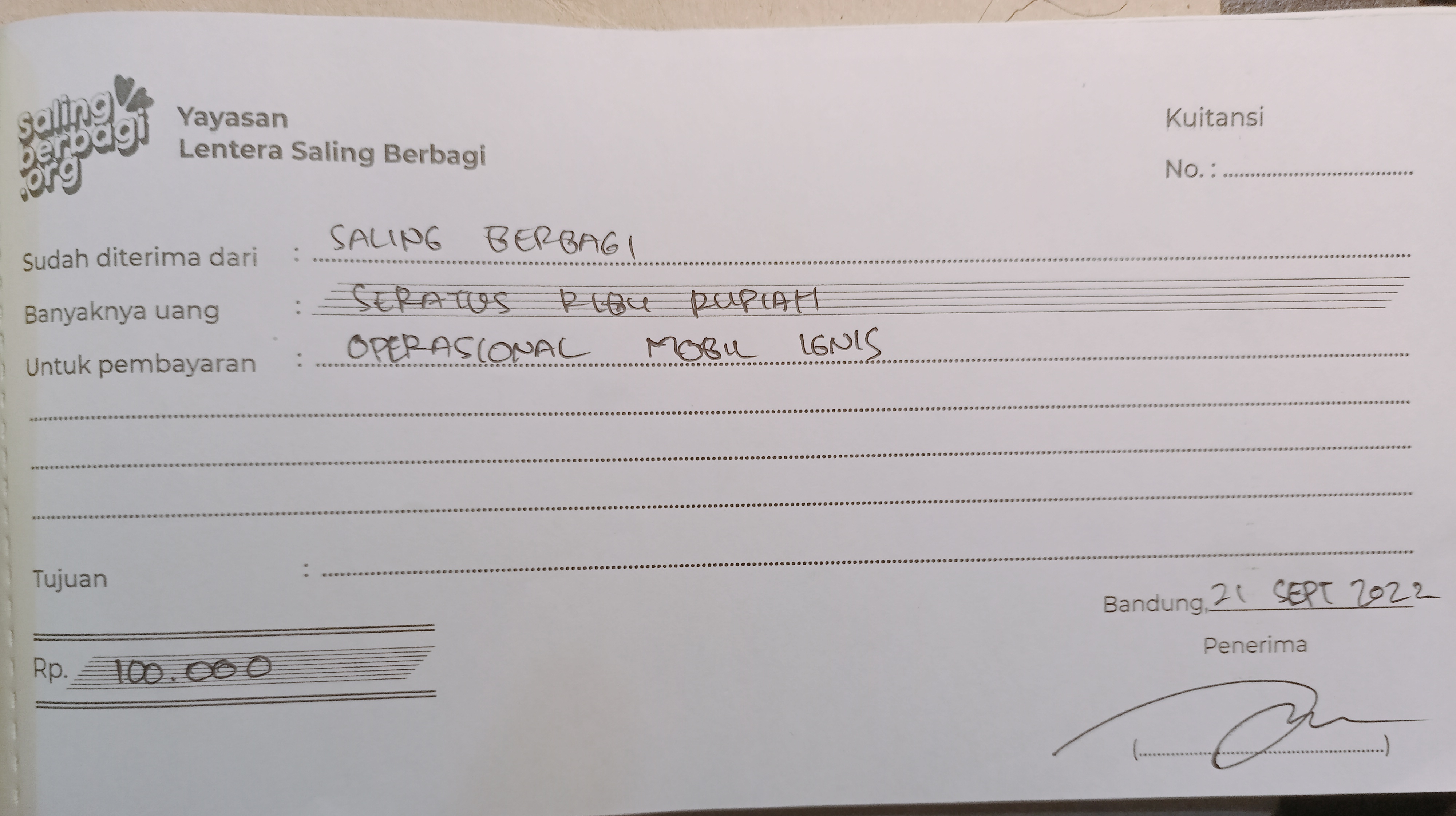 Izin kami untuk melaporkan penyaluran dana yang telah kami sampaikan kepada Dik Nia.