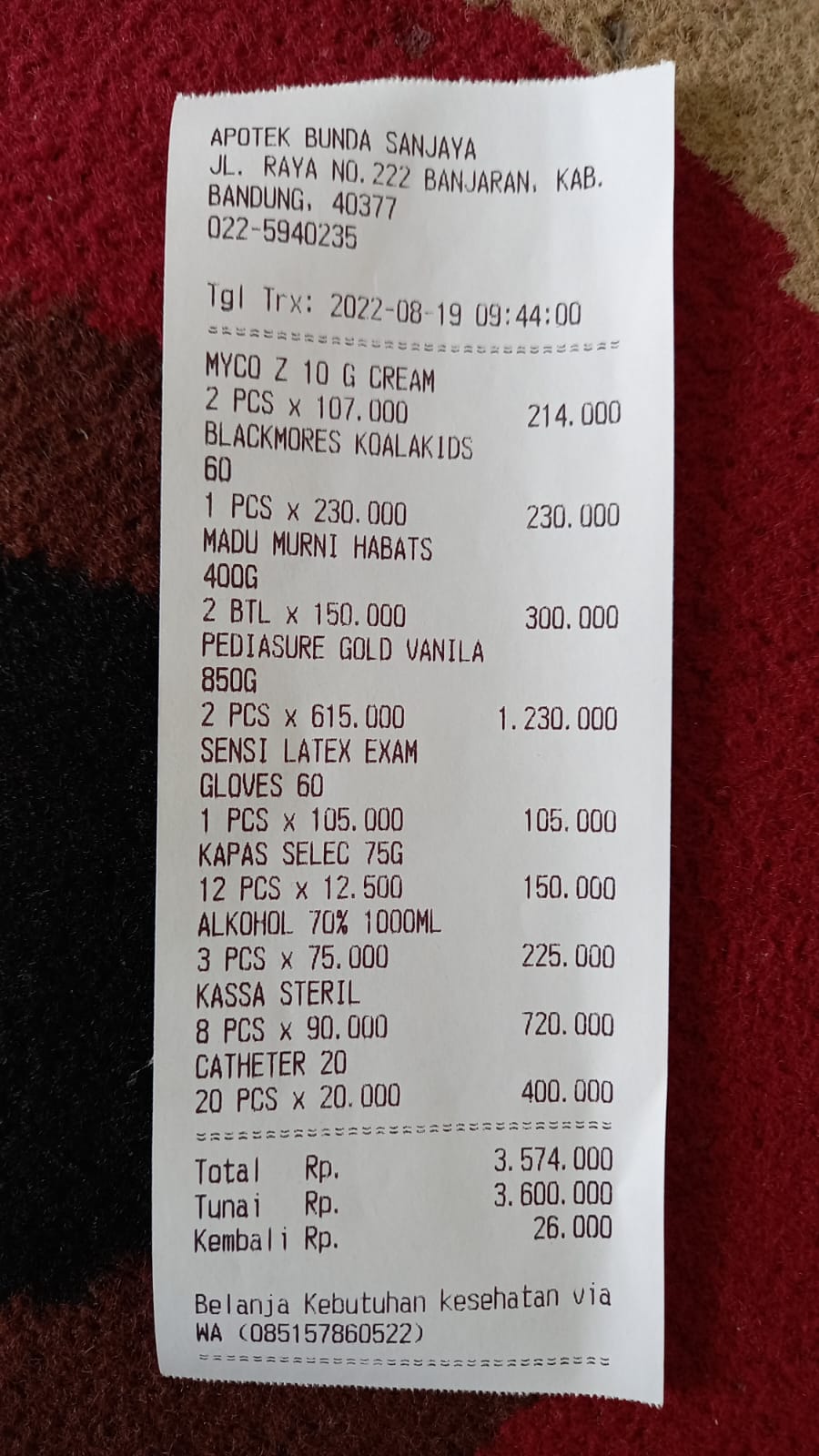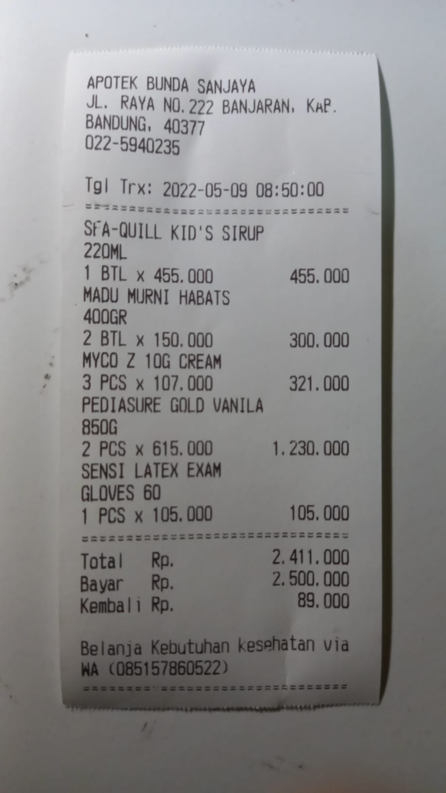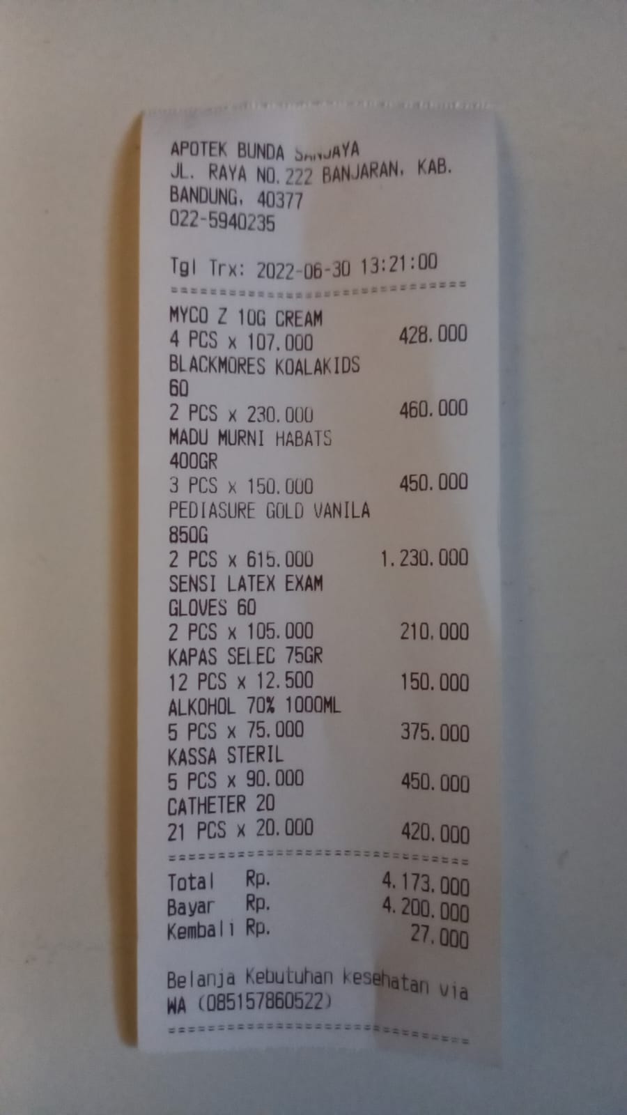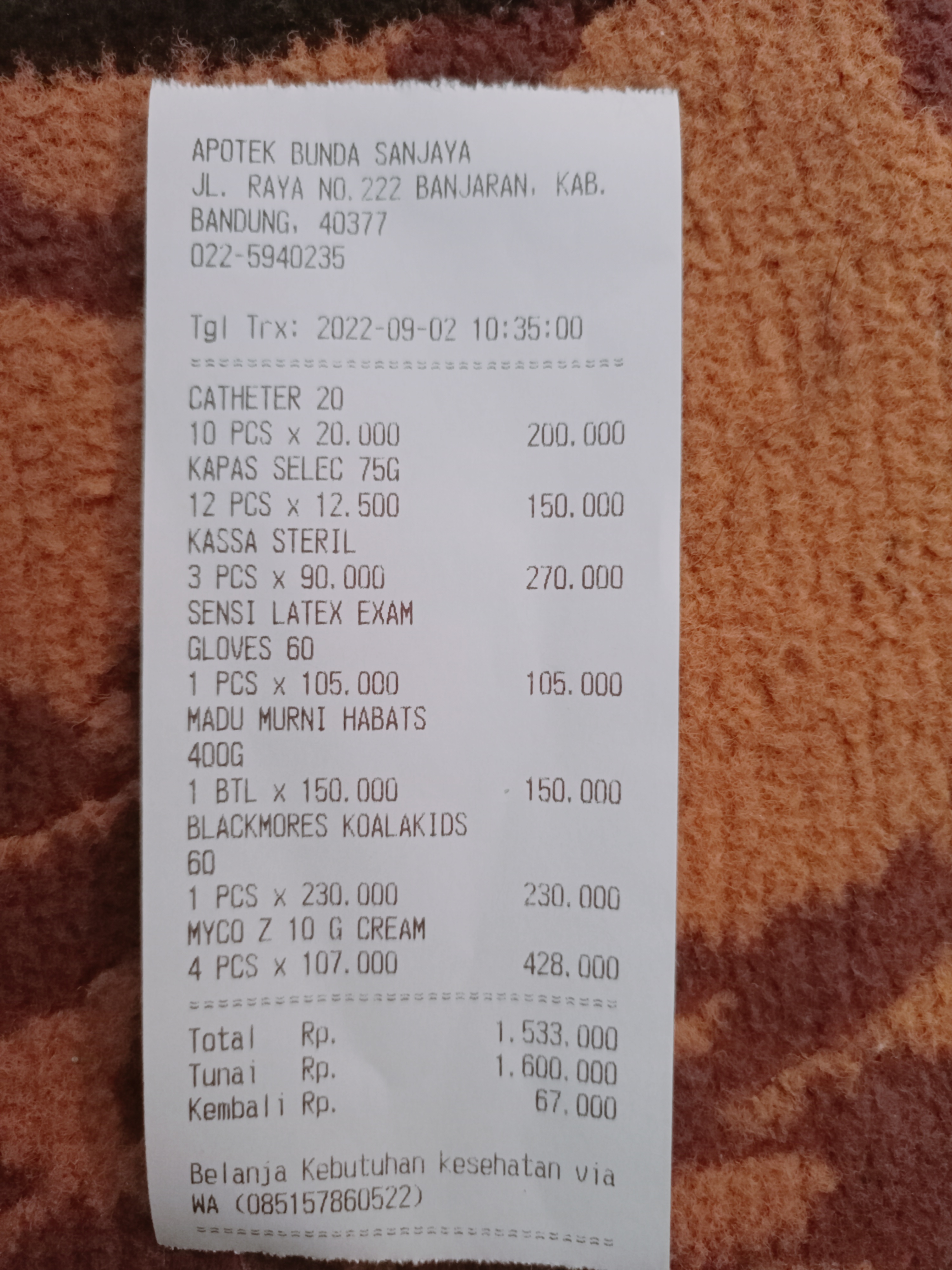 Dana digunakan untuk: 1. Transportasi sewa mobil Banjaran-RSHS untuk 4 kali perjalananx2 bulan 2.800.000 2. Selang Kateter RUSCH Folley Catether 2 way beli 20x2 bulan 800.000 3. Perban Tonasa Plester Anti Air 5 buahx 2 bulan 900.000 4. Alkohol ONEMED Antiseptic 1 liter 5 buahx 2 bulan 750.000 5. Kapas Selection Facial Cotton 12 buahx 2 bulan 288.000 6. Hand Glove Steril 40 Pack Trastid Aid Latex 2 buahx2 bulan 424.000 7. Susu Pediasure Gold 850g 2 buahx2 bulan 2.460.000 8. Madu Habbatusa2022-09-13 17:25:11
