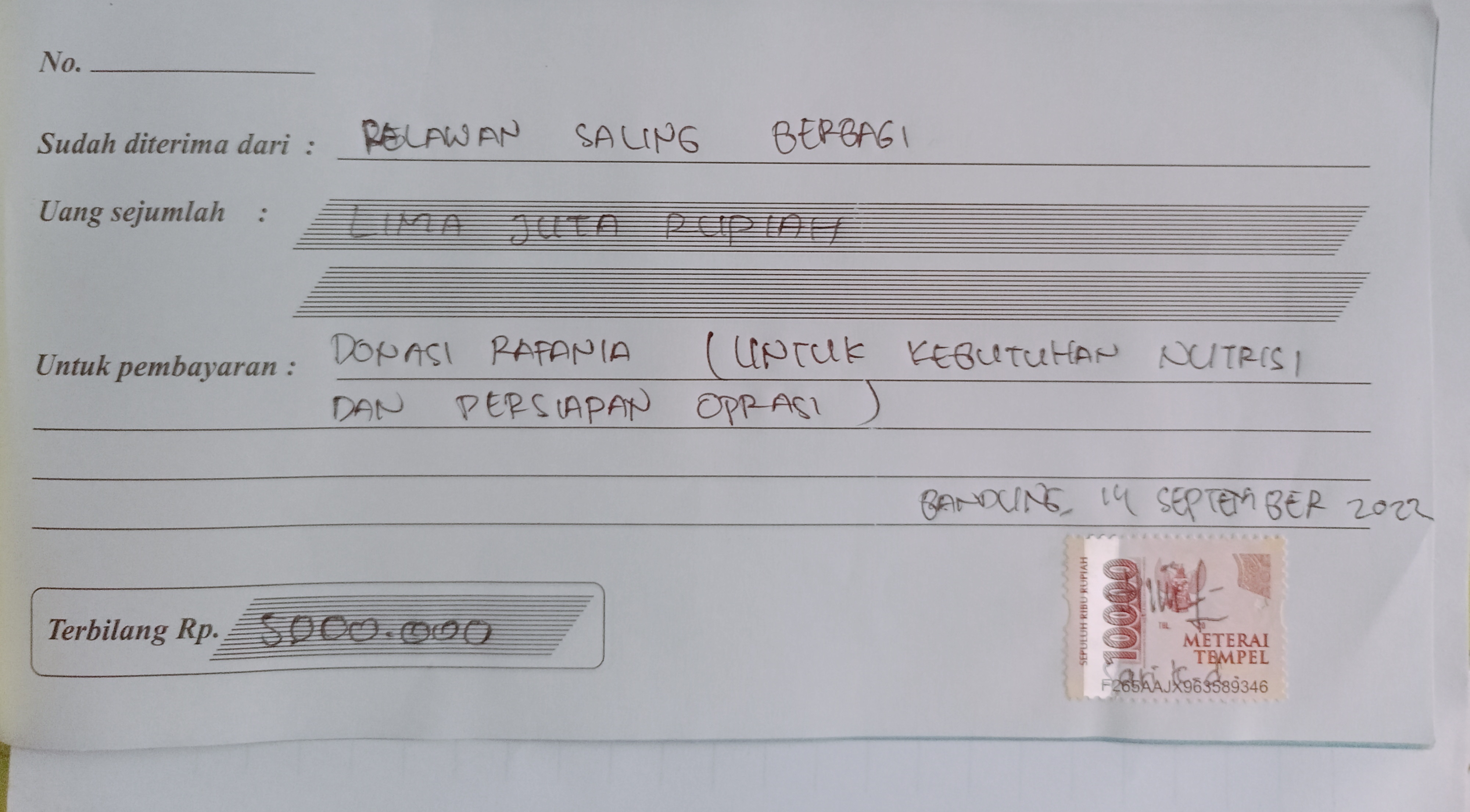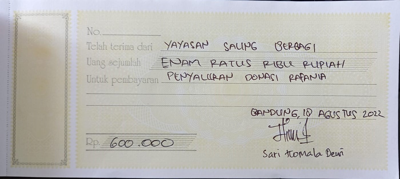 Pada Tanggal 14 April 2022 donasi yang disampaikan kepada Ibunda Rafania, diterima langsung Ibunda Rafania dalam bentuk uang tunai. Menurut Ibu Sari (Ibunda Rafania) rencananya uang tersebut akan digunakan untuk membeli kebutuhan nutrisi (susu, makanan pokok bergizi dll) dengan harapan berat badan Rafania bisa segera membaik agar dapat segera dilakukan penanganan operasi seperti yang disarankan dokter yang menanganinya.