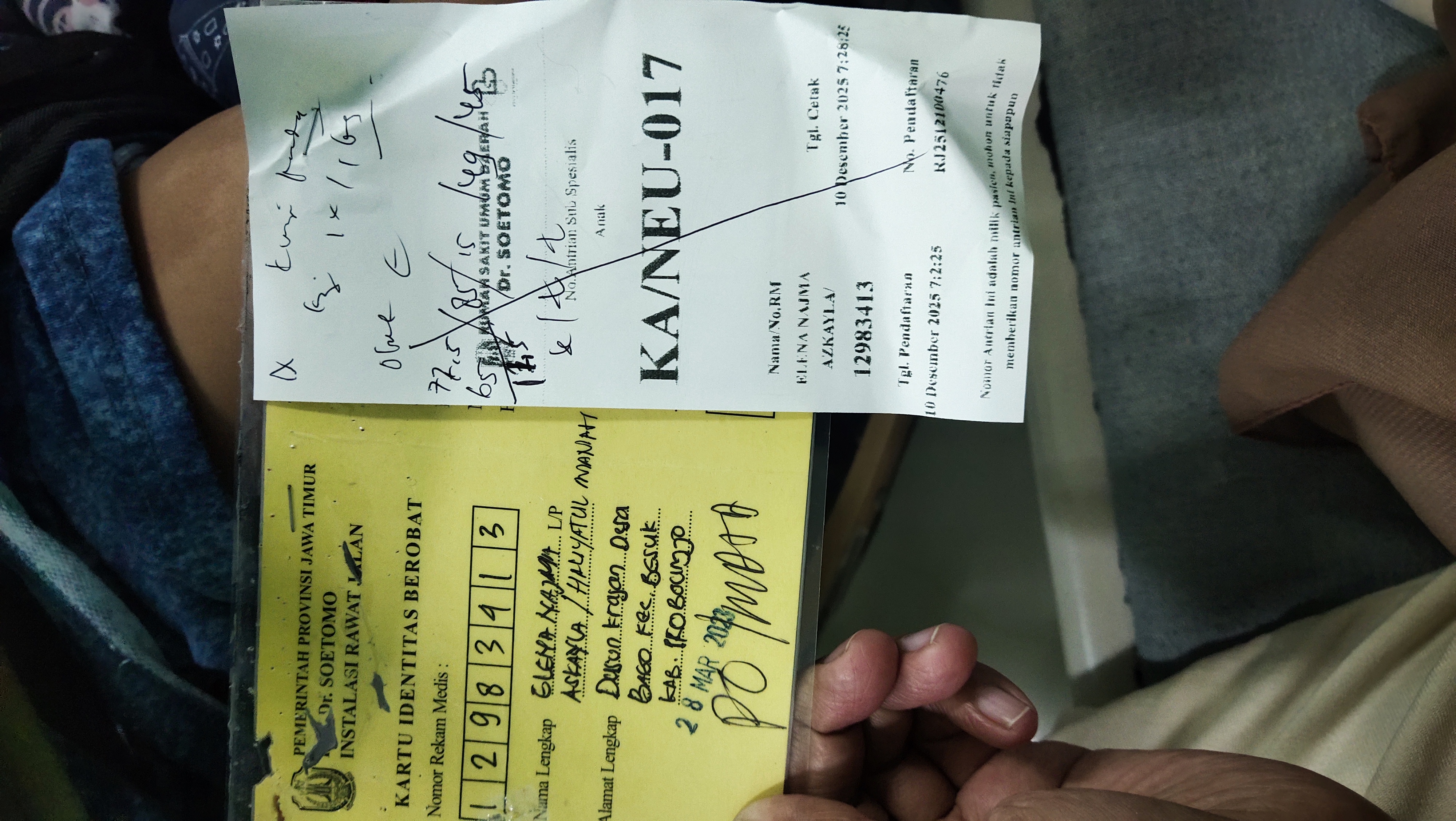 Dana digunakan untuk 1. Pampers makuku L 44 × 4ball Rp374.000 2. Reimrbuse tiket kereta api Probolinggo-RSUD Soetomo Surabaya Rp. 310.000 3. Tiket kereta api pulang RSUD Soetomo Surabaya - Probolinggo Rp. 300.000 4. Penginapan 4 hari selama di RSUD Soetomo Surabaya Rp 440.0002025-10-15 09:02:31