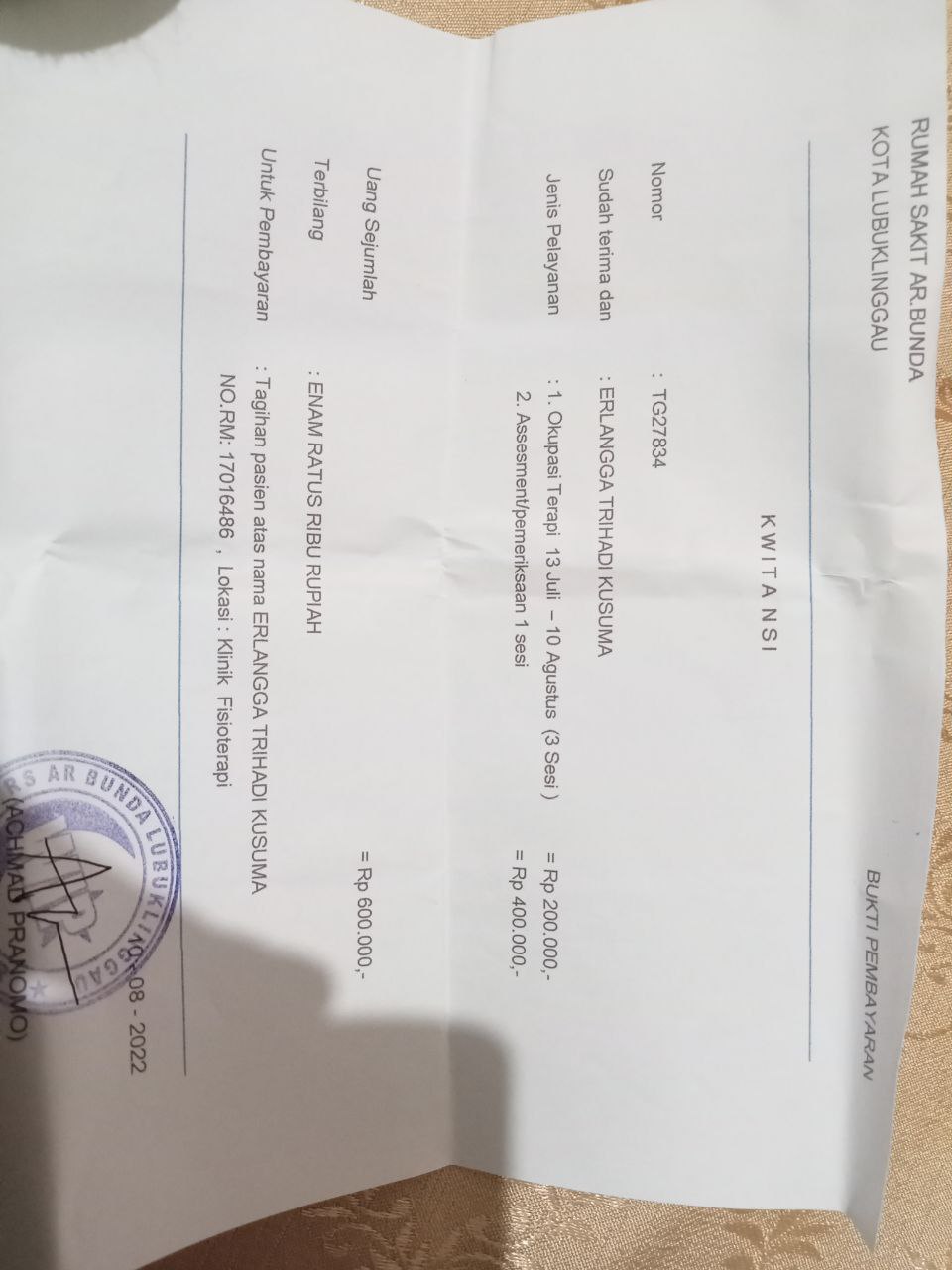 Erlangga masih rutin menjalani cek up dan terapi di RS AR Bunda Lubuklinggau dan harus terus menjalani terapi ke Rumah Sakit agar kondisinya semakin baik dan terpantau oleh dokter.