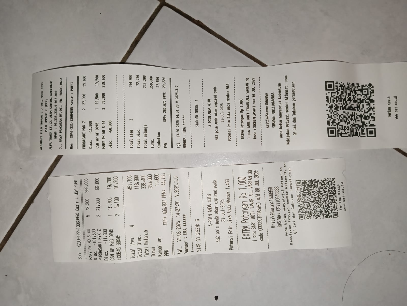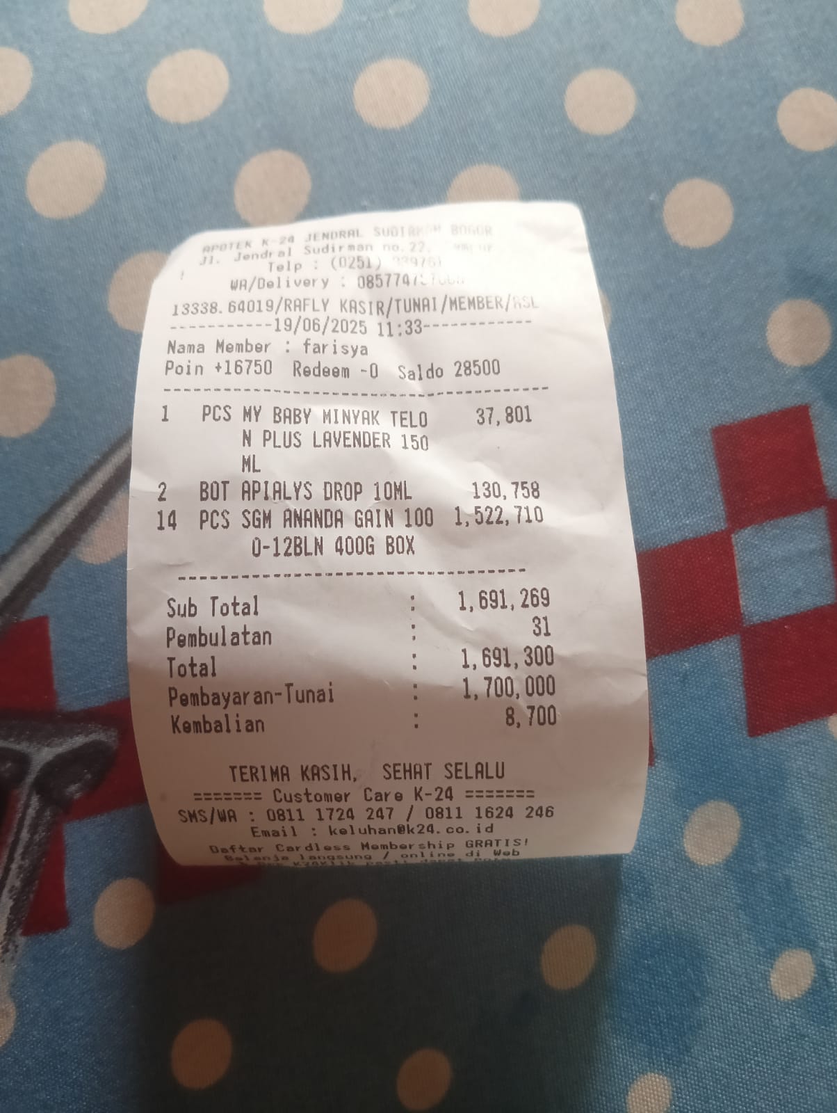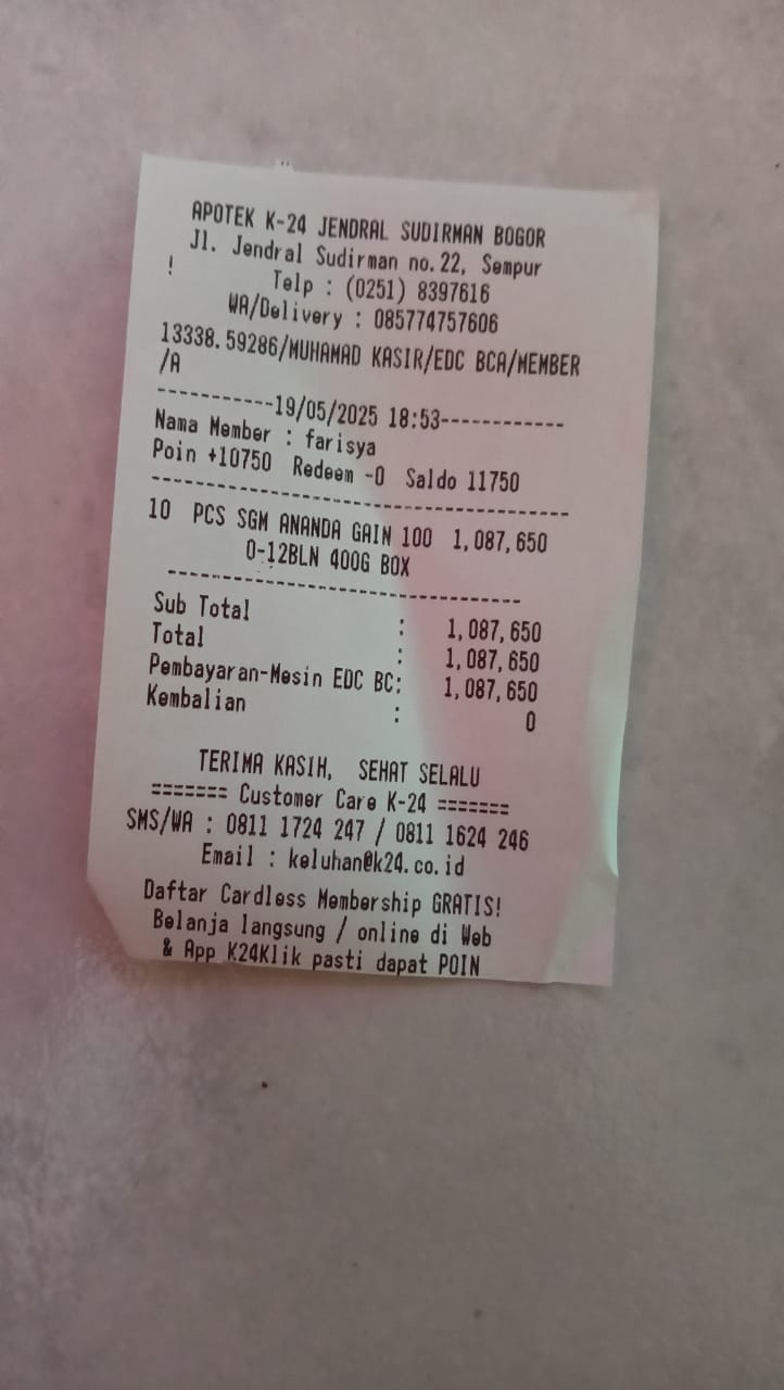 Dokumen pendukung 1. Susu SGM gain Rp108.800 x 14dus = Rp1.523.200 2. Vitamin Rp75.000 3. Minyak telon Rp79.5282025-06-19 09:20:48