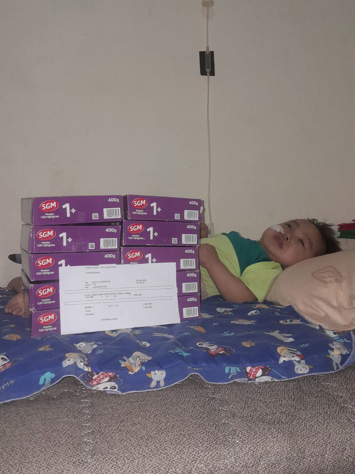 Dana digunakan untuk 1. Susu optigrow 1+ Rp100.000 x 10 pcs = Rp1.000.000 2. Biaya konsumsi selama pengobatan Rp200.000.2025-03-21 09:44:22