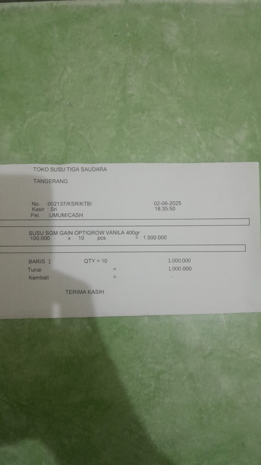 Dana digunakan untuk Susu SGM Optigrow Rp100.000 x 10 dus = Rp1.000.0002025-06-17 09:10:22