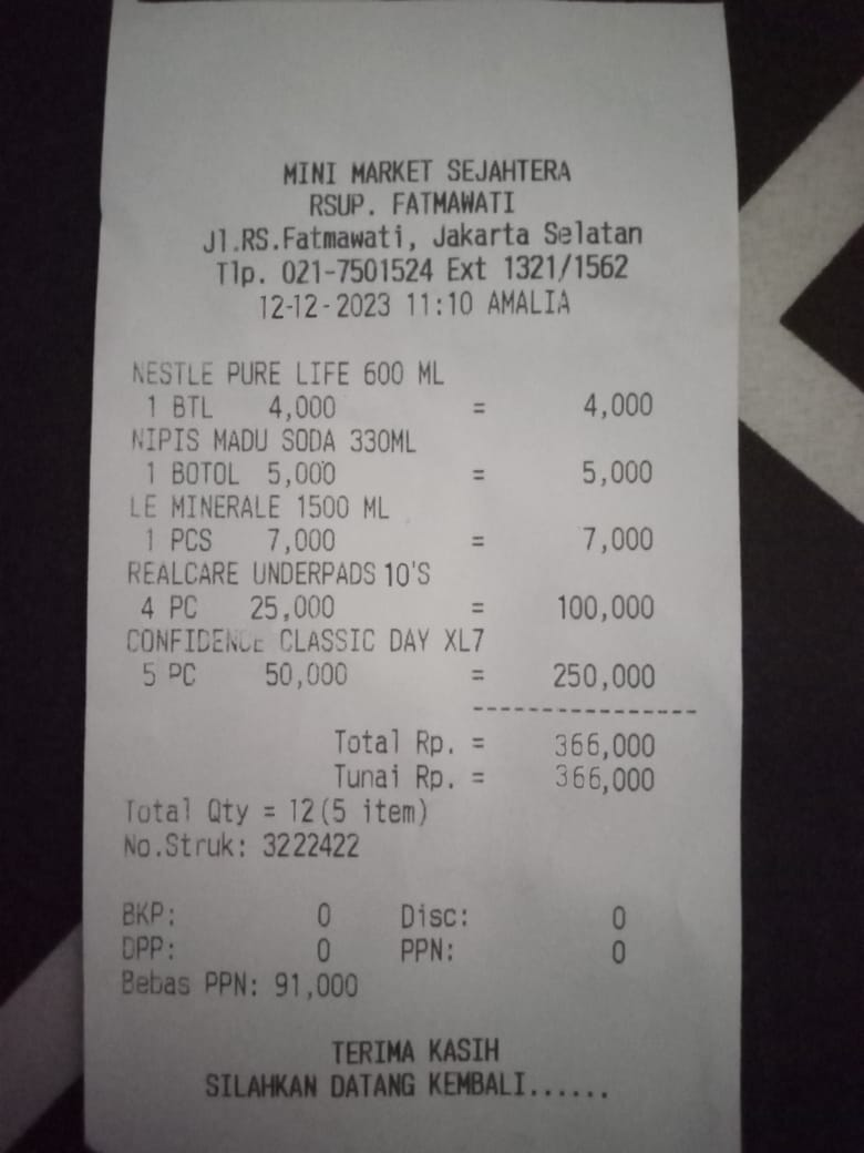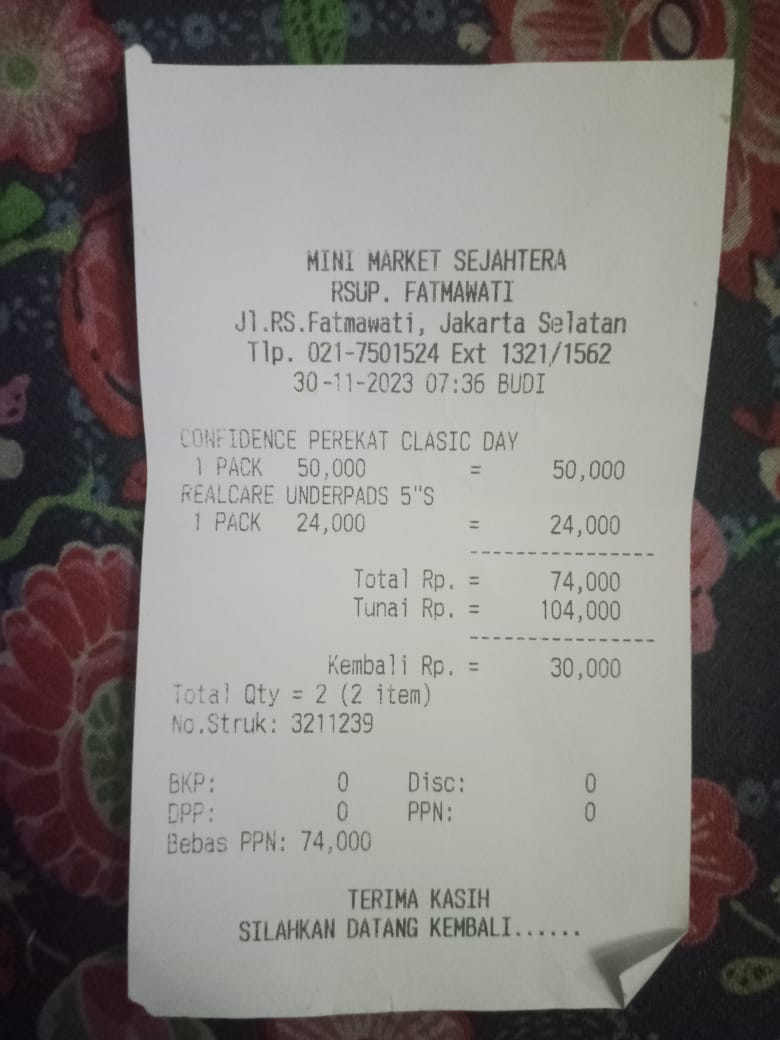 Oya bantuan dari #TemanBaik sudah digunakan untuk membeli 6 popok dan 2 pack underpad untuk keperluanku selama dirawat di rumah sakit.